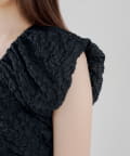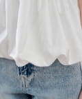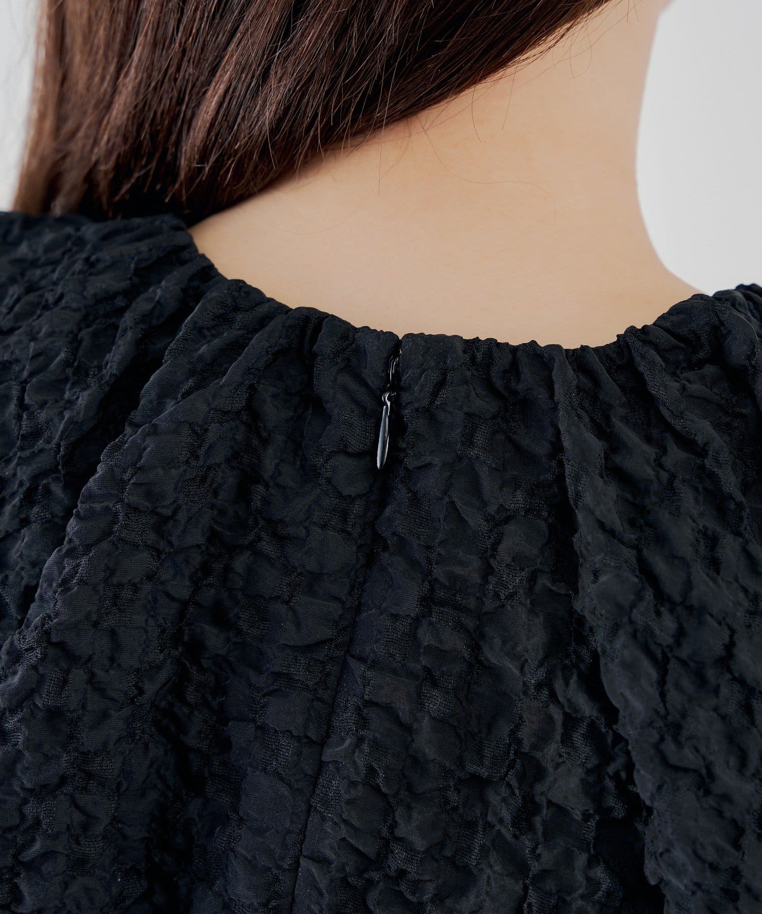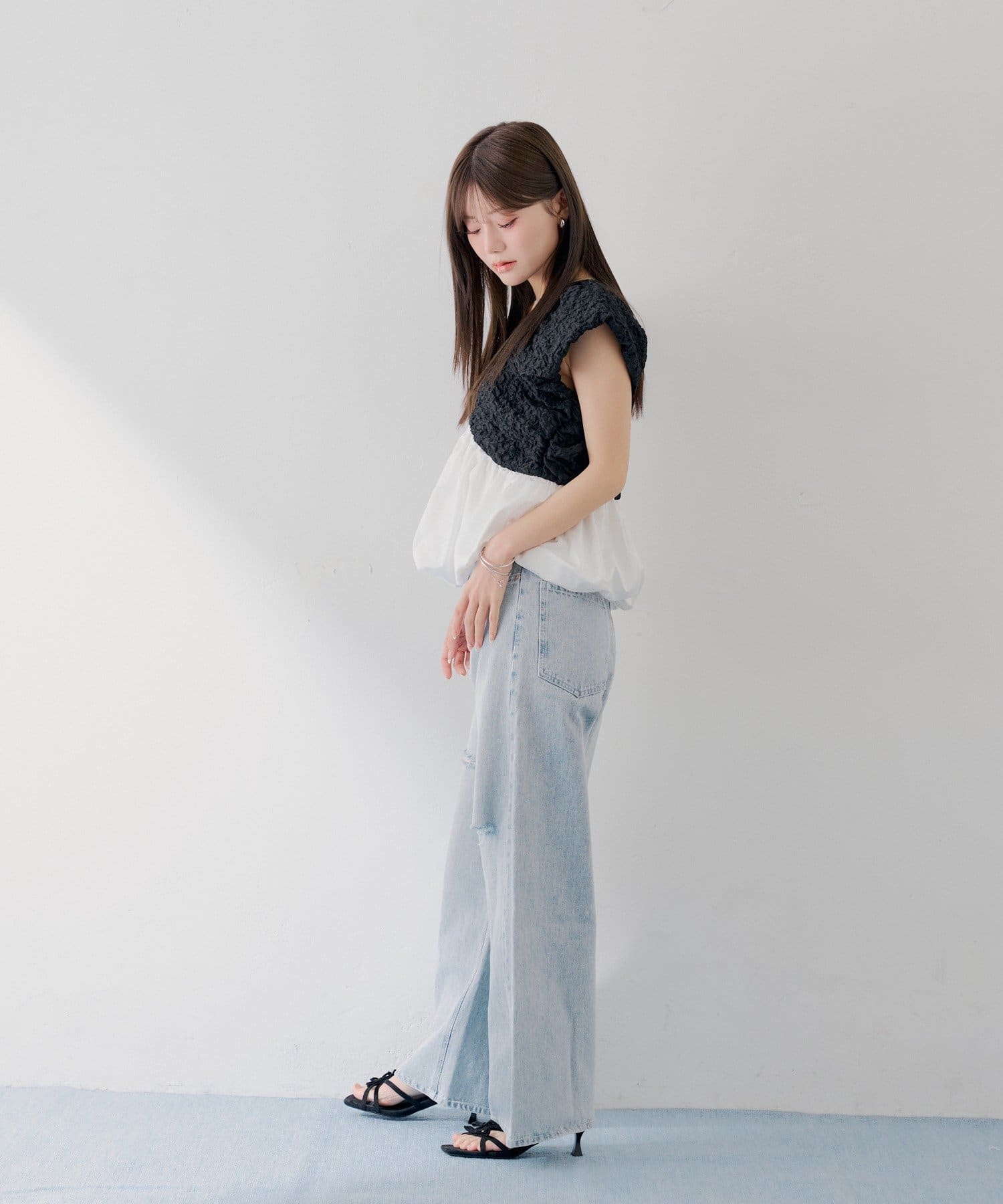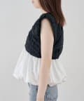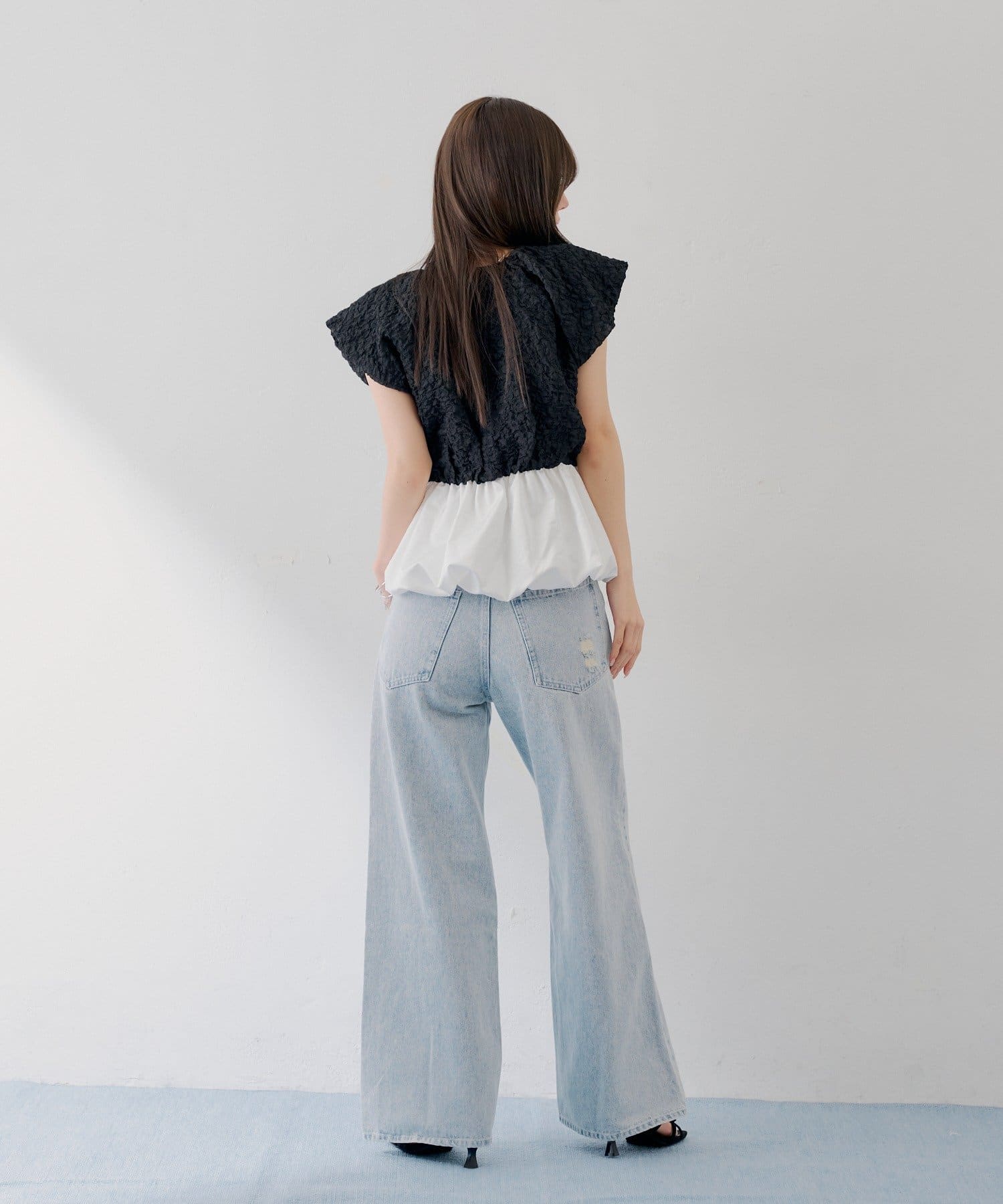 ・表情豊かなクラッシュ加工のブラック素材と、ふわっと広がるホワイトのバルーンシルエットを組み合わせた切り替えデザイントップス。