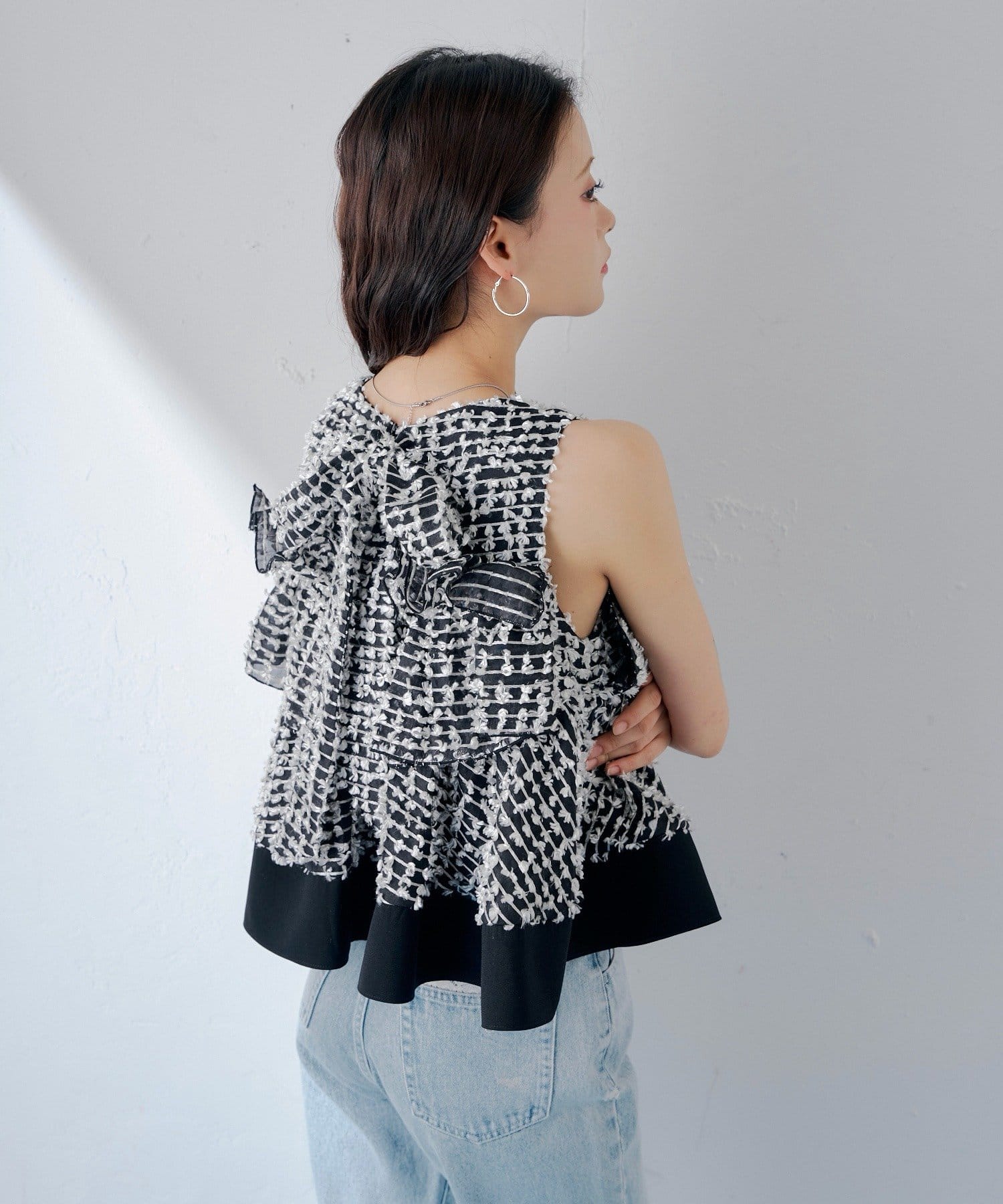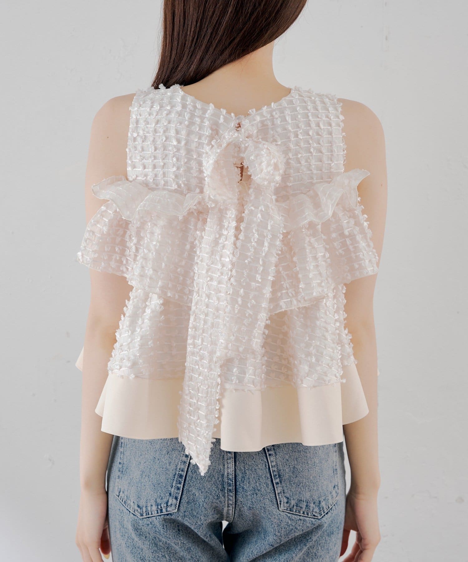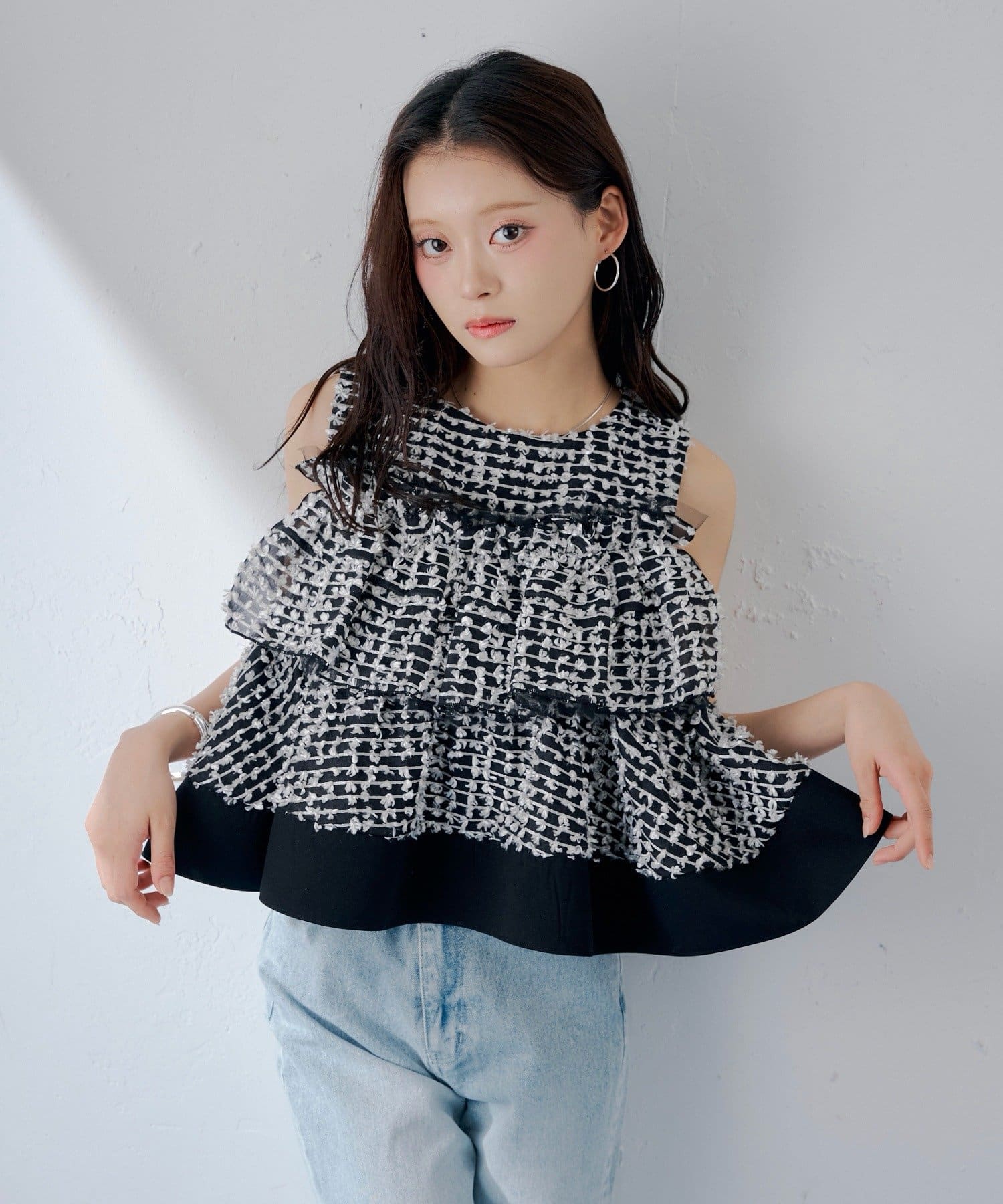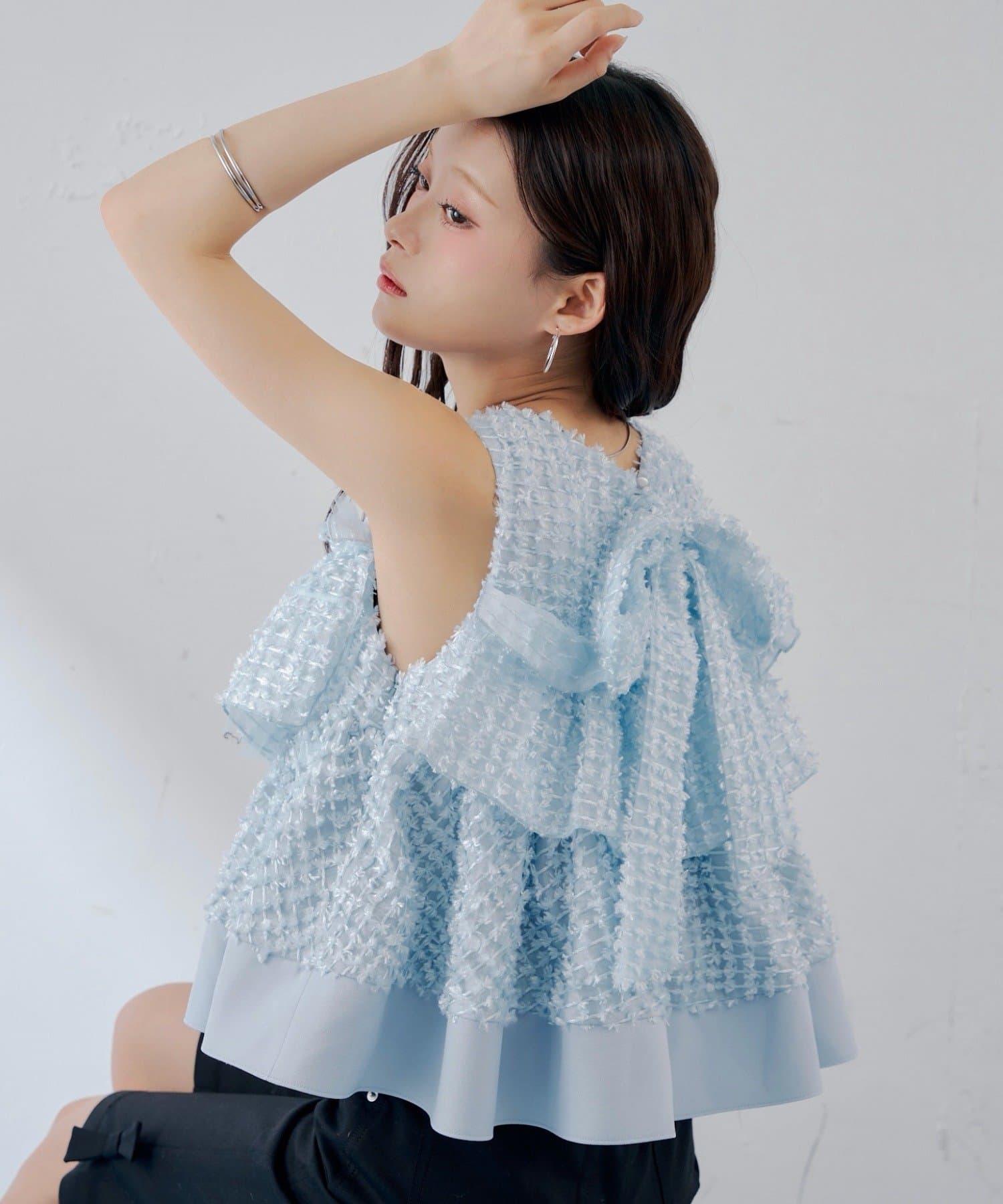 ・フリルを段状に重ねた凹凸シルエットが、華やかさとメリハリを同時に叶えてくれる一枚です