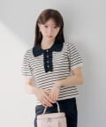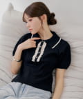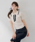 ・襟付きの上品なデザインに、フロントのフリルと配色ラインがアクセントになった半袖ニットトップス。