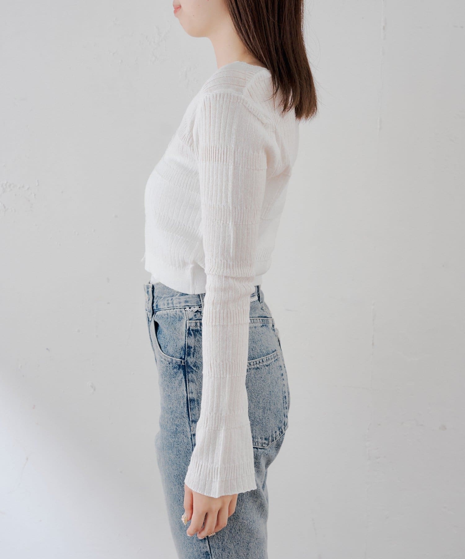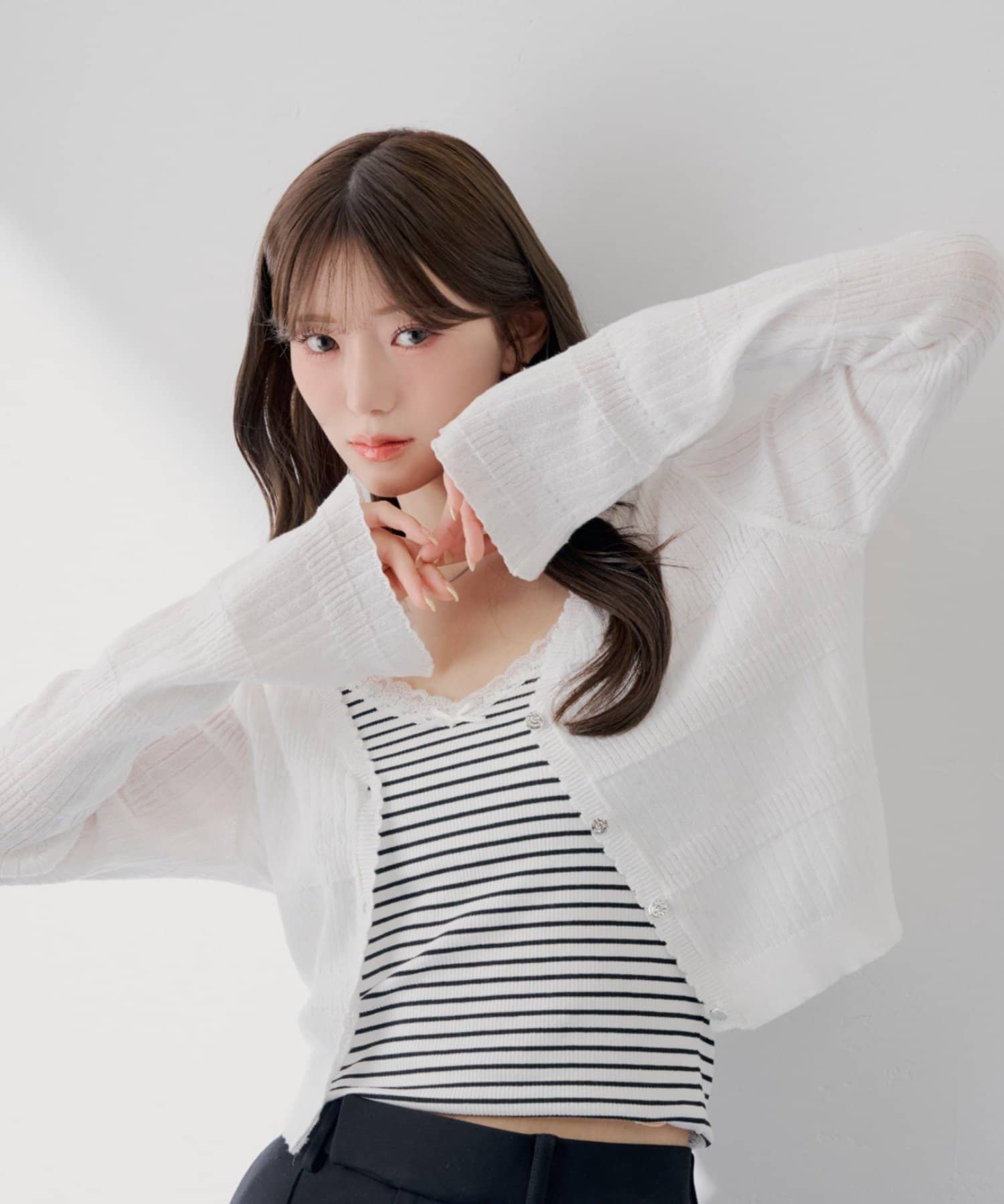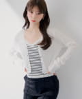 ・中にボーダーなど柄物やキャミを合わせると、カーディガンの透け感が活きて奥行きのあるコーデに。