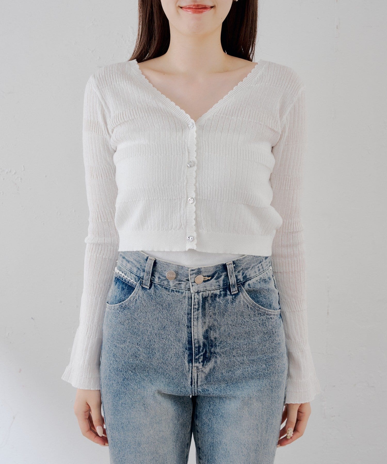・ふんわり軽い透け感が女性らしい、シアー素材のVネックカーディガン。
