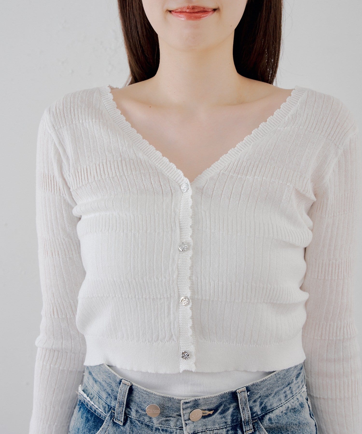 • Chico(チコ) 【SALON by Chico】シアー金釦柄編みカーディガン