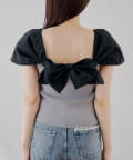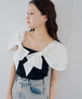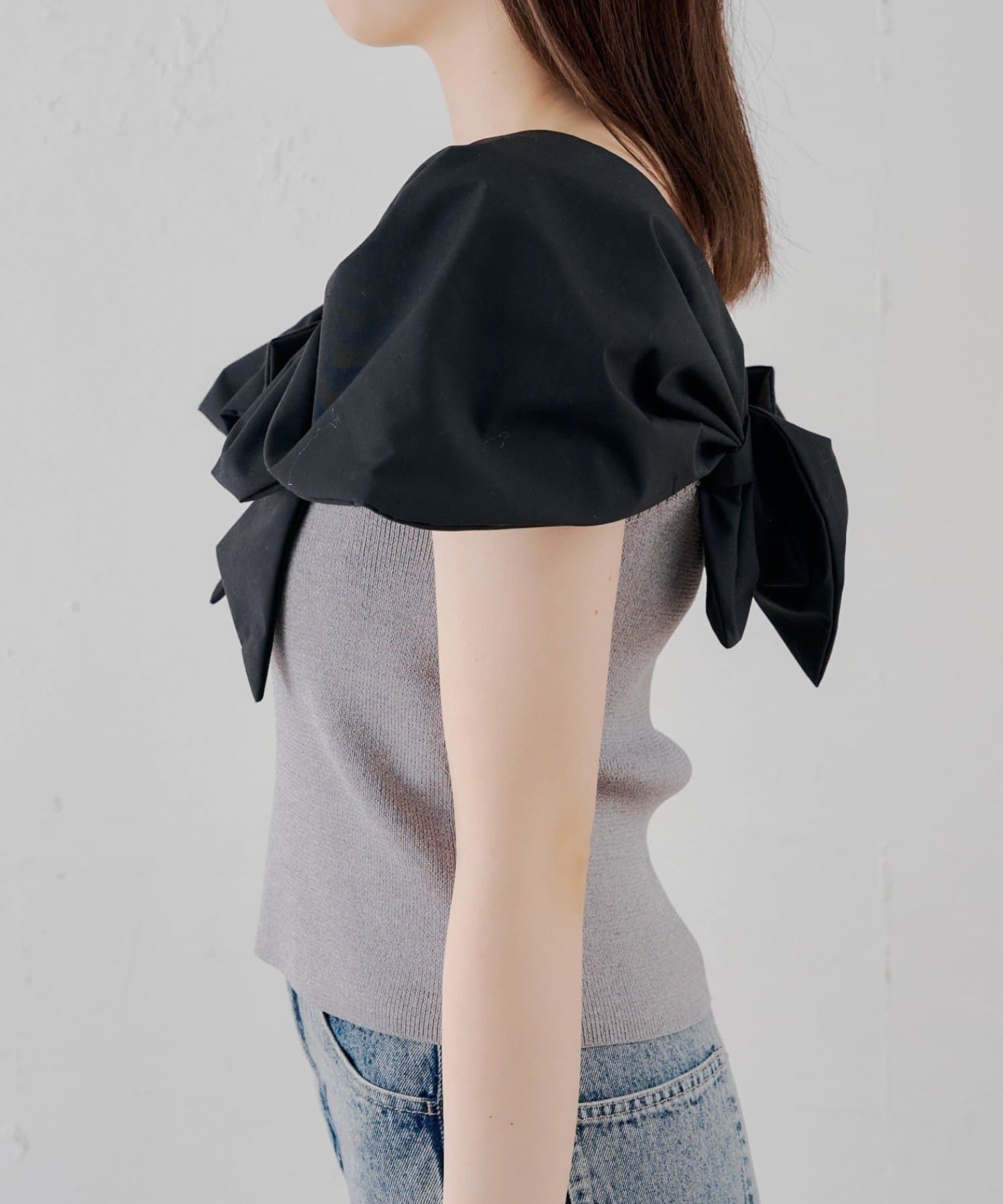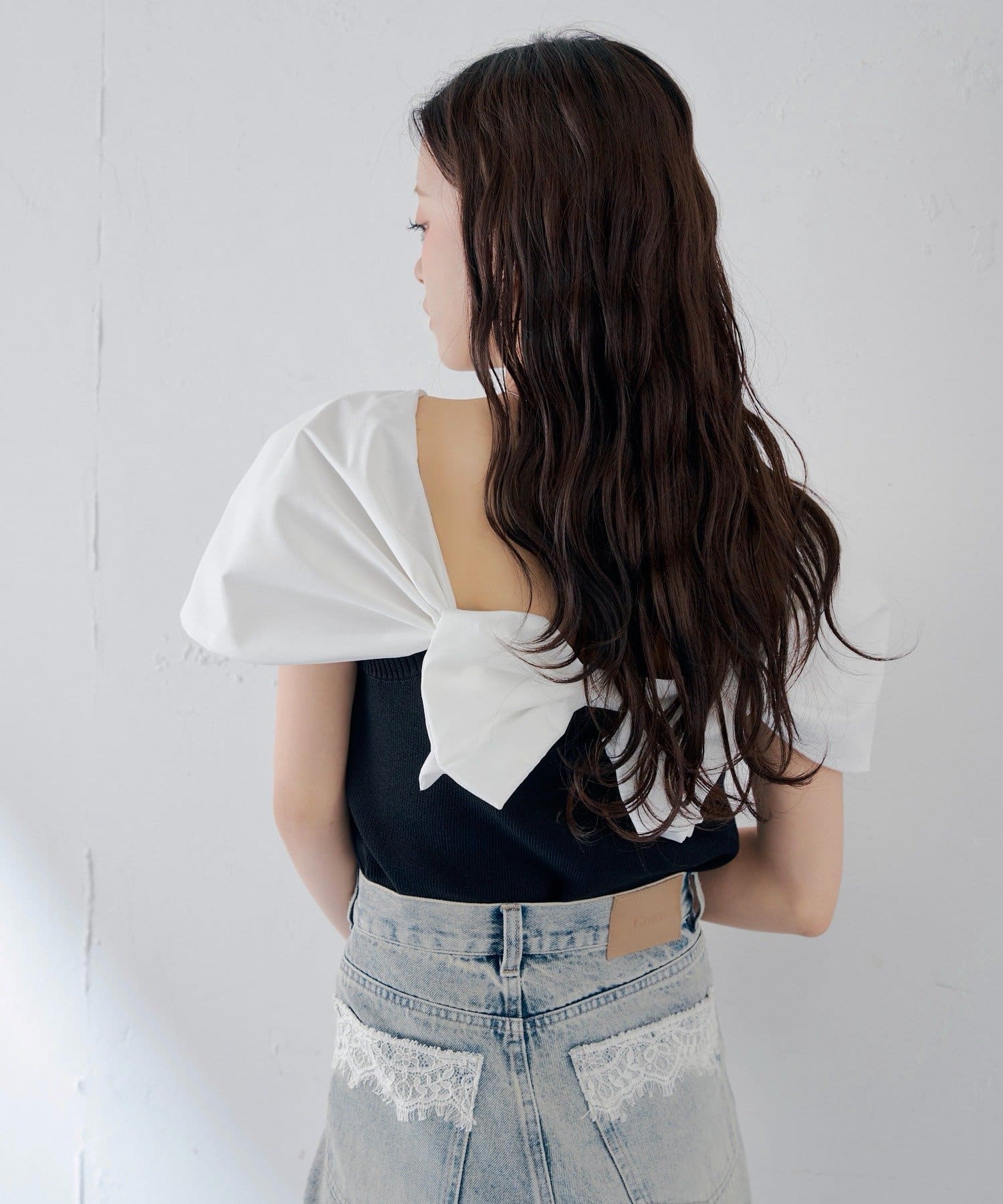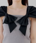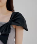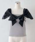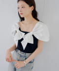 肩から胸元にかけてあしらわれた、大胆で立体的なホワイトリボンが最大の魅力。
