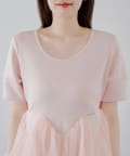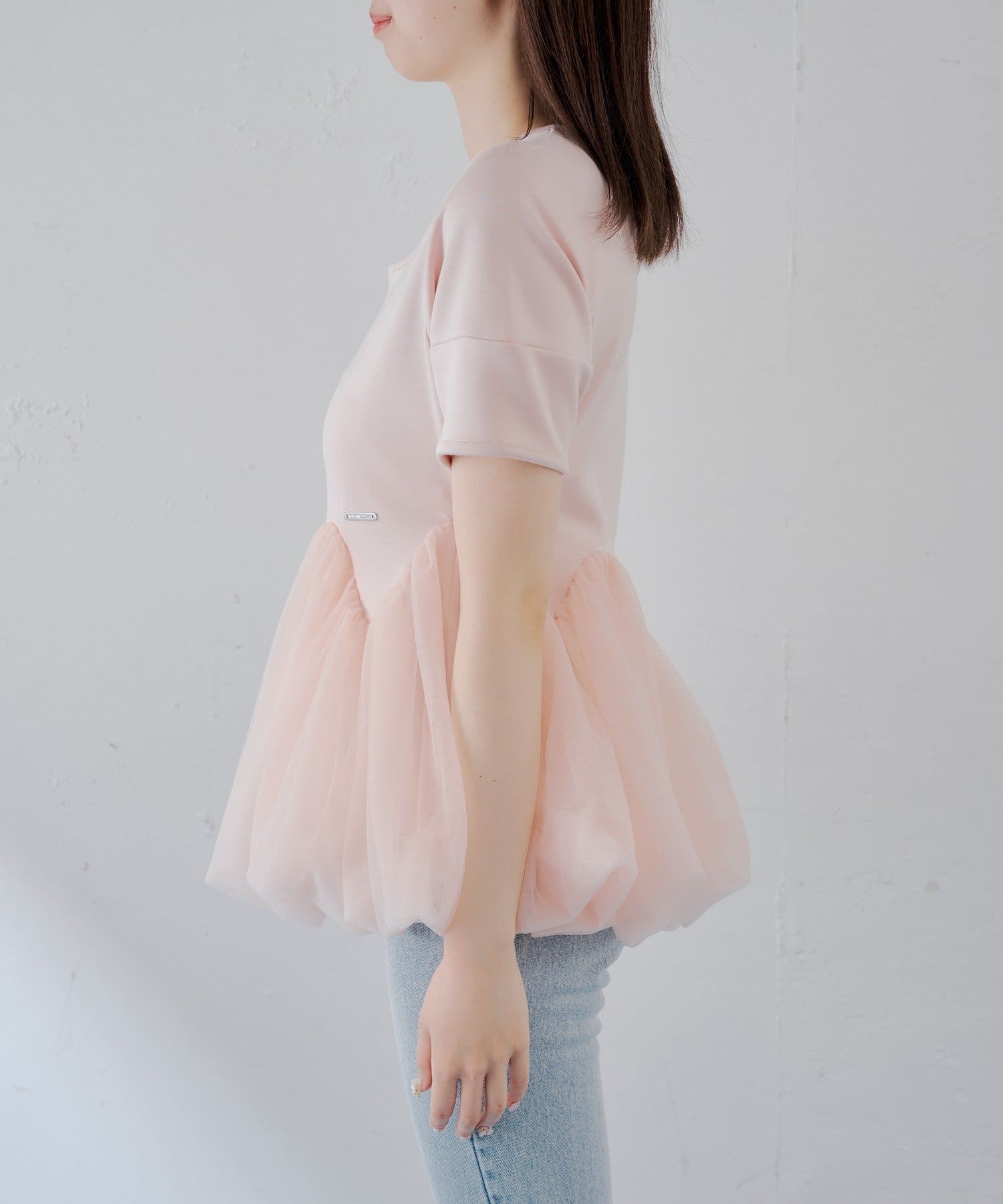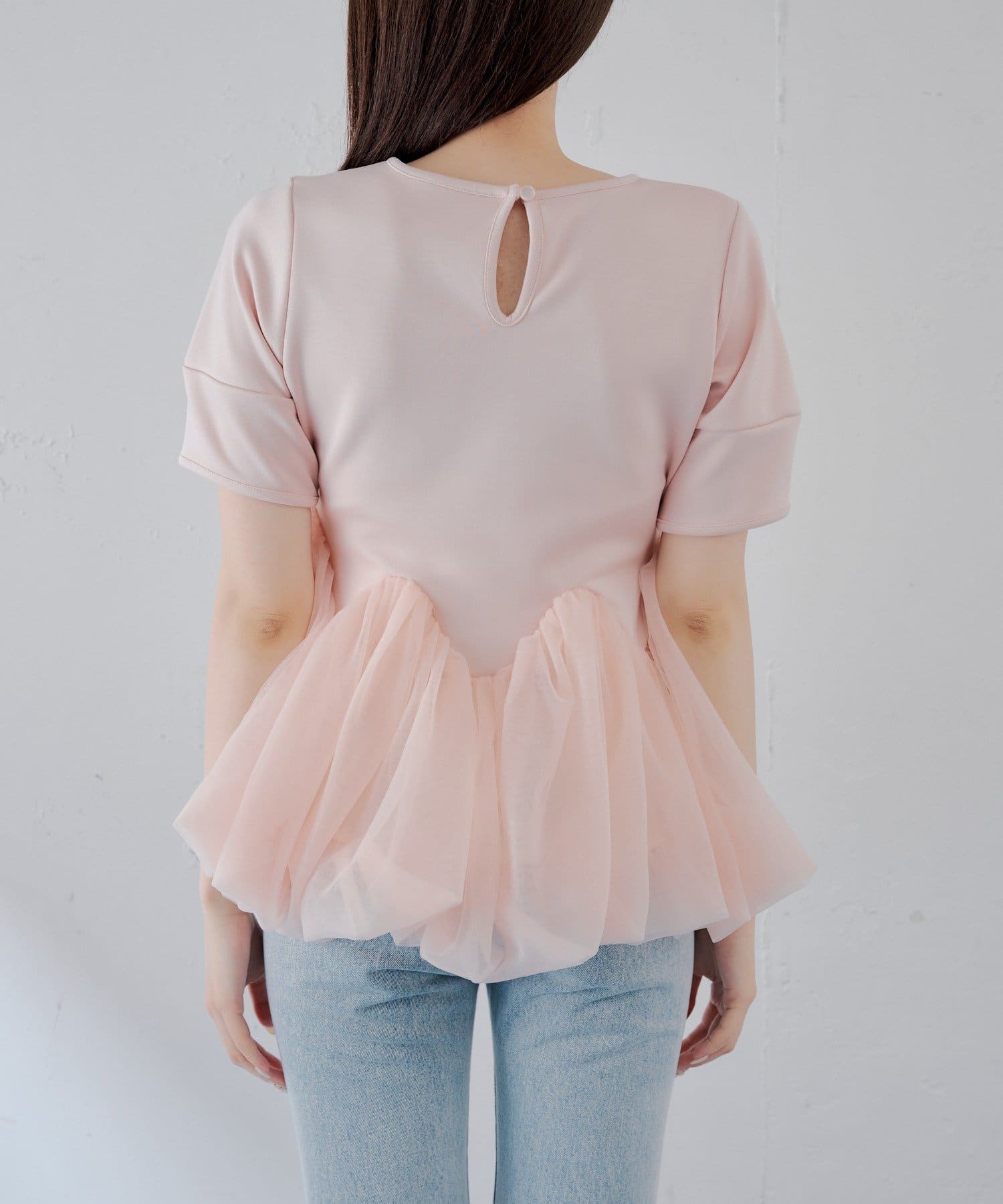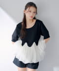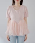 ・軽やかなチュールをドッキングしたペプラムトップス。