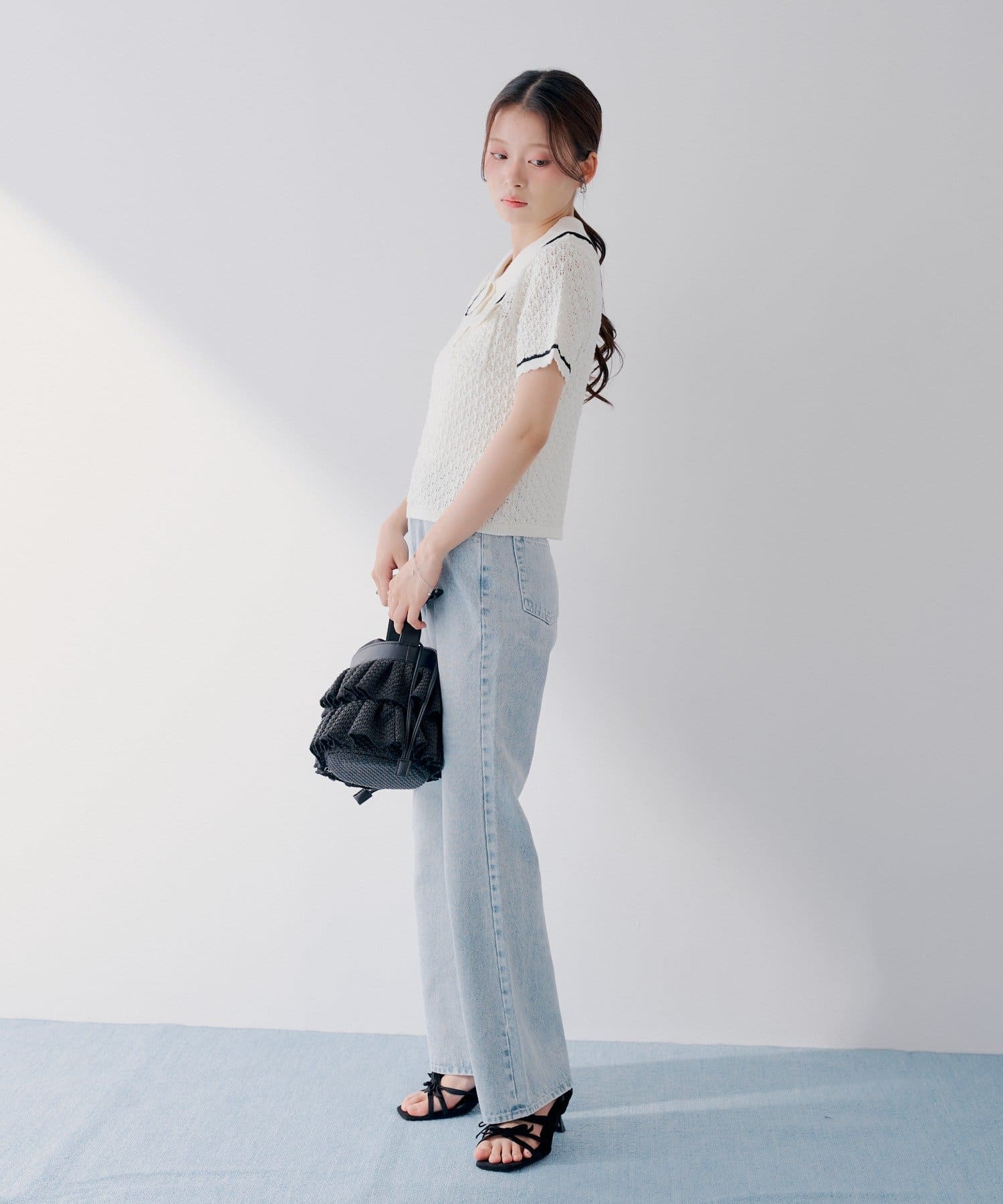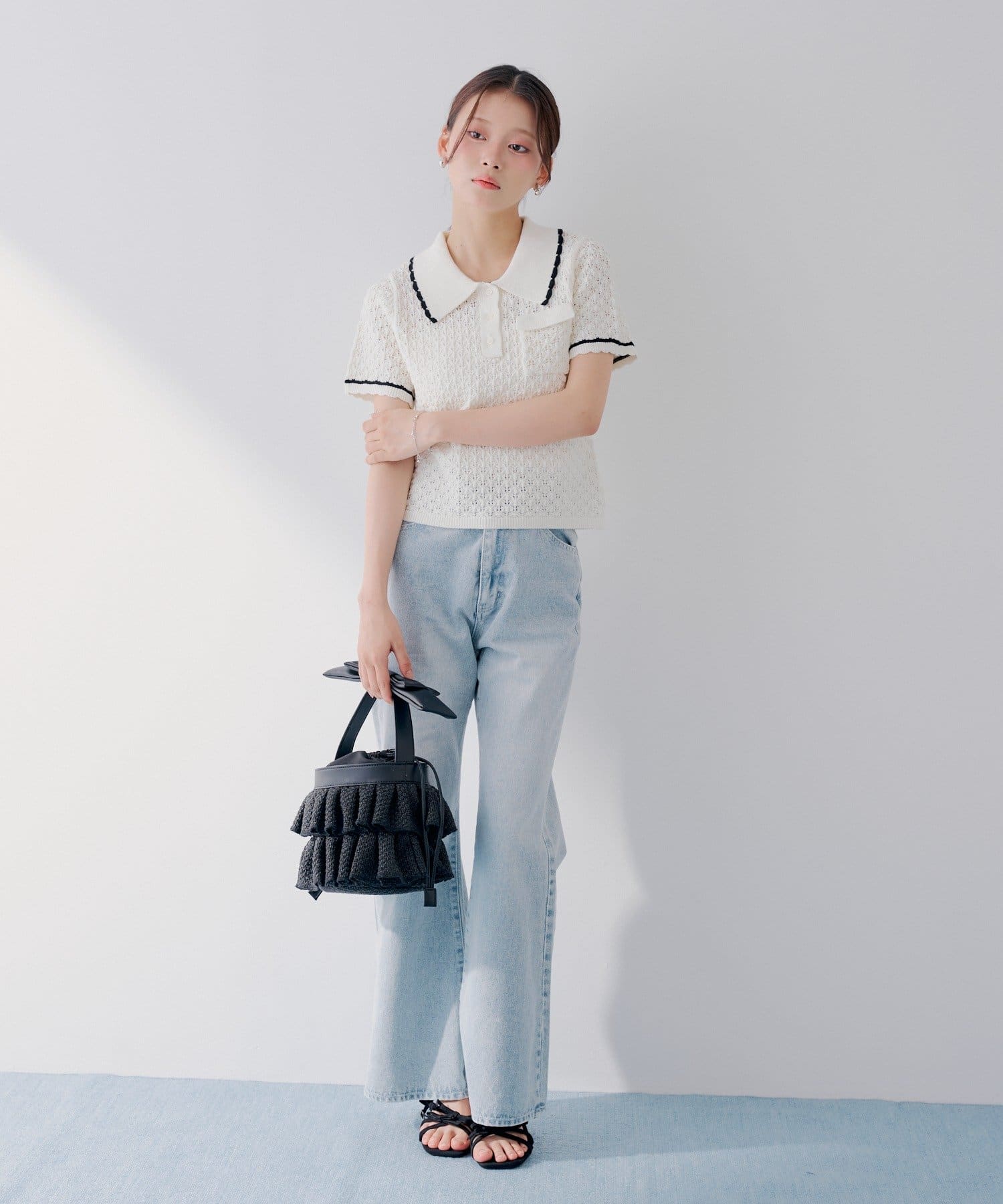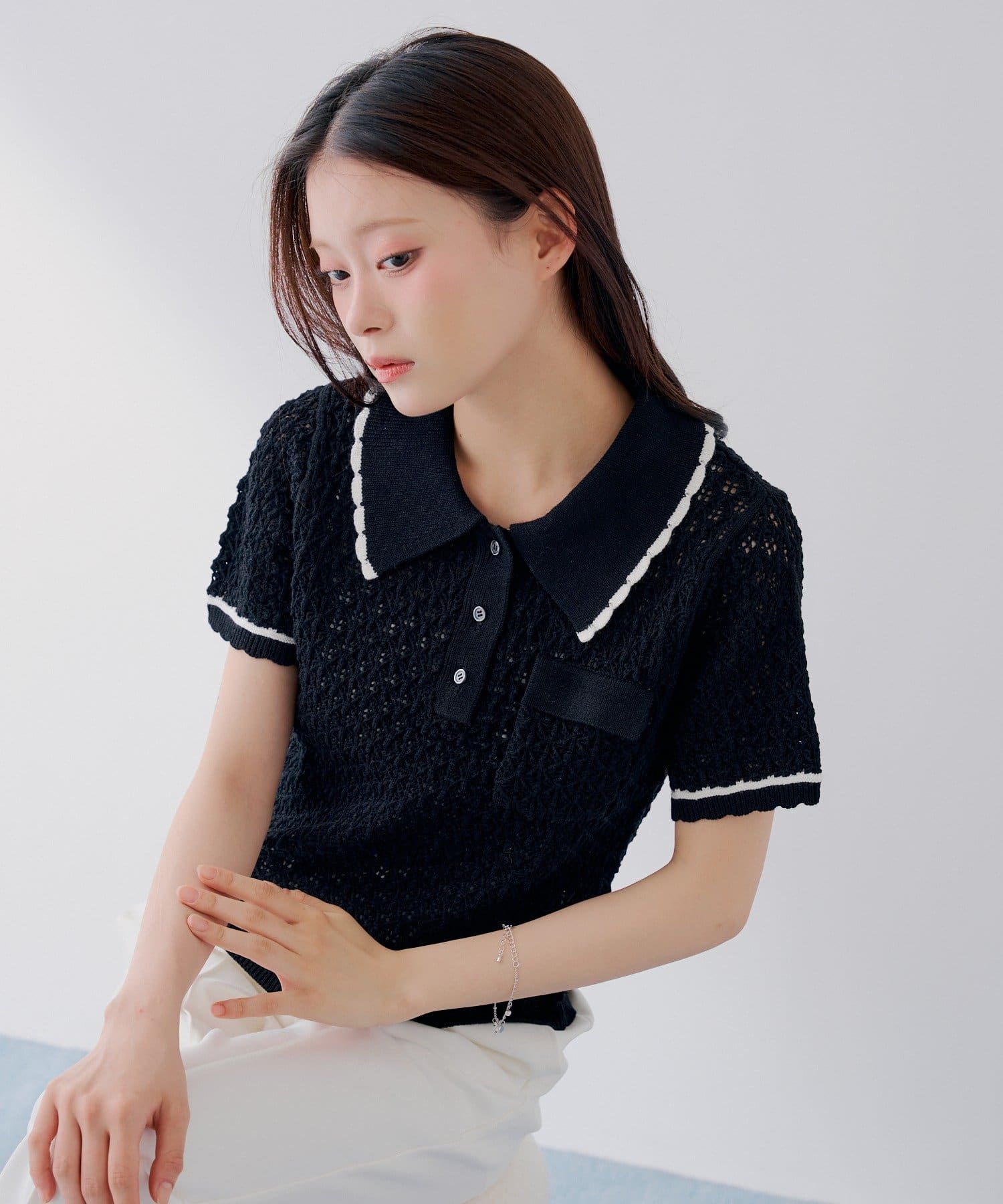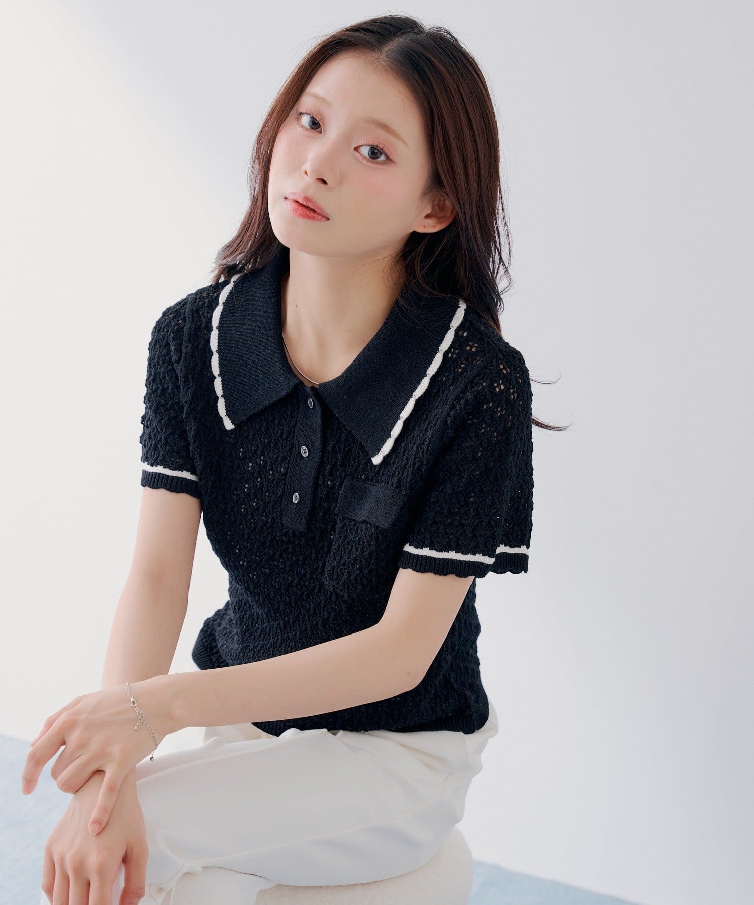 ・透かし編みのニット素材で、軽やかさと抜け感のある一枚