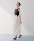 ドビー素材のスカートとニットのドッキングが目を惹く、