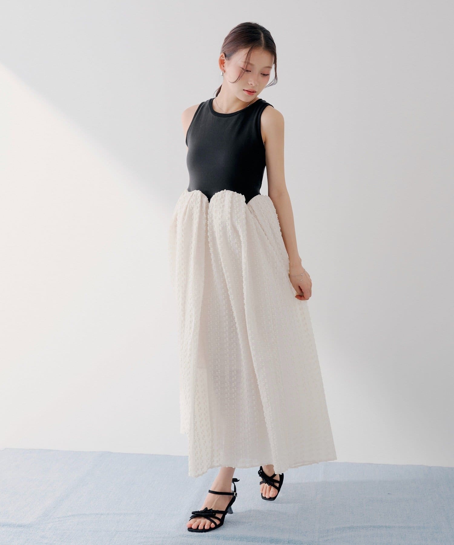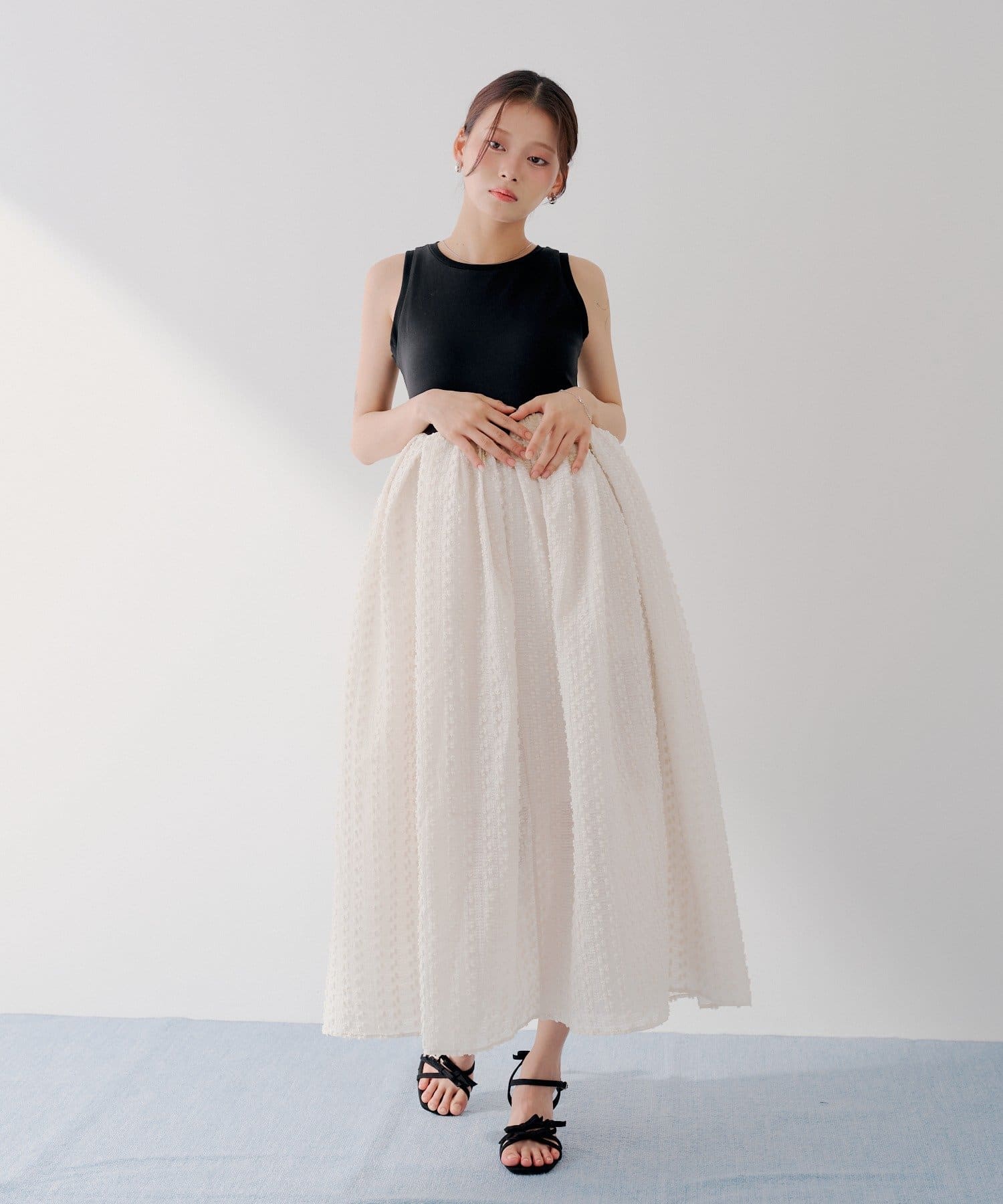・華奢なサンダル合わせで、女性らしく抜け感のあるスタイルに。カーディガンやシアーシャツを羽織って、季節の変わり目にもご着用いただけます。