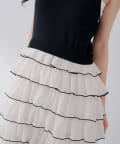 ・ティアードデザインが華やかで、配色のパイピングが甘さを引き締め上品なアクセントをプラス