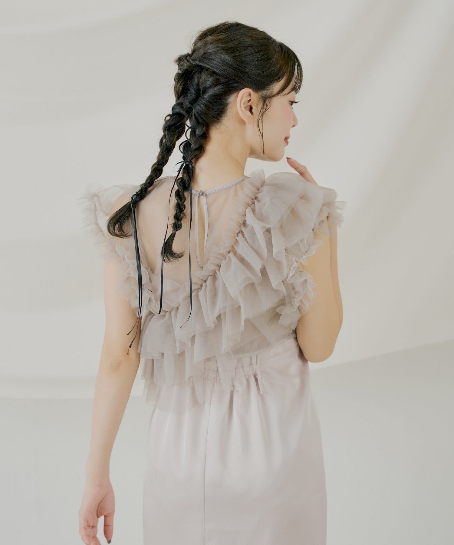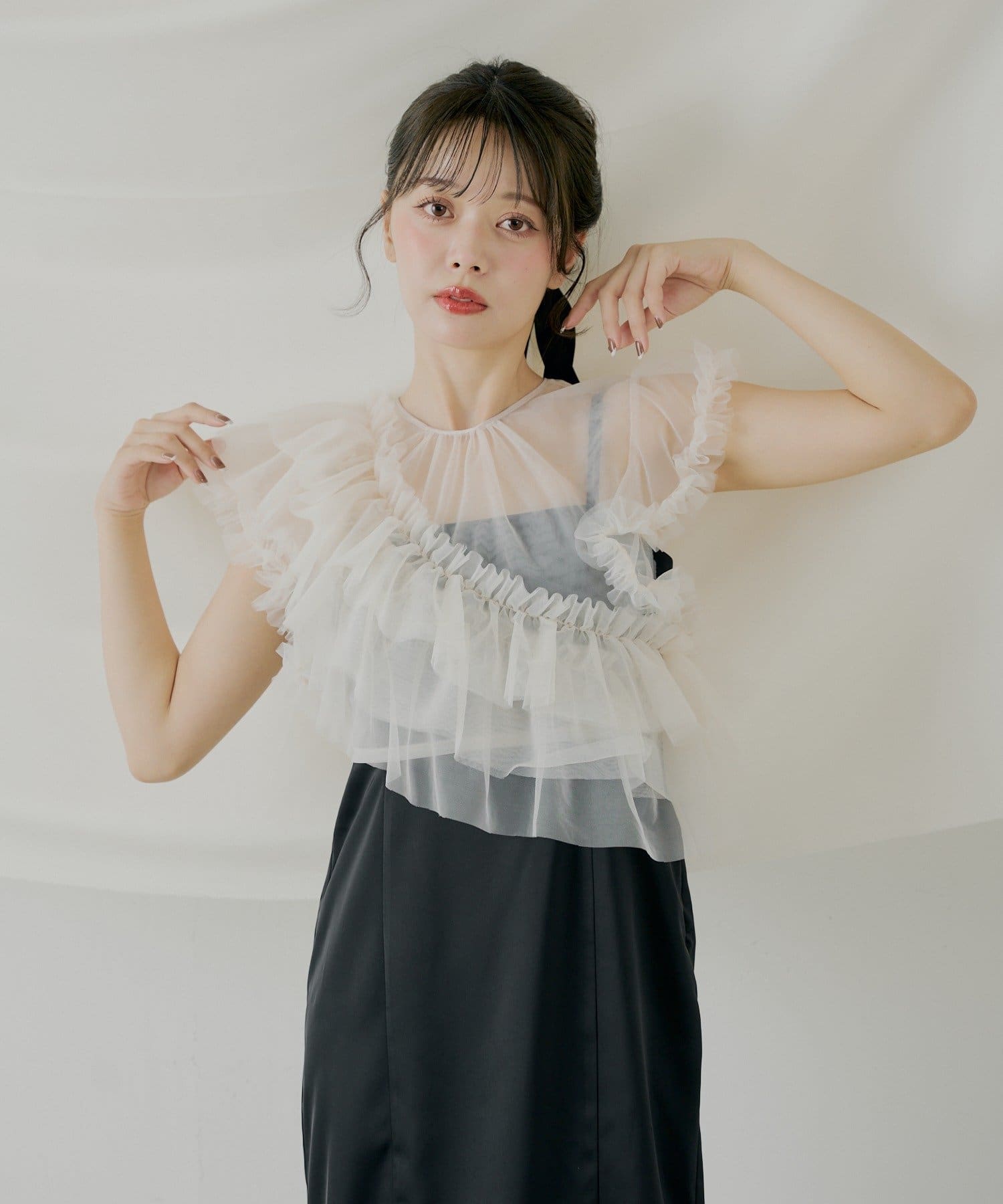 ・シアーなフリルトップスとキャミワンピースの組み合わせで、奥行きのあるスタイリングに。