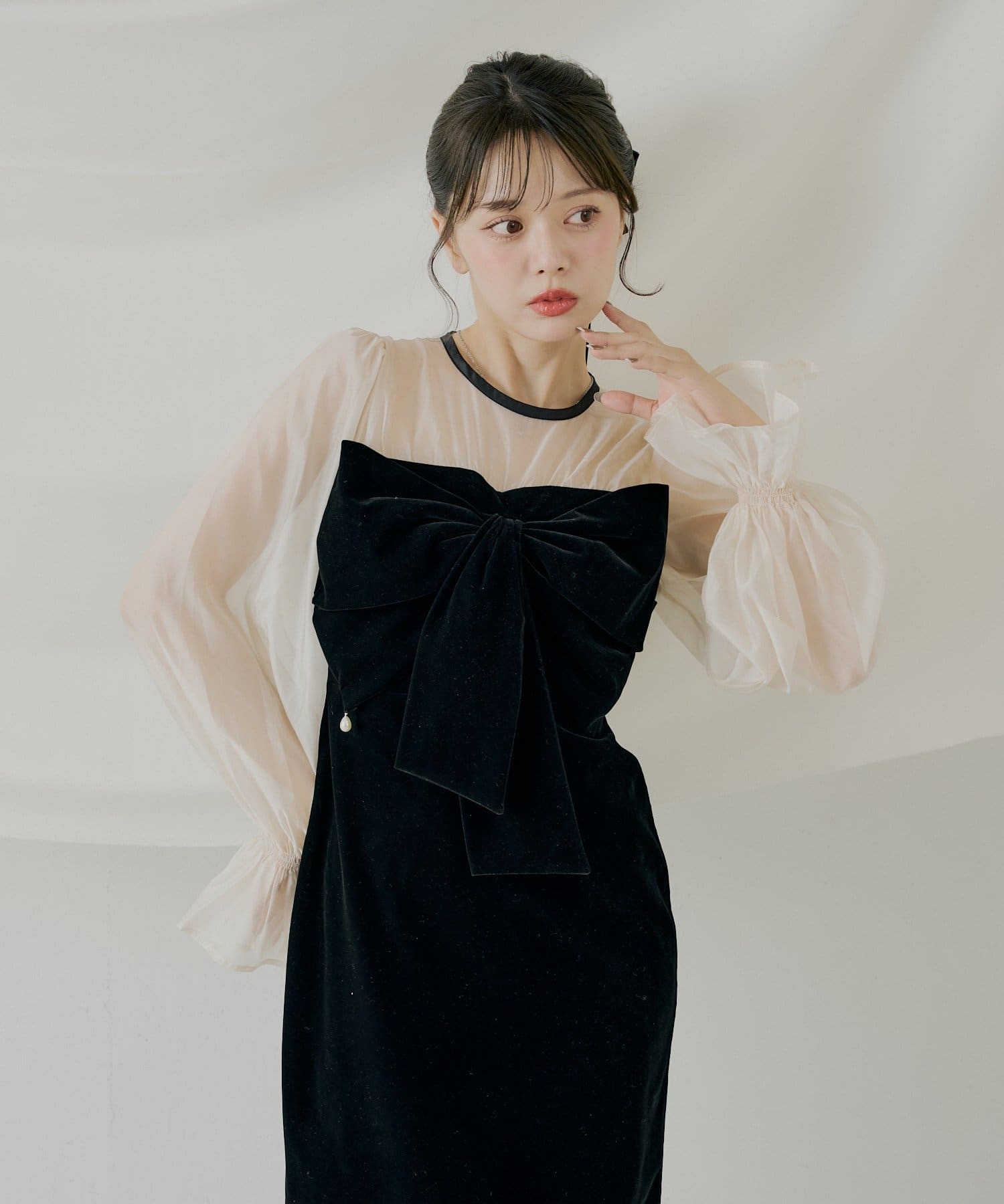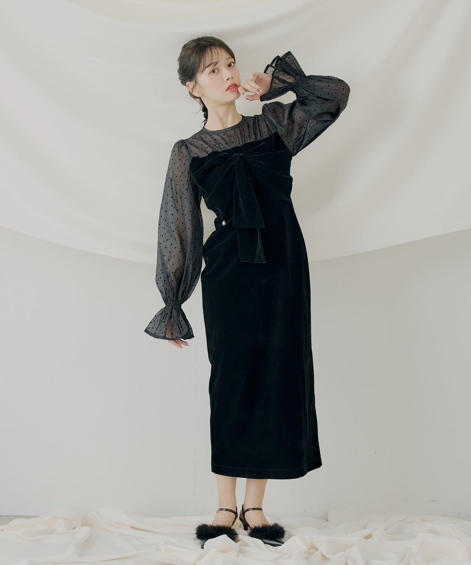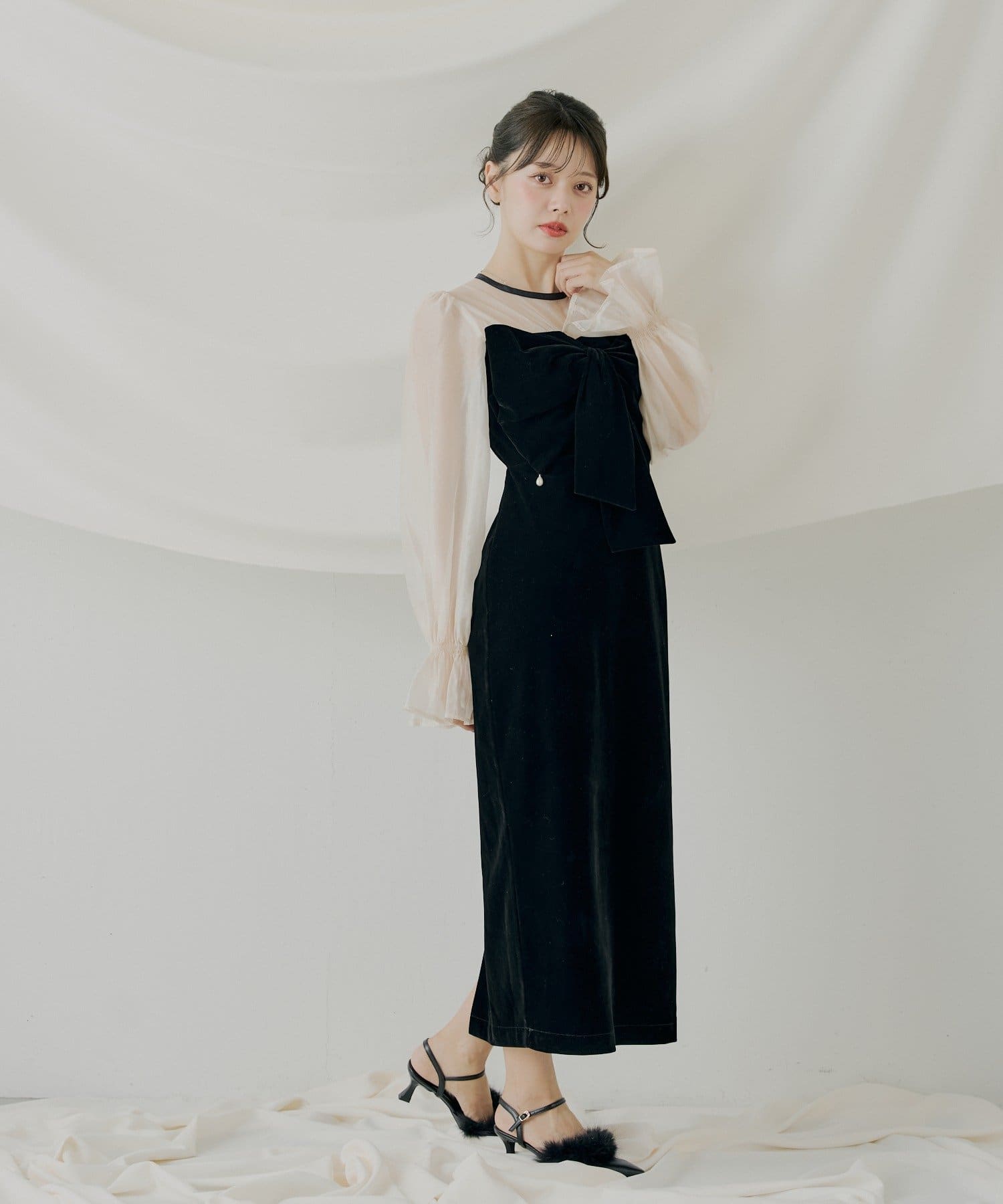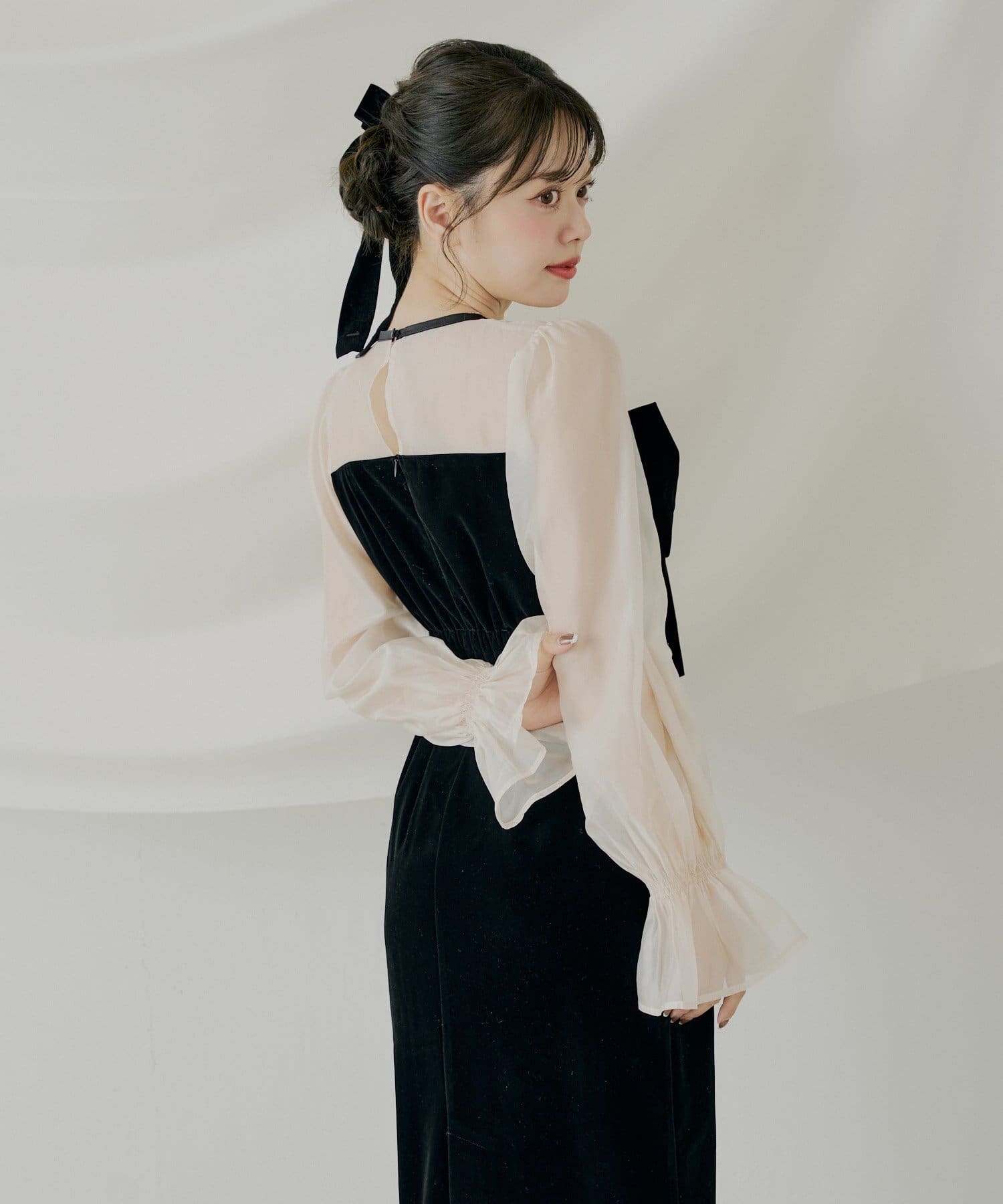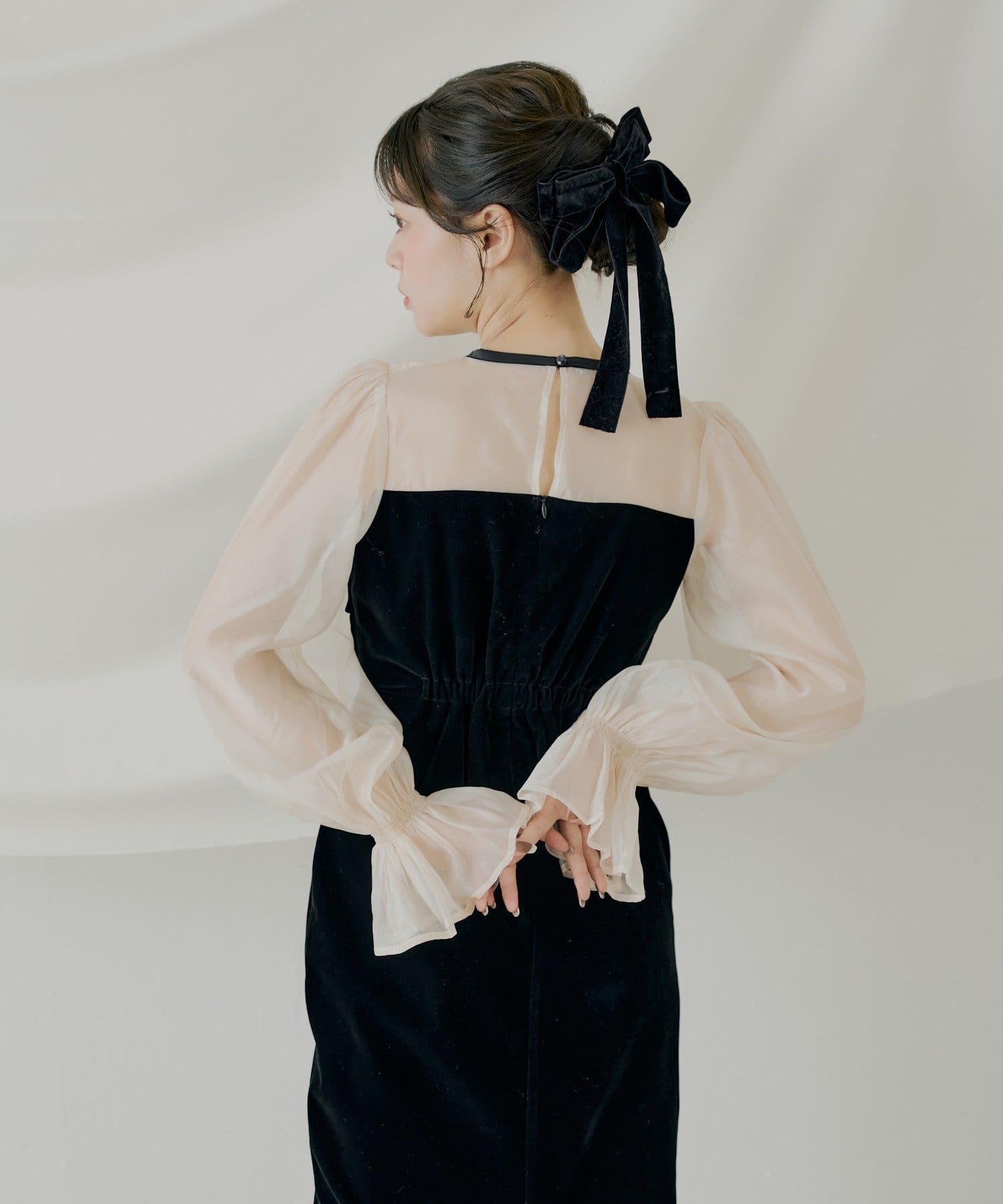繊細なシアー素材と上品なベロアが大人の女性らしさを引き立てるオケージョンワンピース!