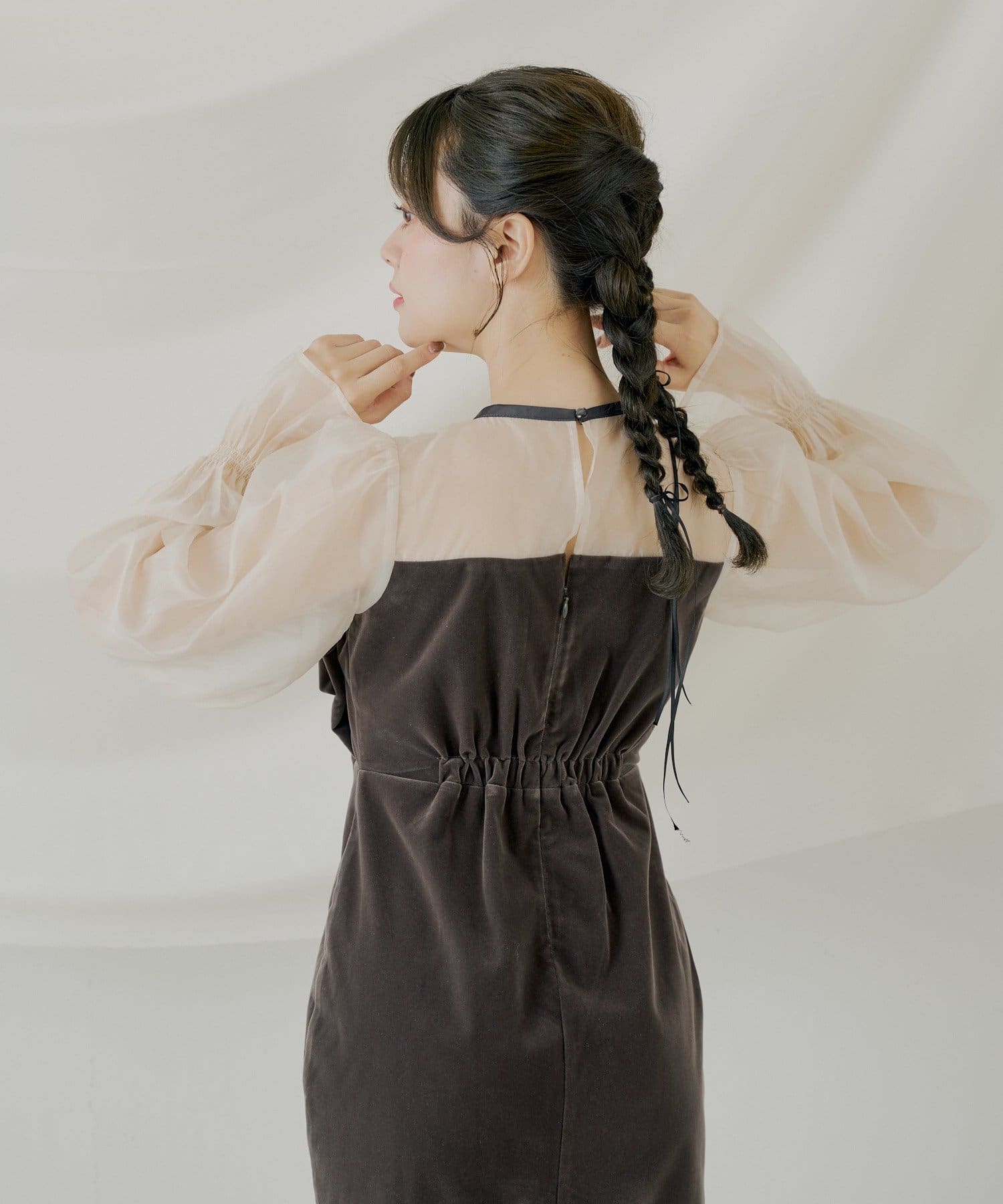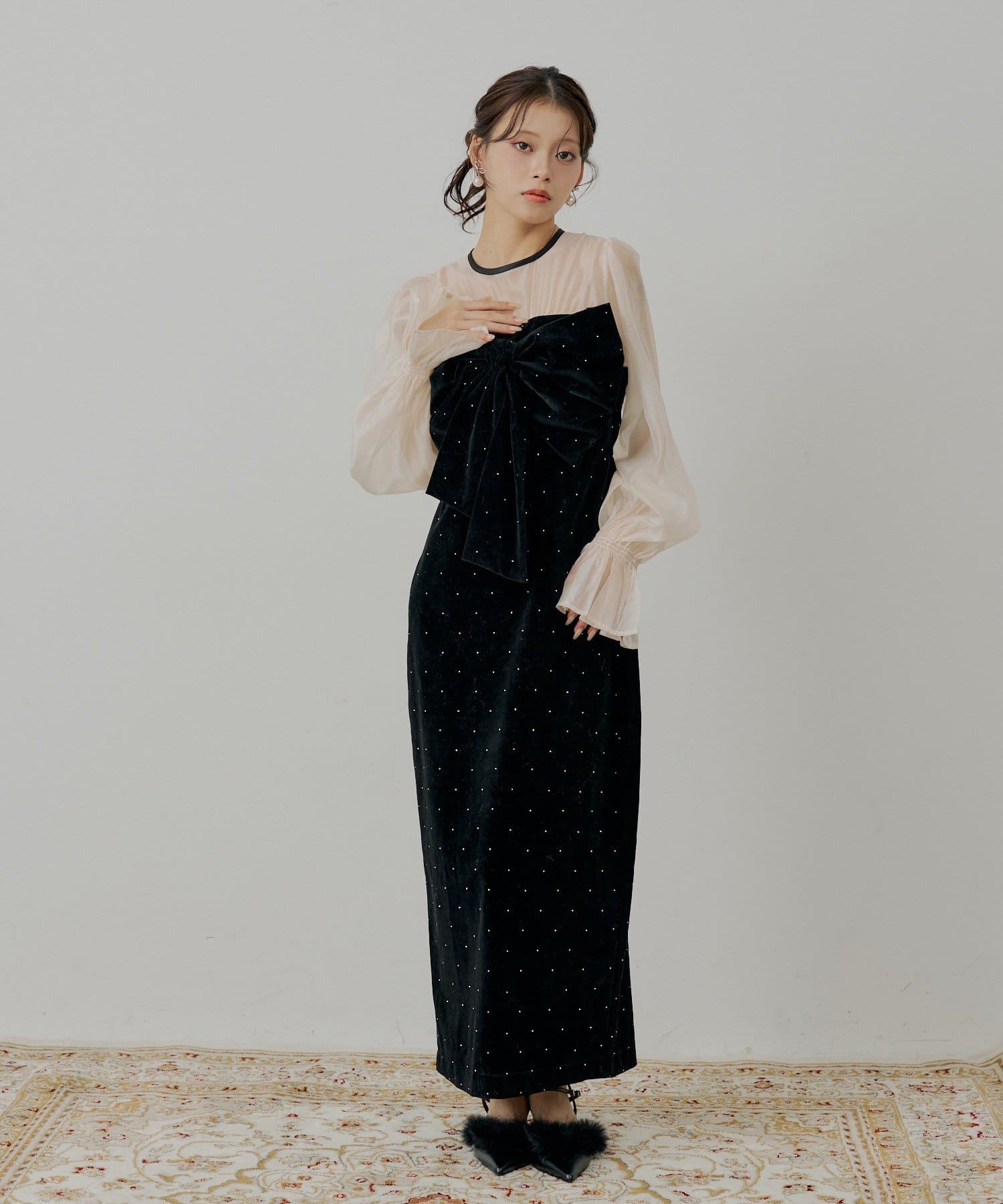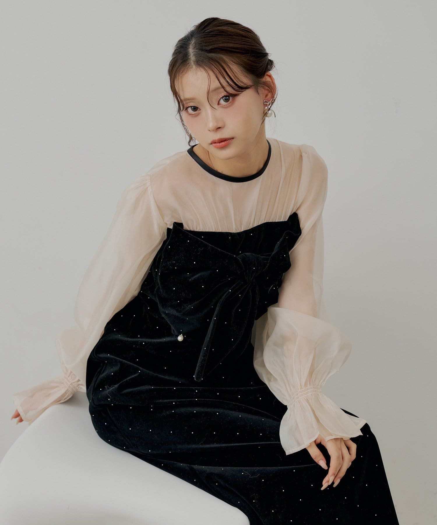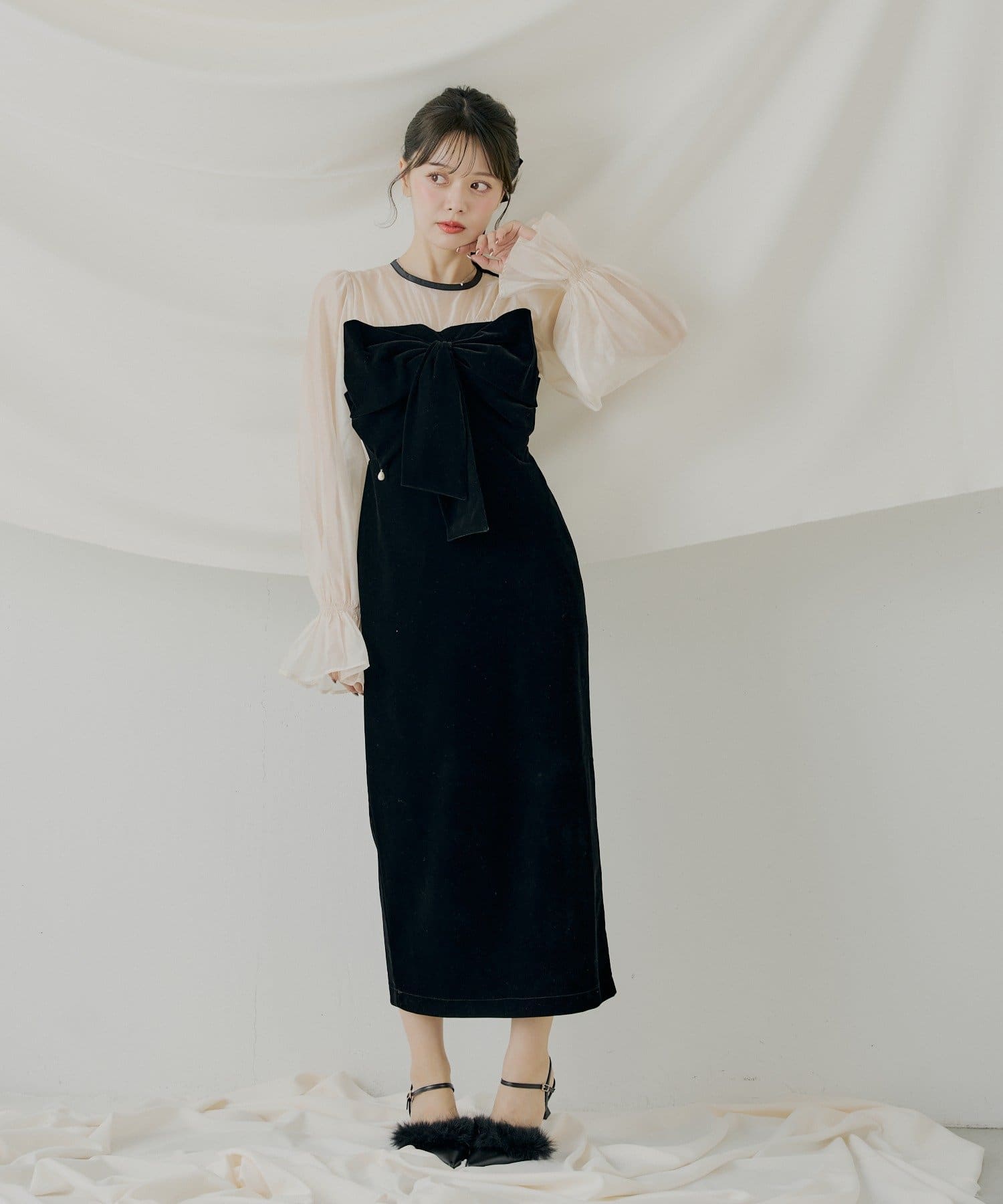 繊細なシアー素材と上品なベロアが大人の女性らしさを引き立てるオケージョンワンピース!