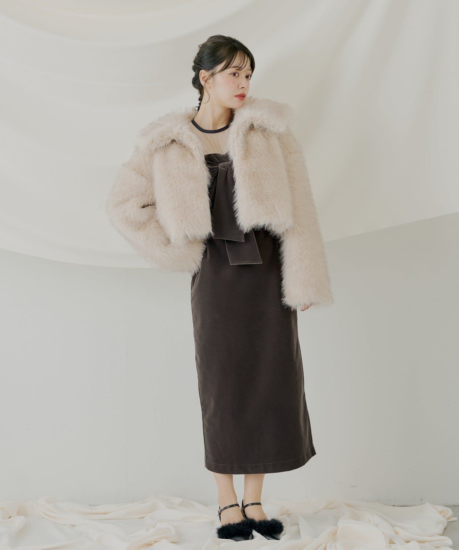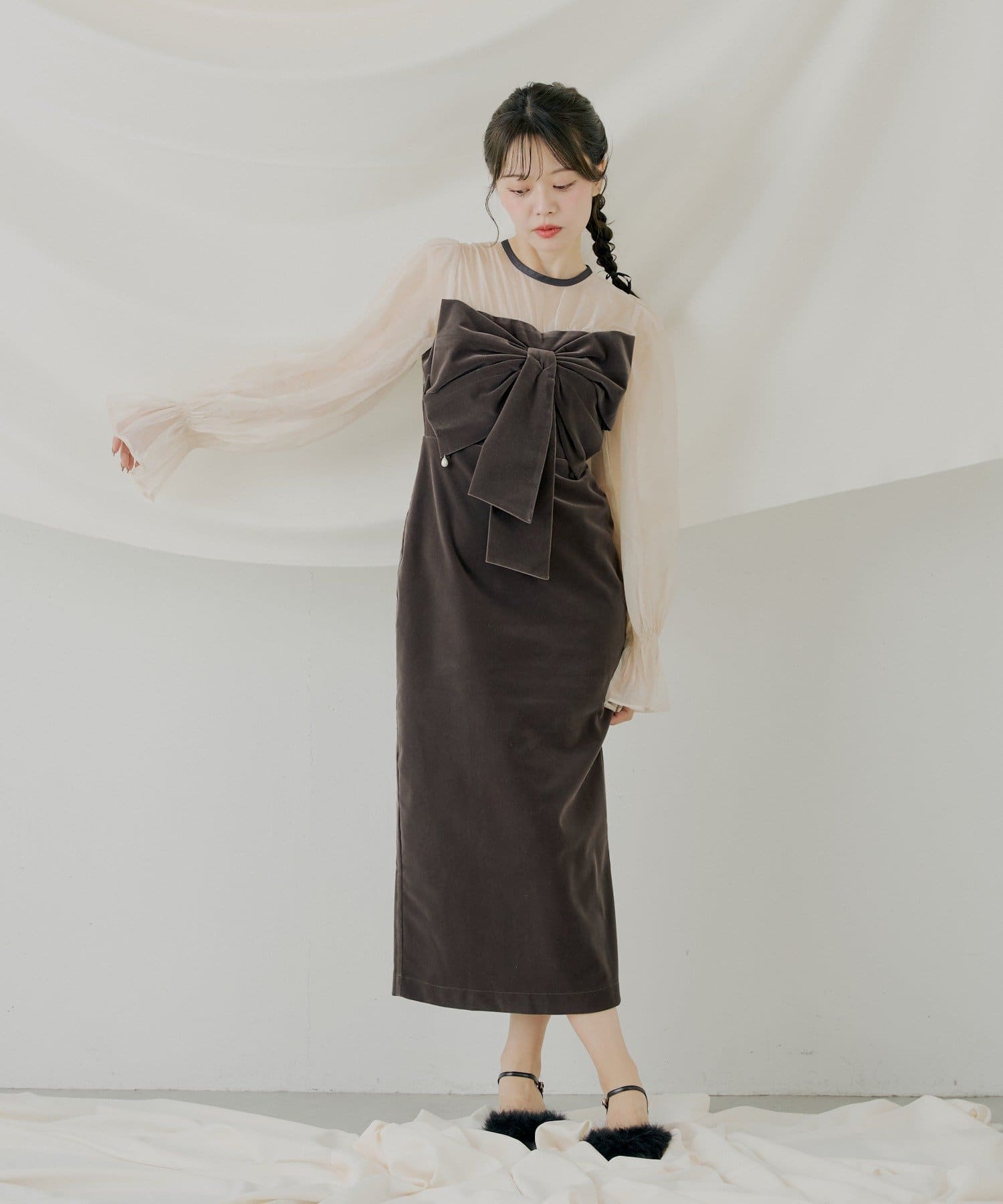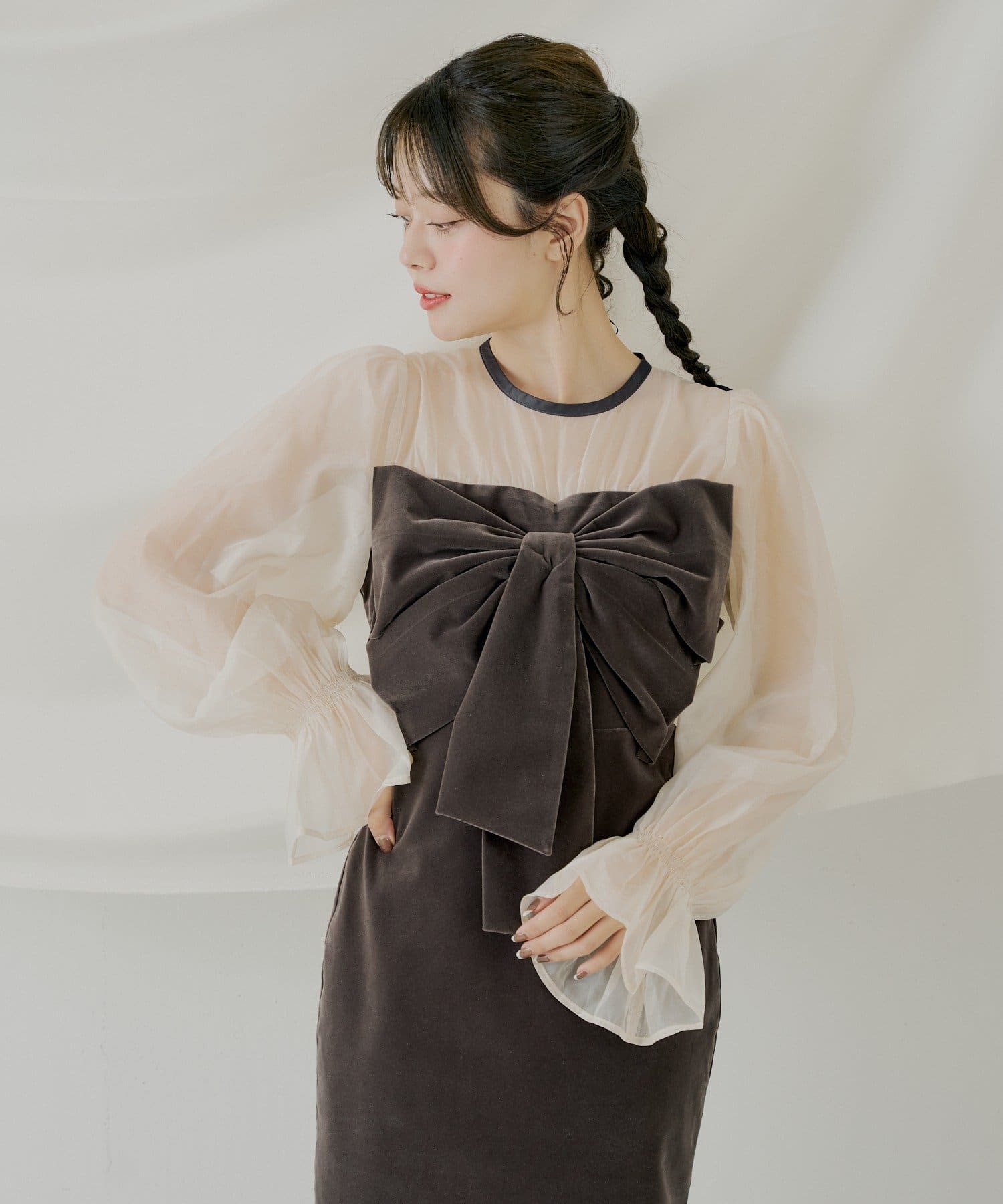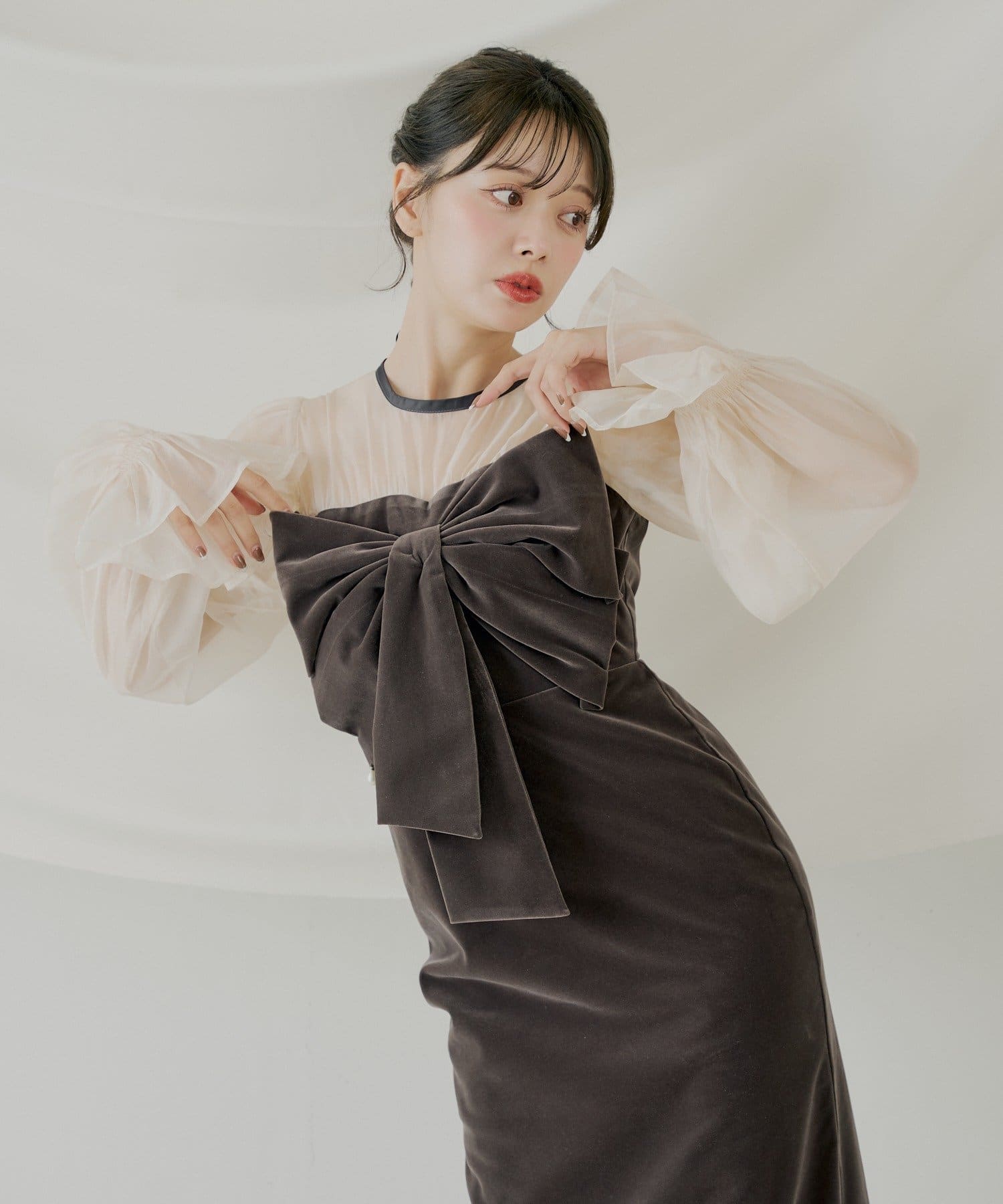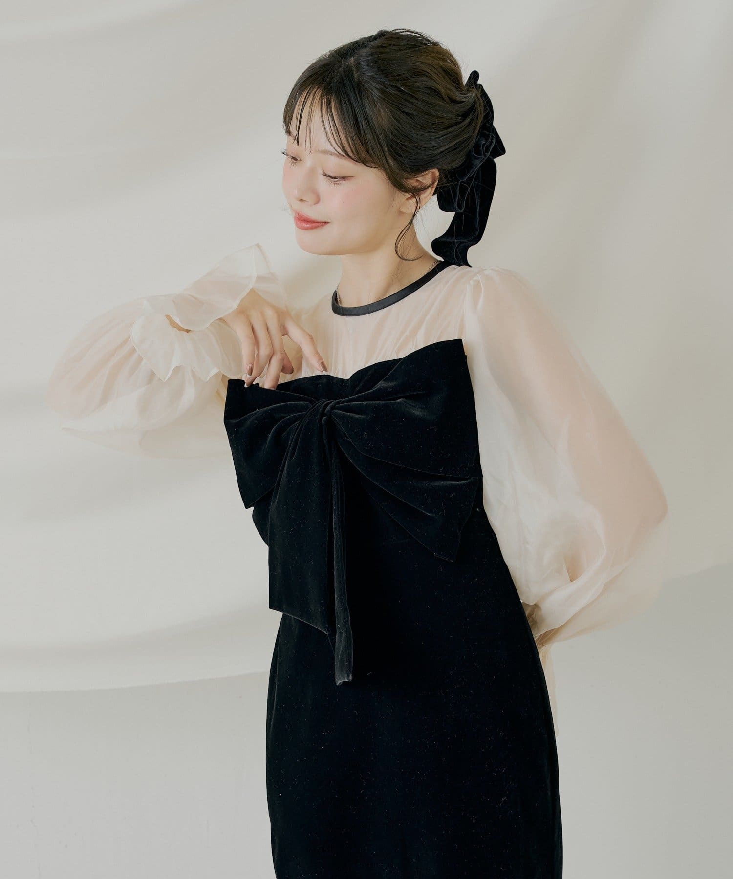 ・胸元の大きなリボンが、クラシカルでレディな雰囲気を演出します。