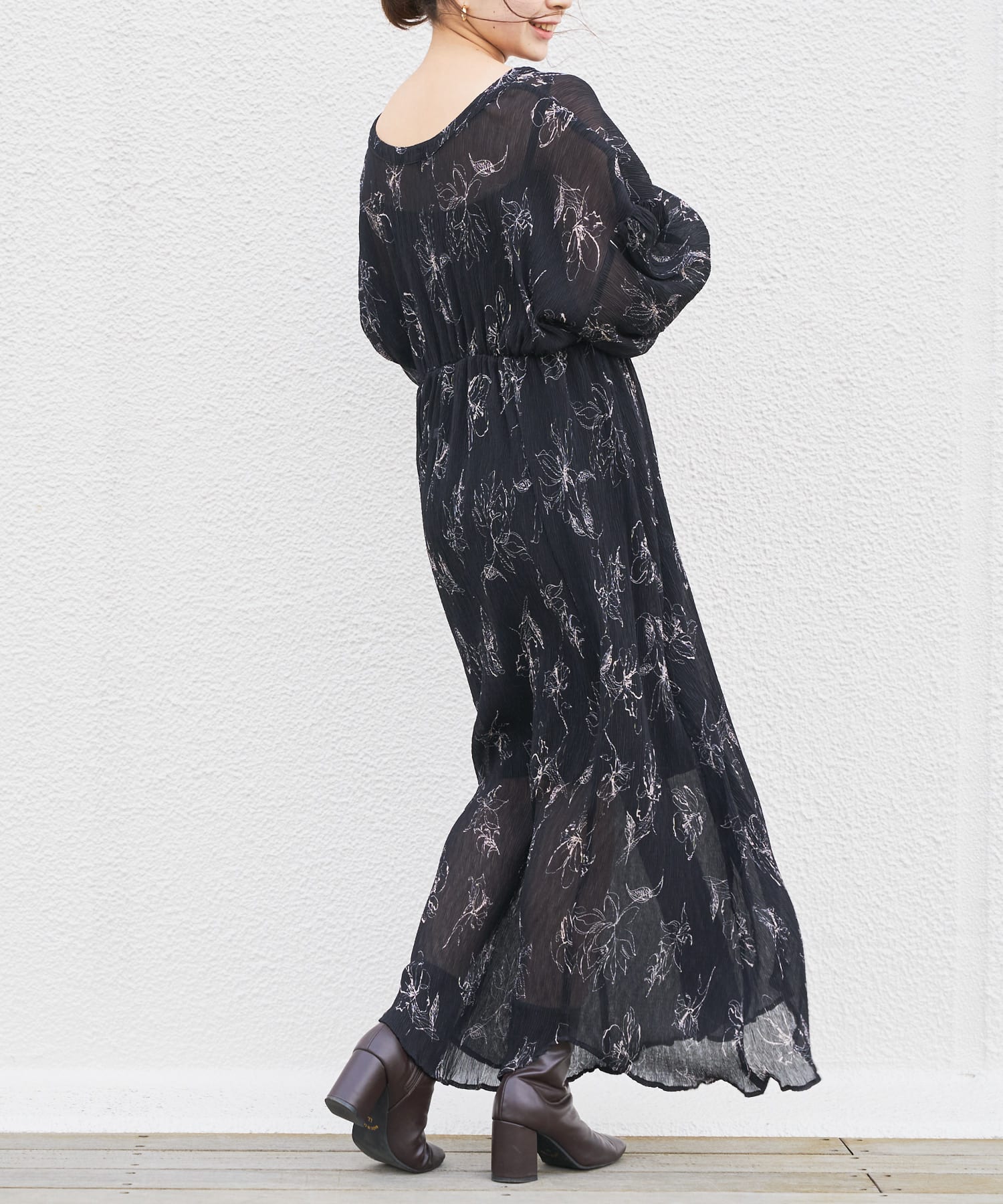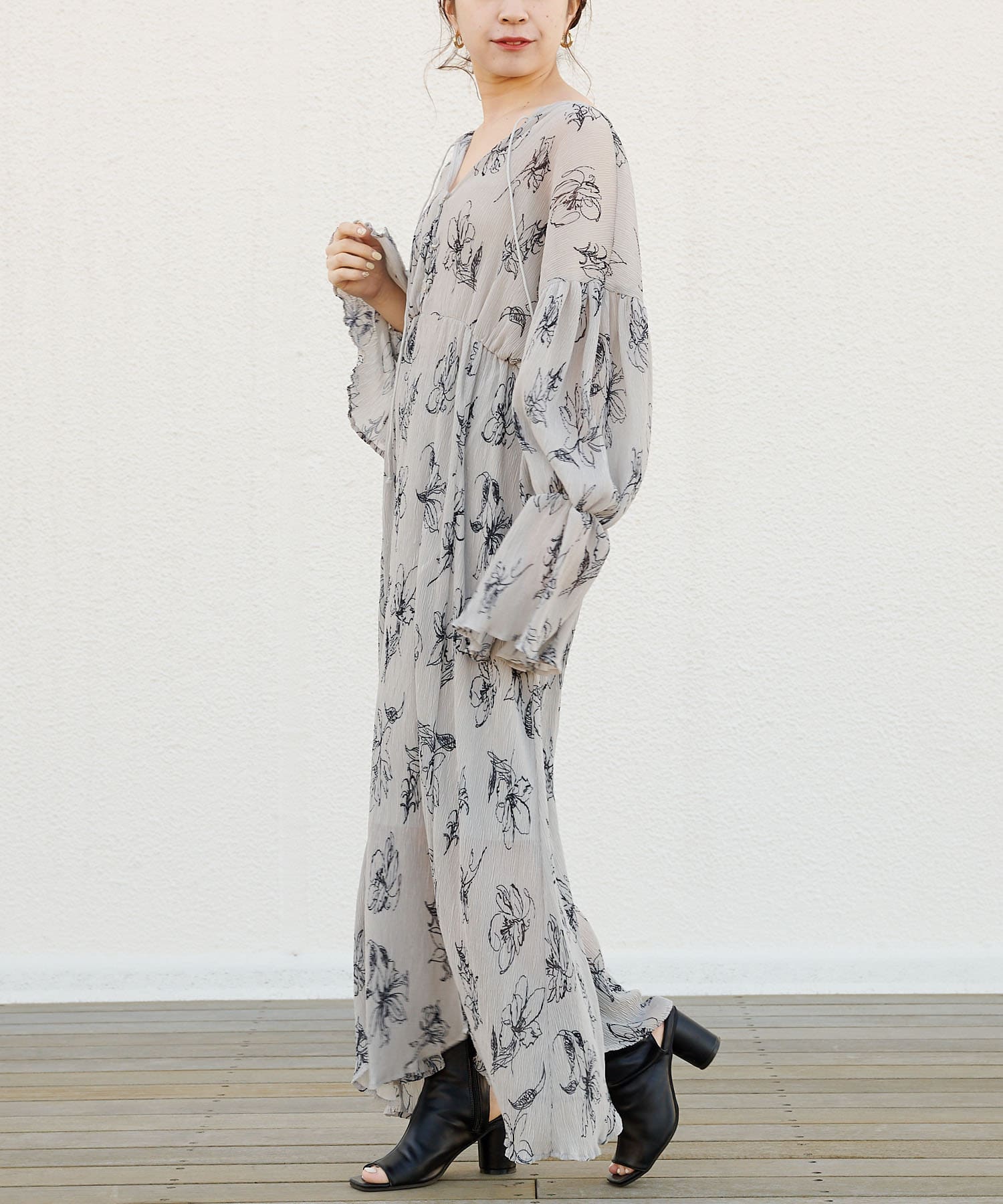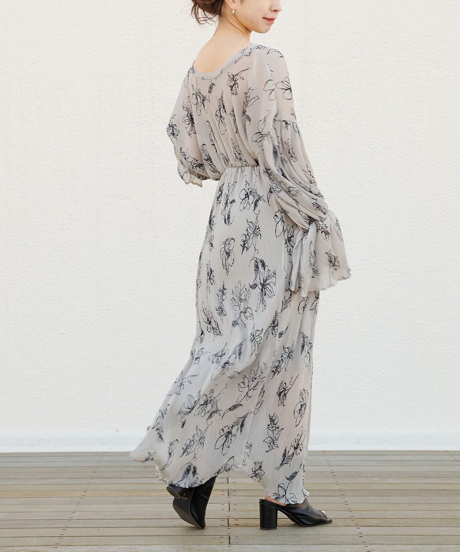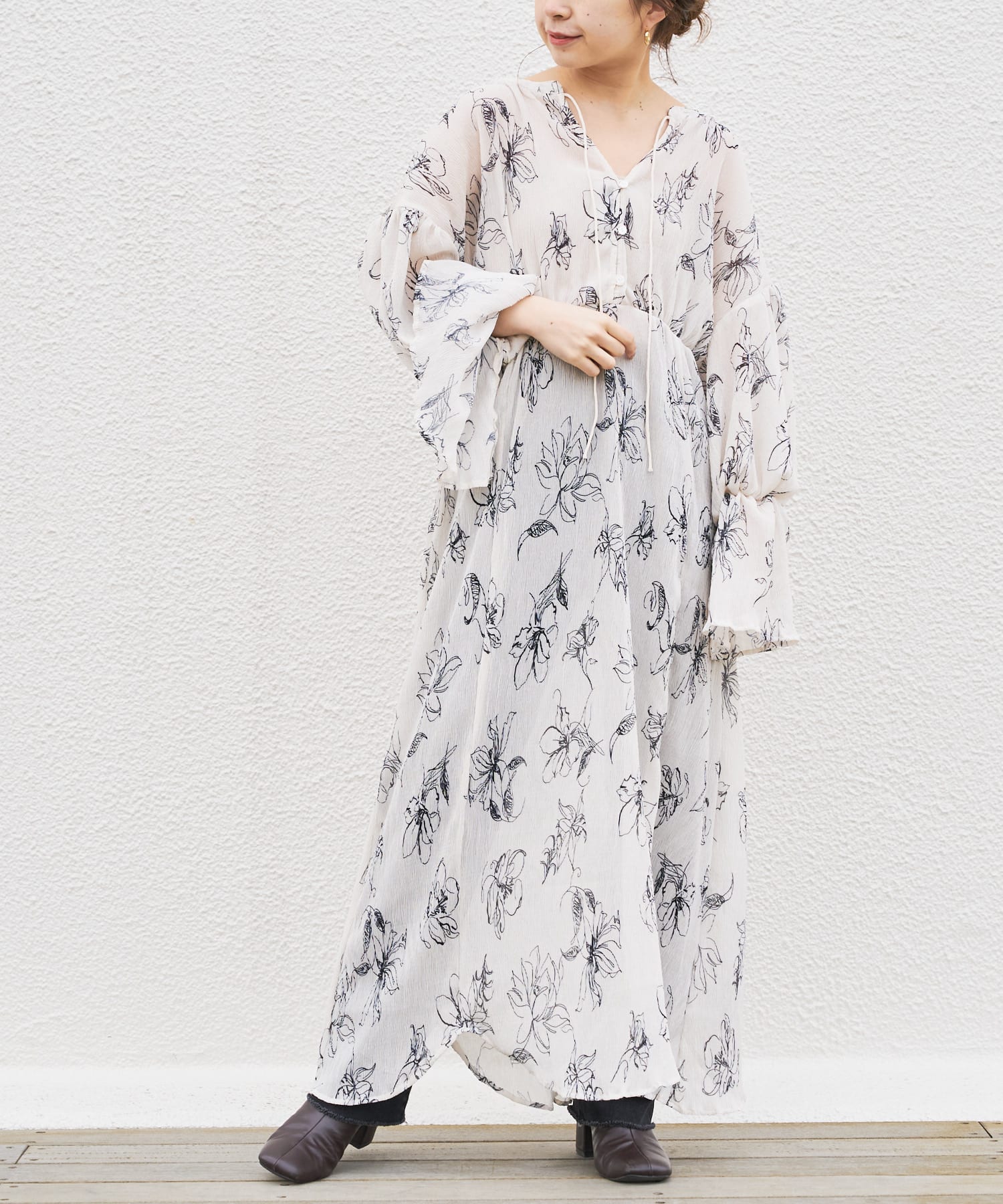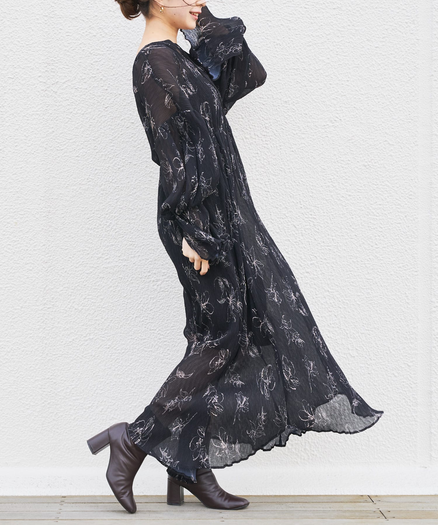 繊細なラインで描かれた花柄がフェミニンで大人っぽい印象に。