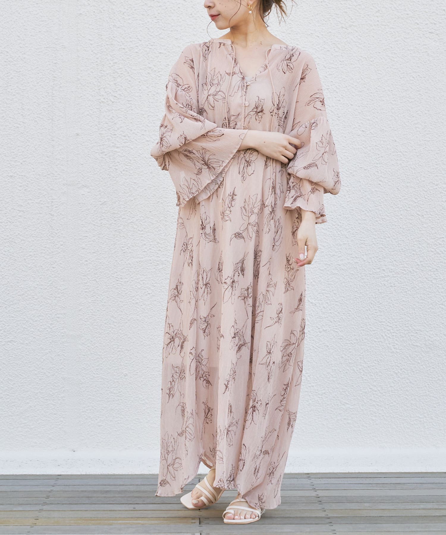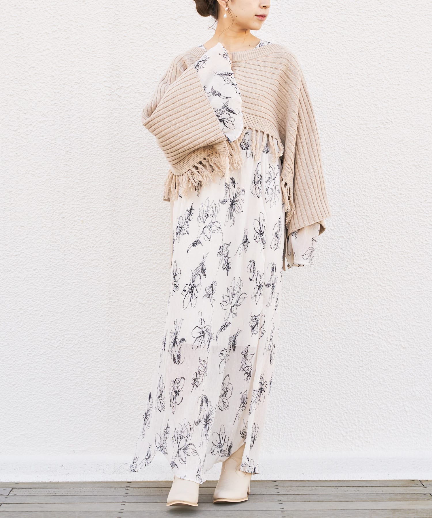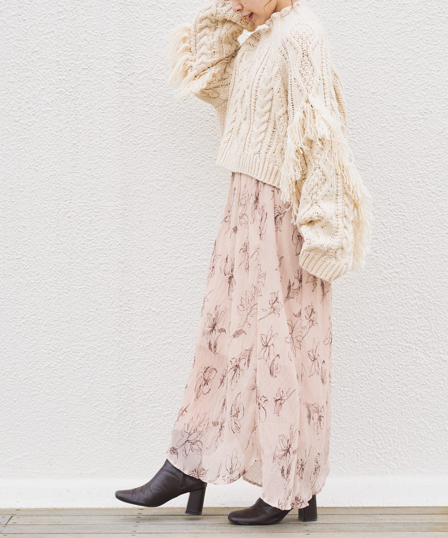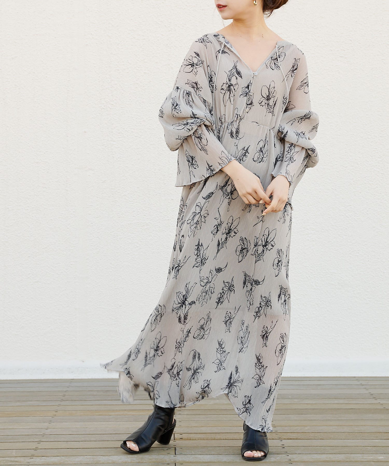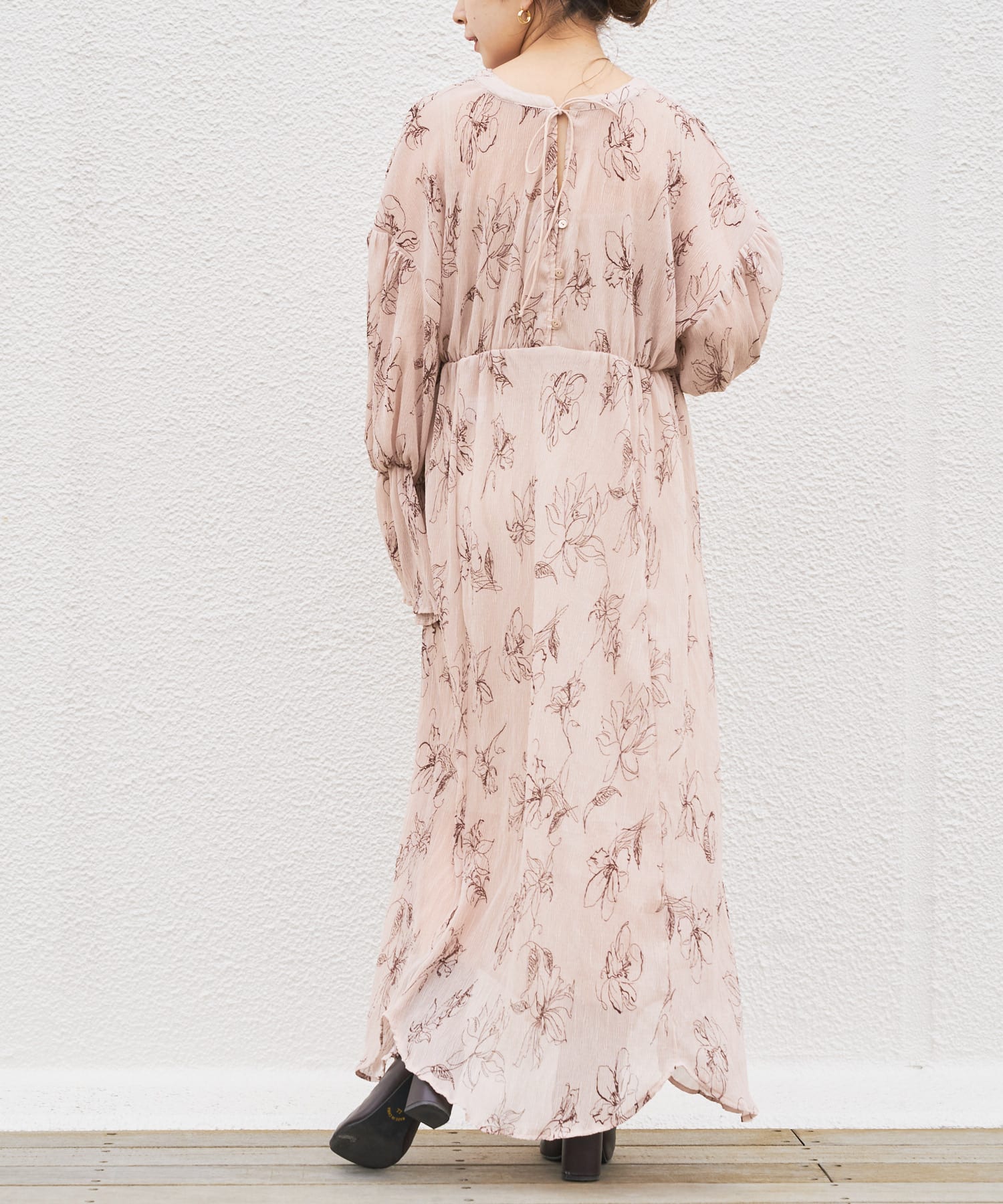 繊細なラインで描かれた花柄がフェミニンで大人っぽい印象に。