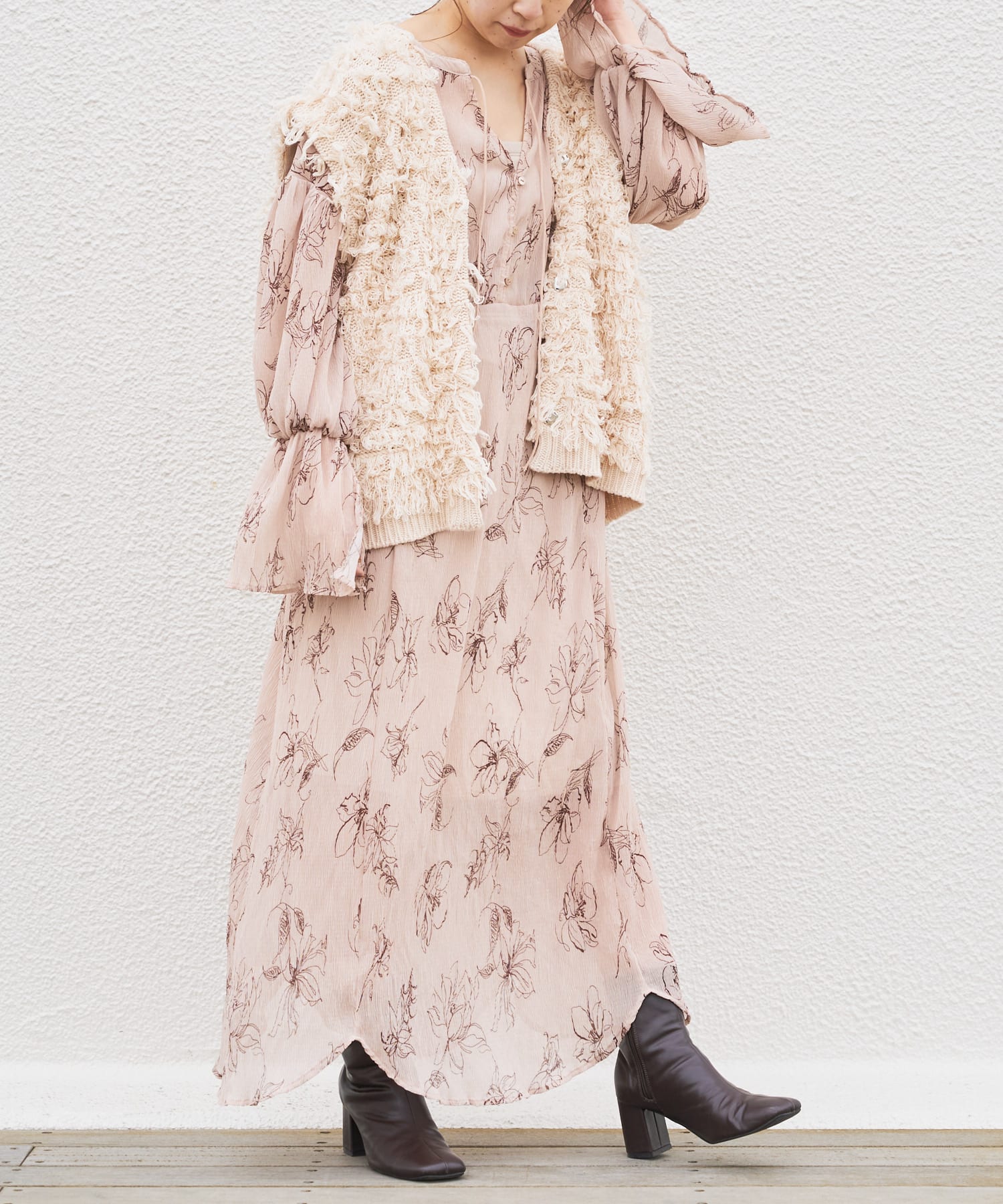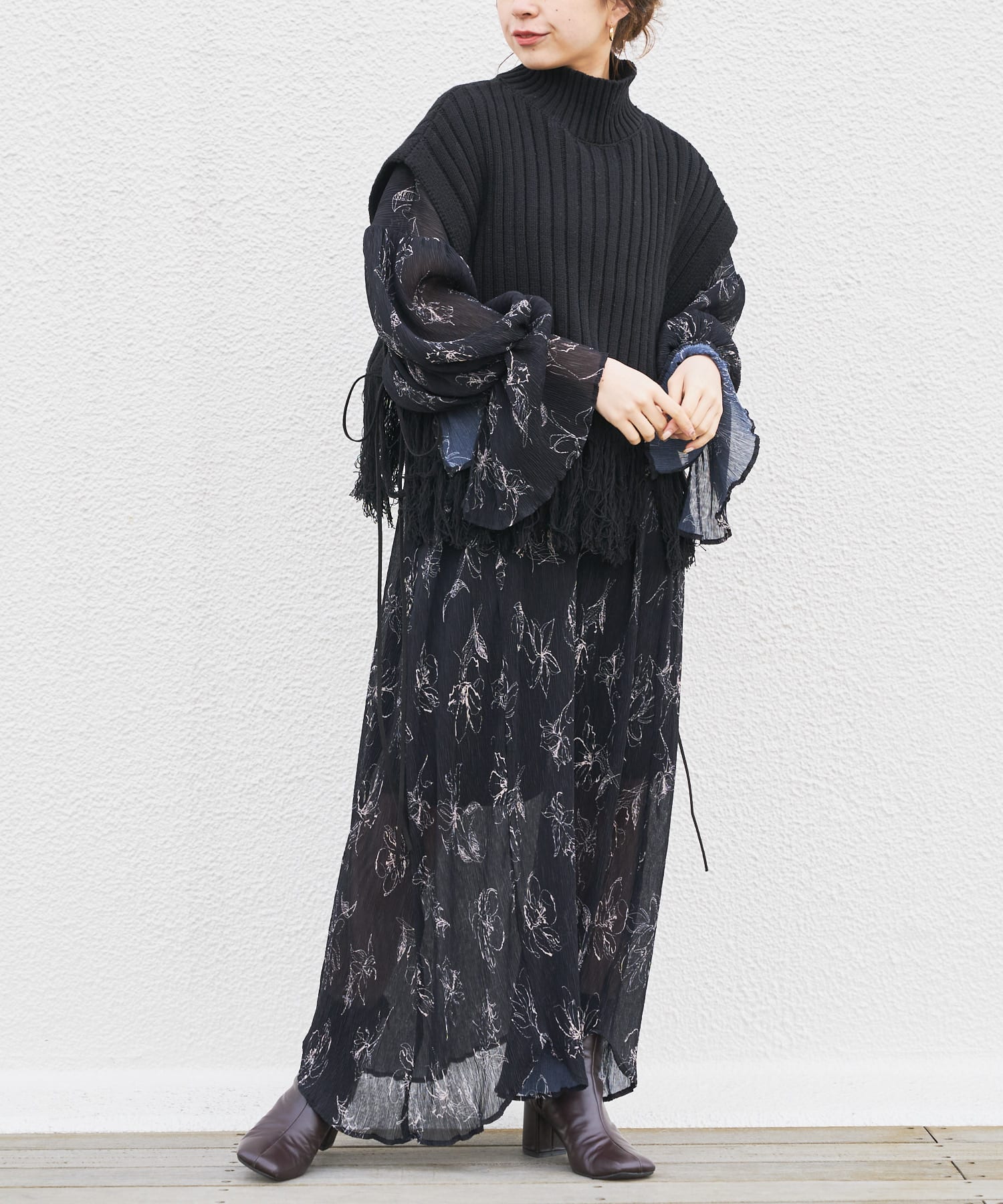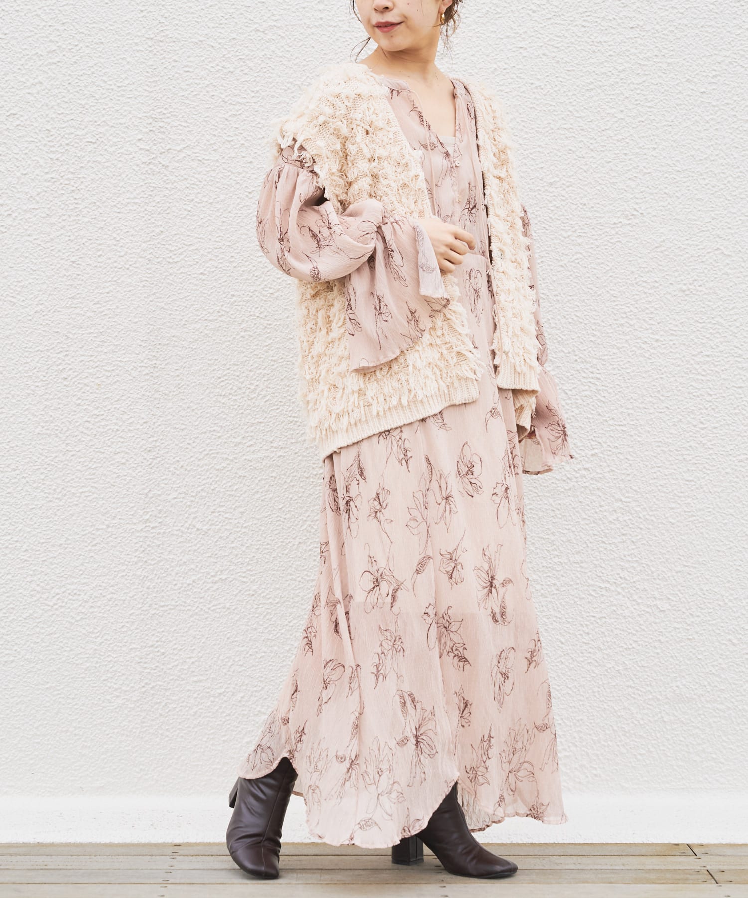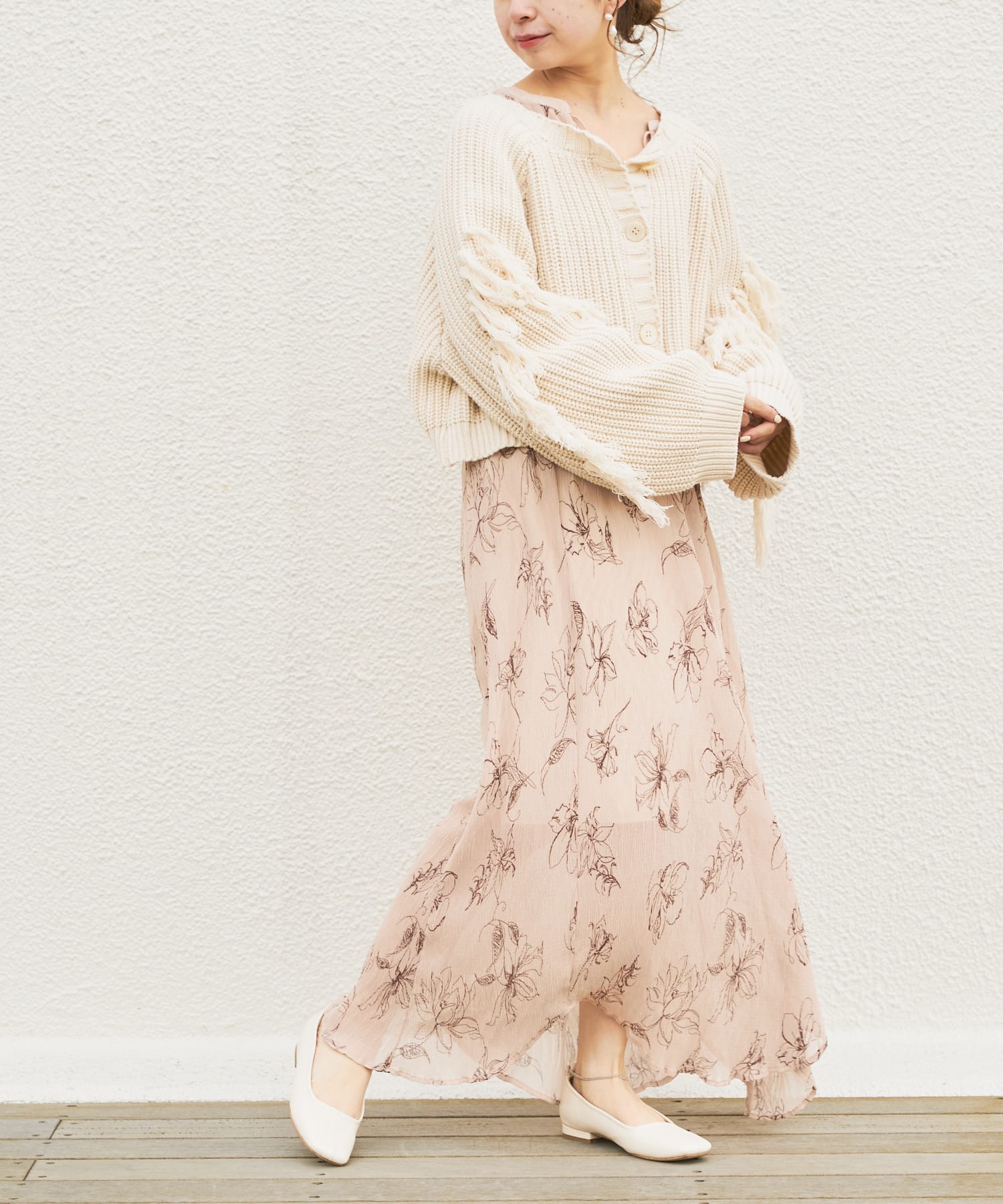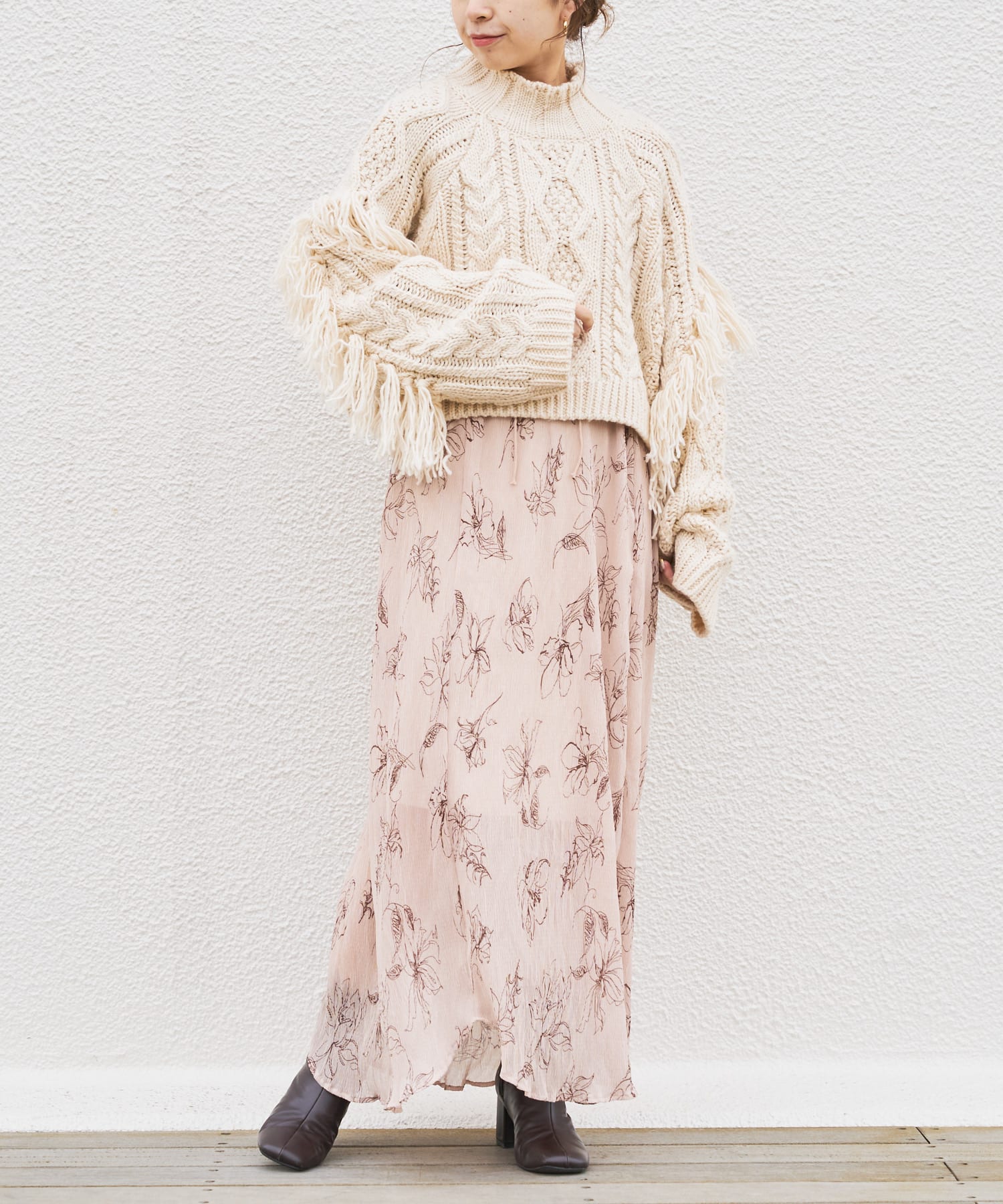 繊細なラインで描かれた花柄がフェミニンで大人っぽい印象に。