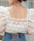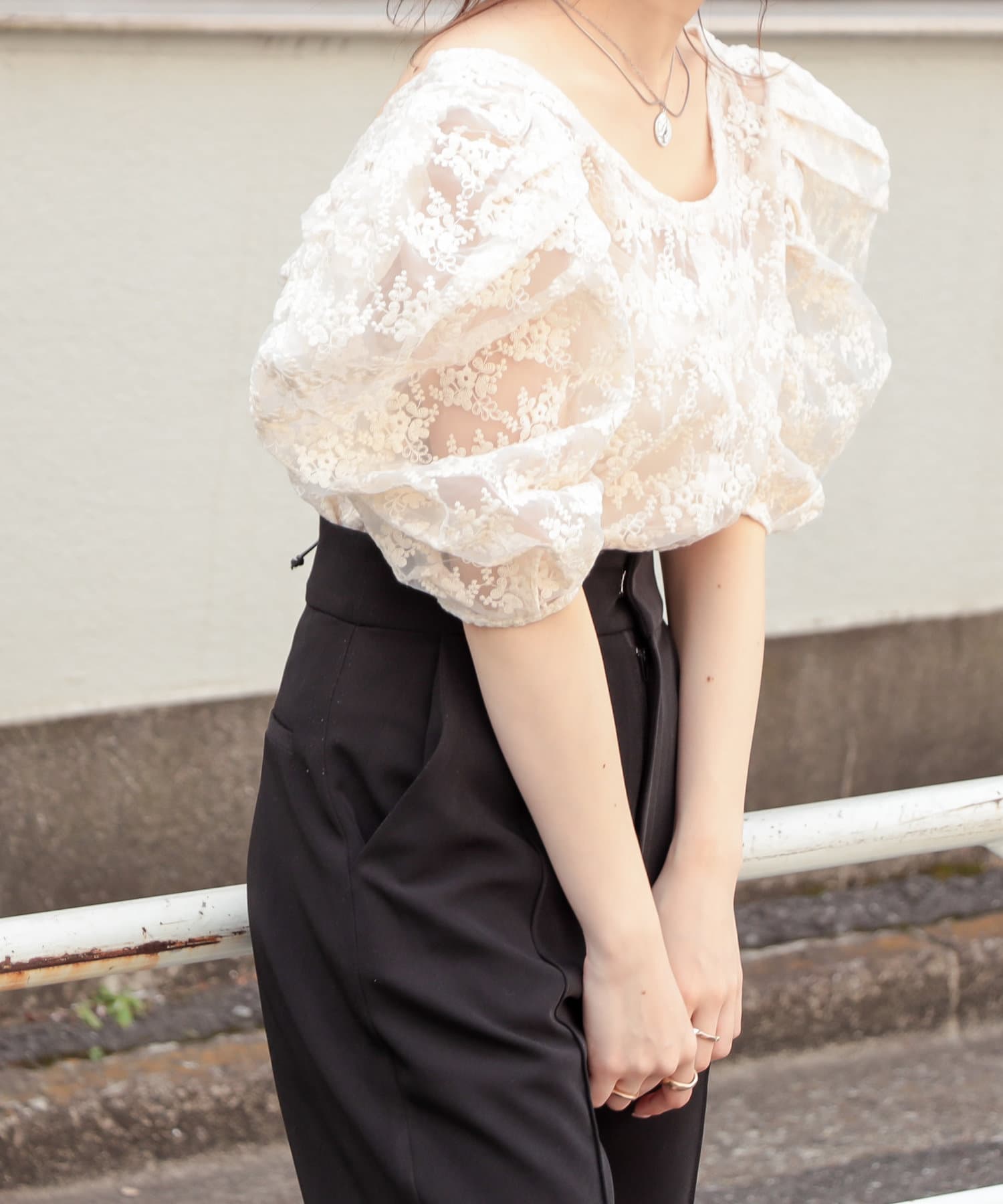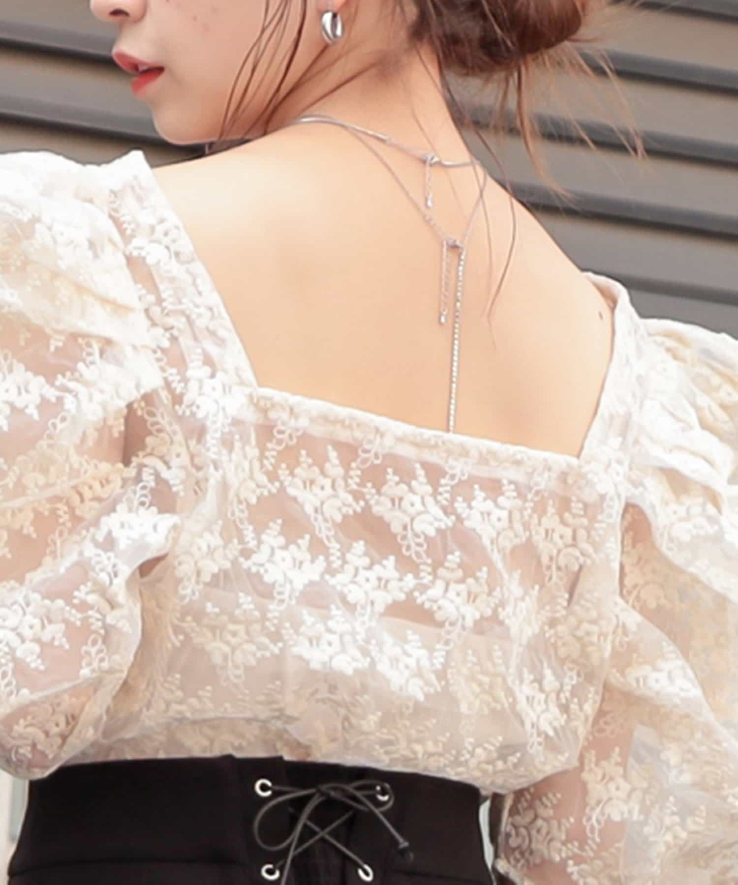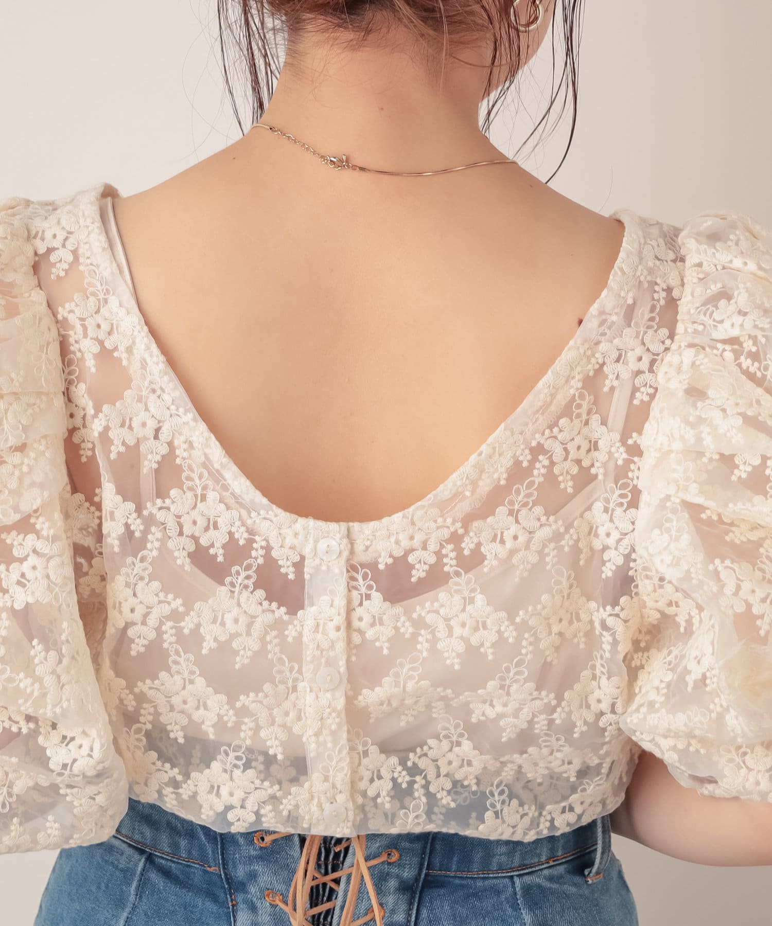 オーガンジー素材で透け感があり繊細な刺繍から覗く肌見せが女性らしくもあり、