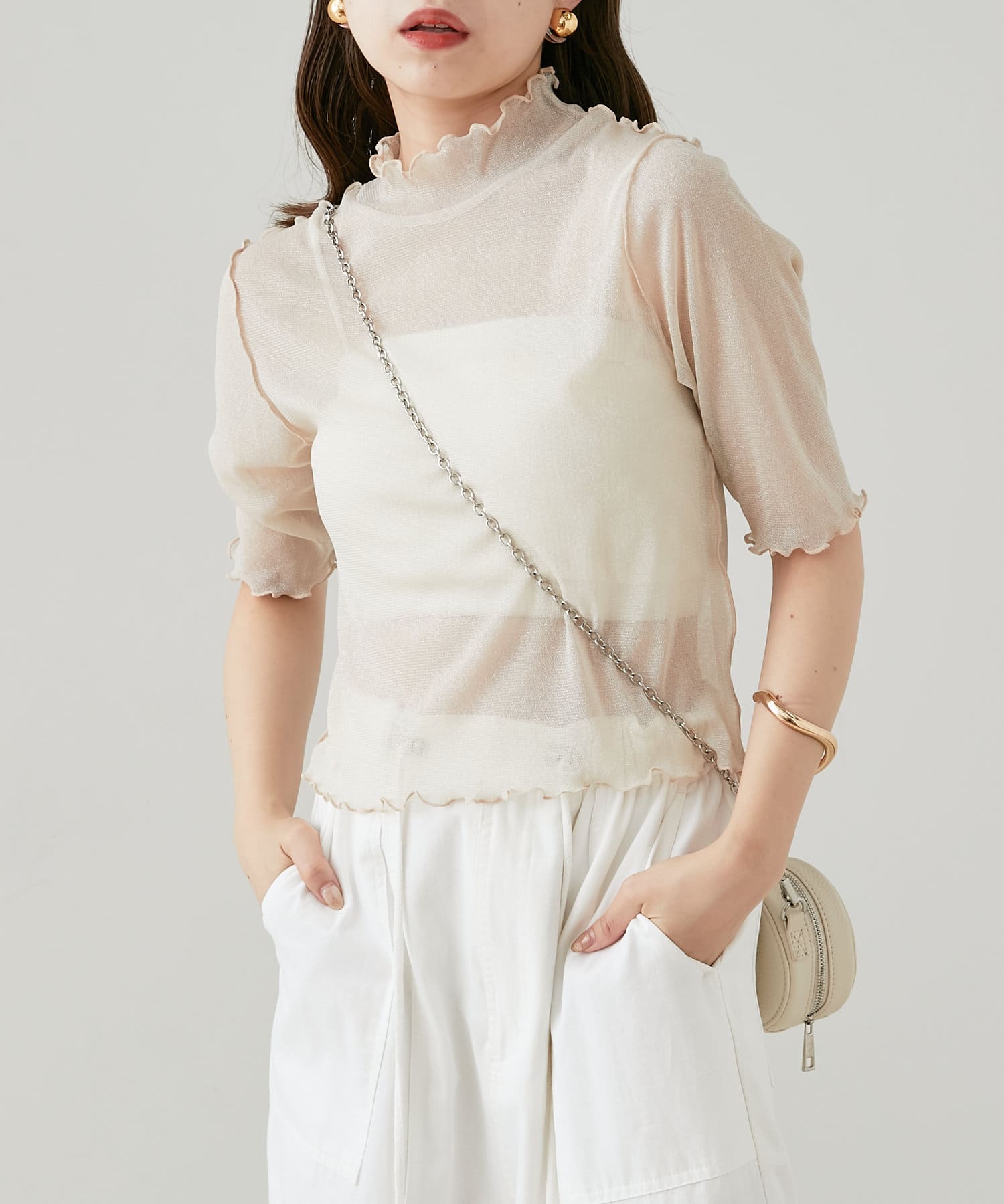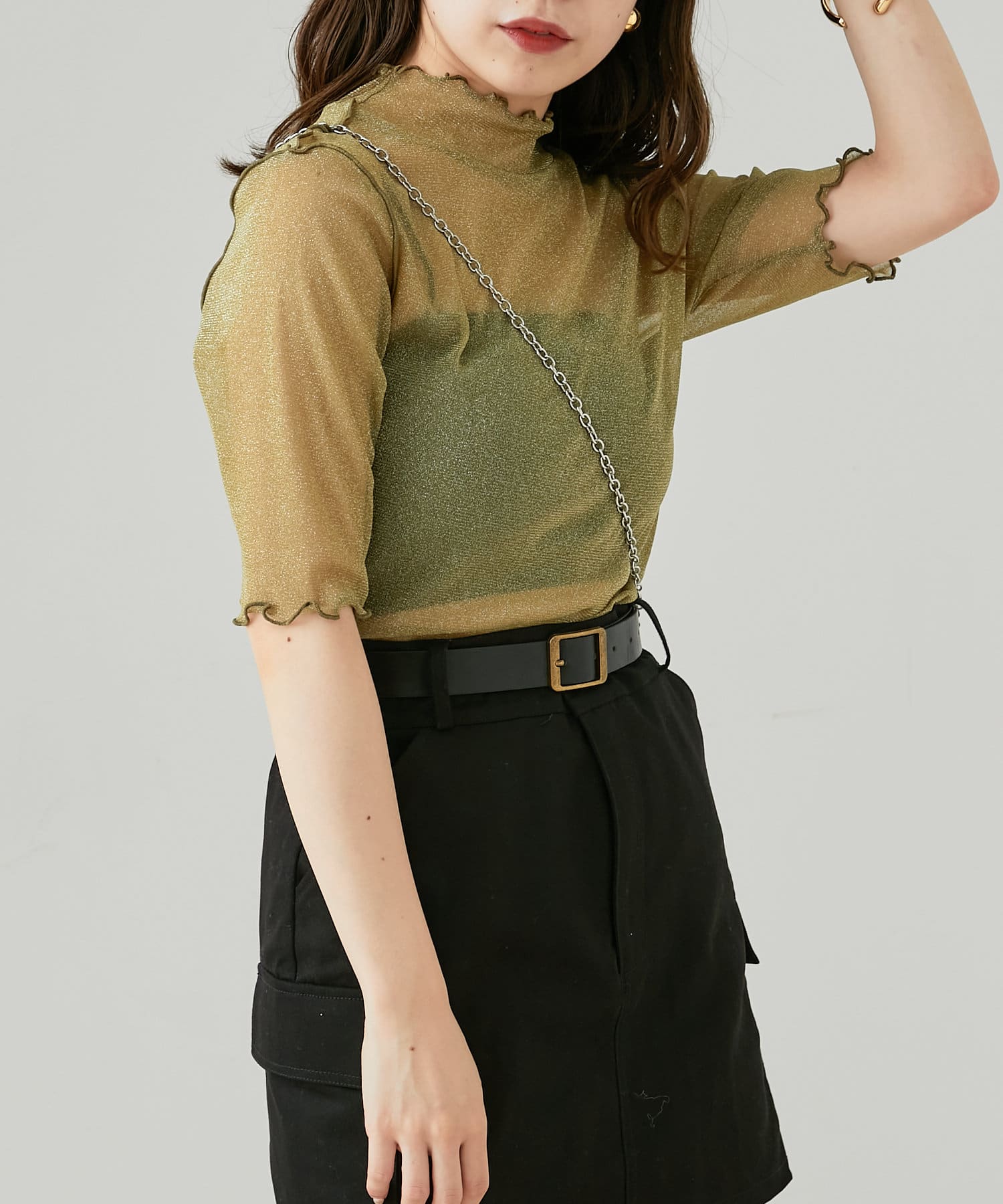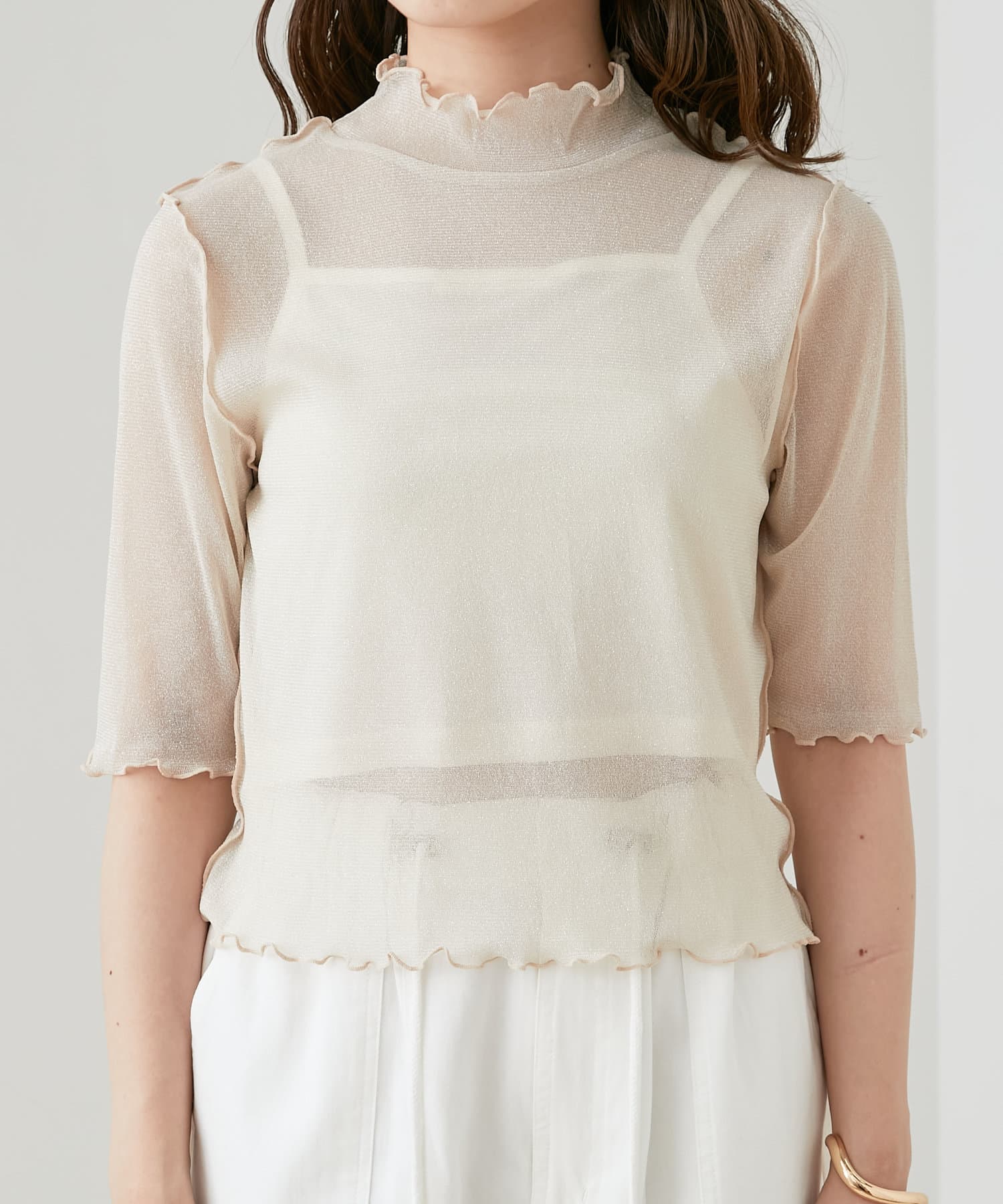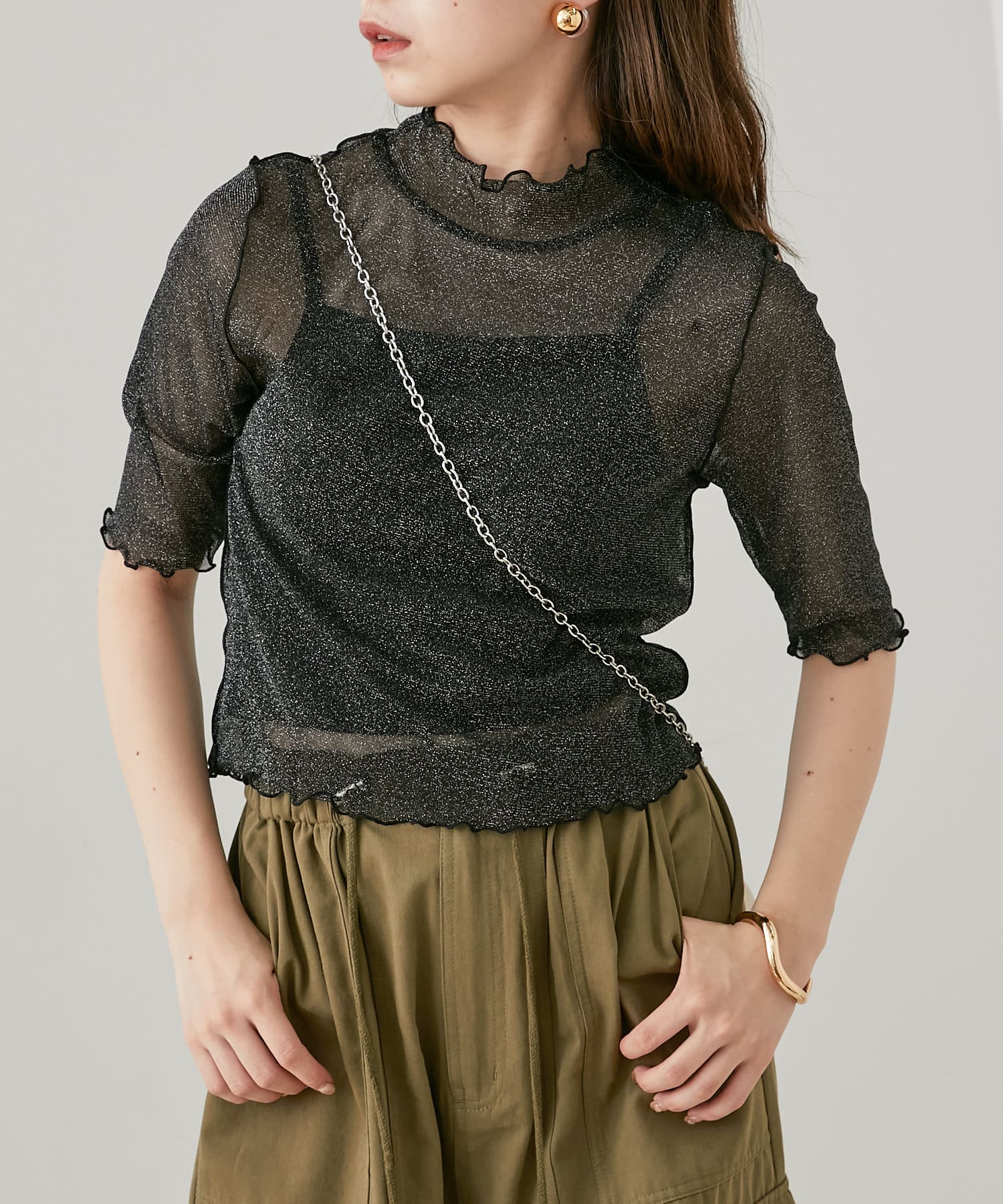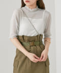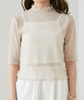 【Chico】5分袖キャミ付きハイネックシアーラメトップス