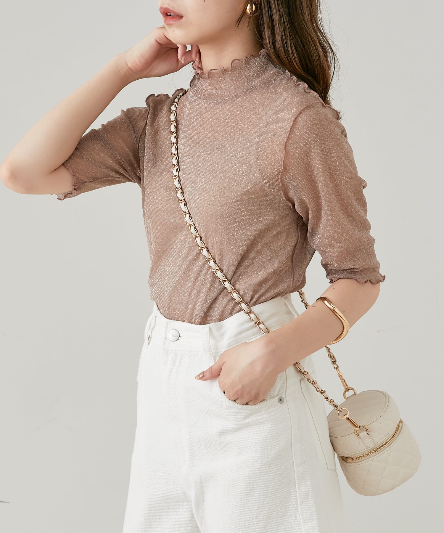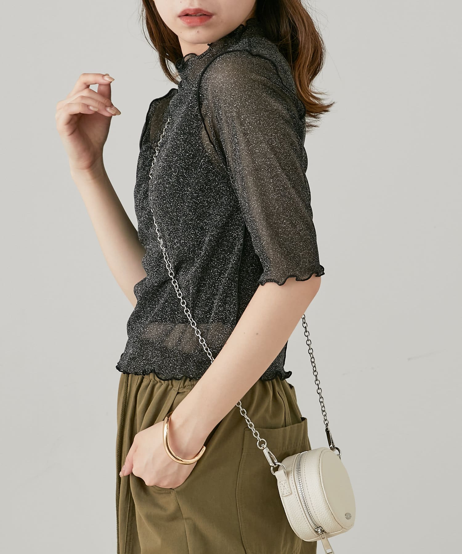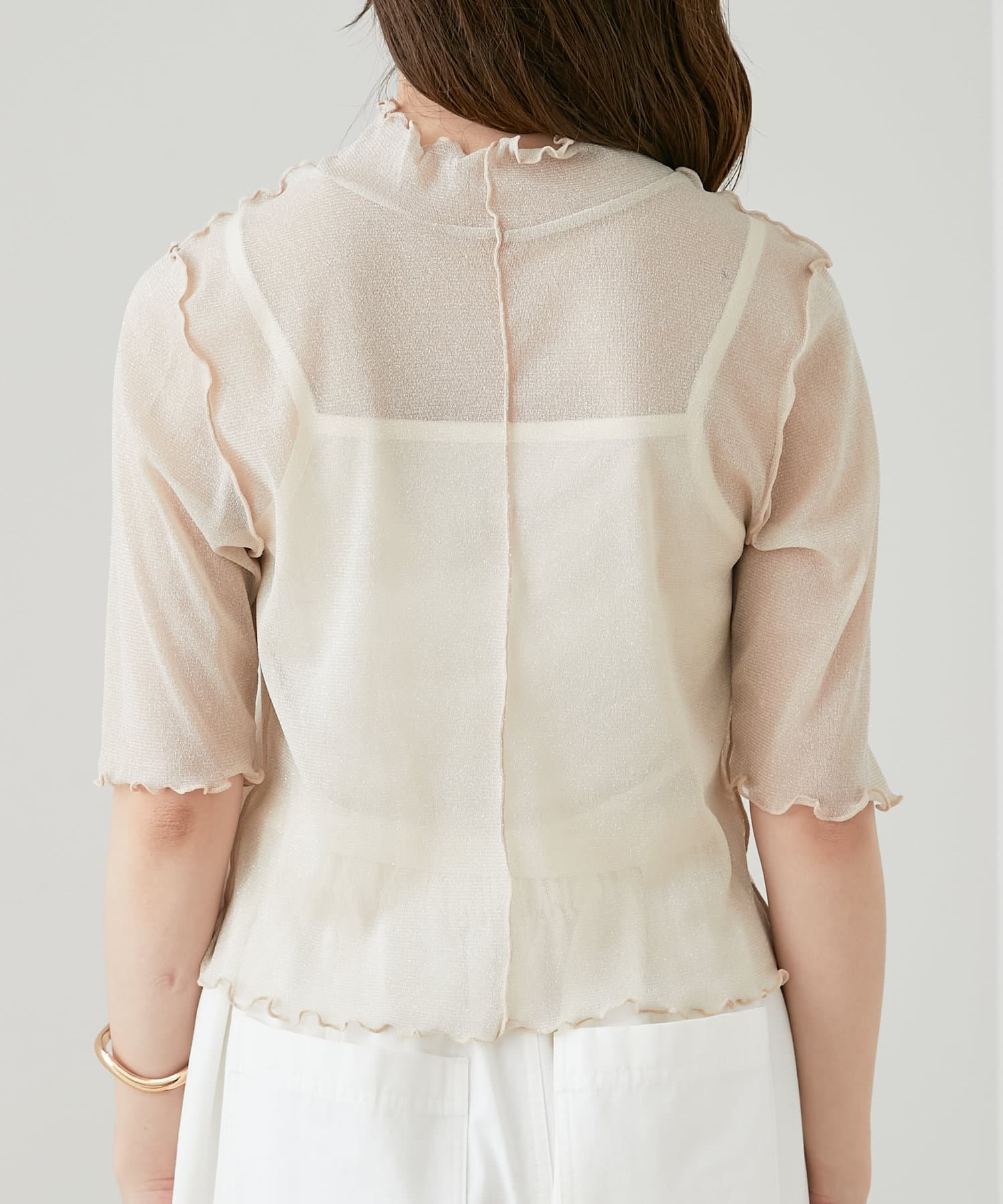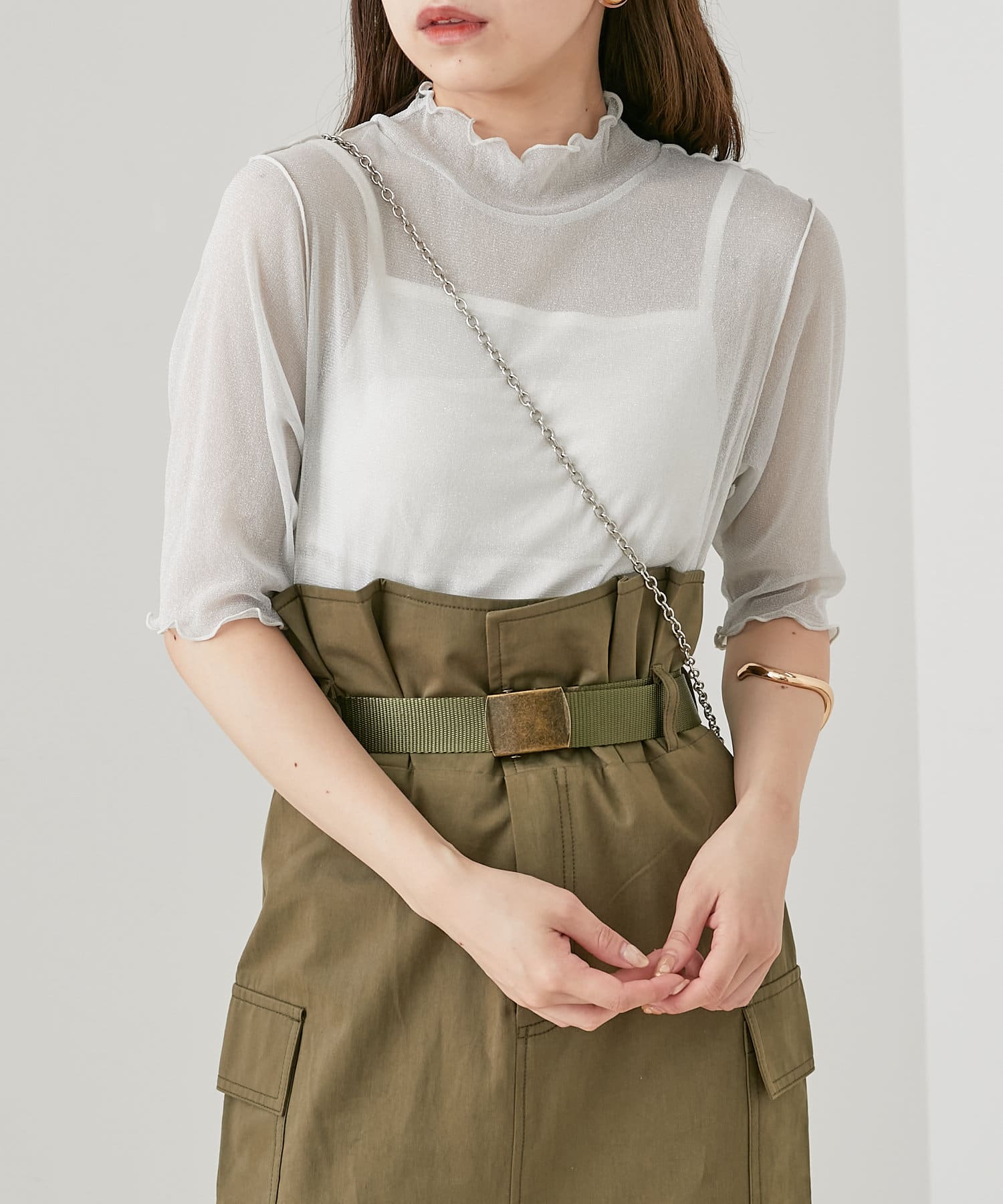 【Chico】5分袖キャミ付きハイネックシアーラメトップス