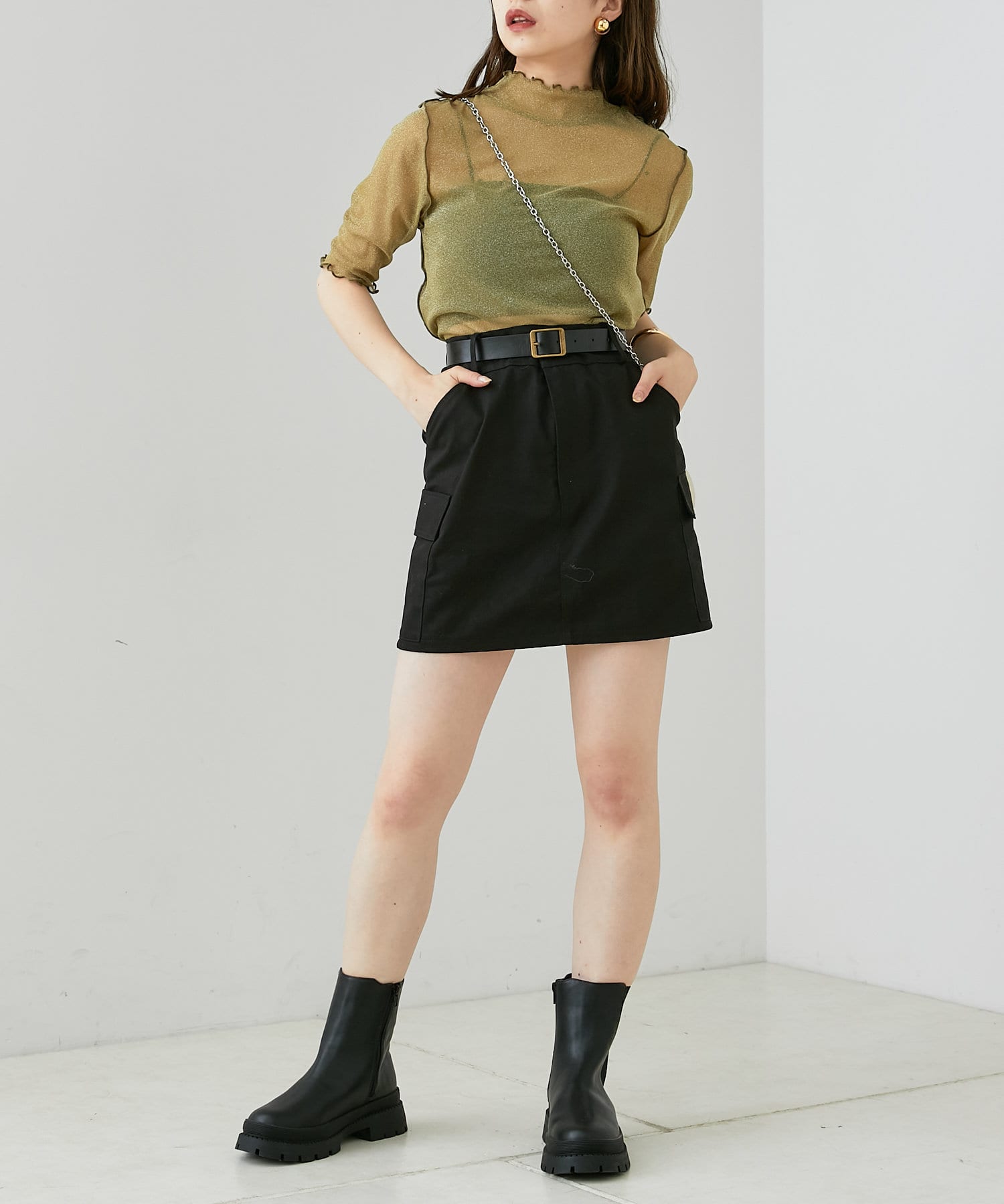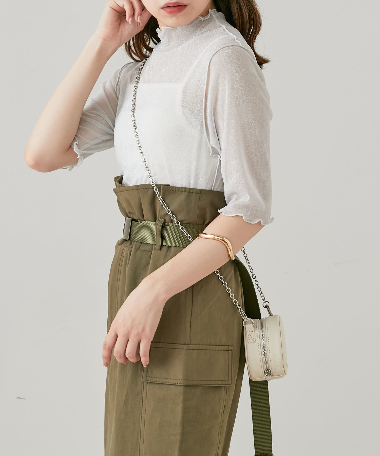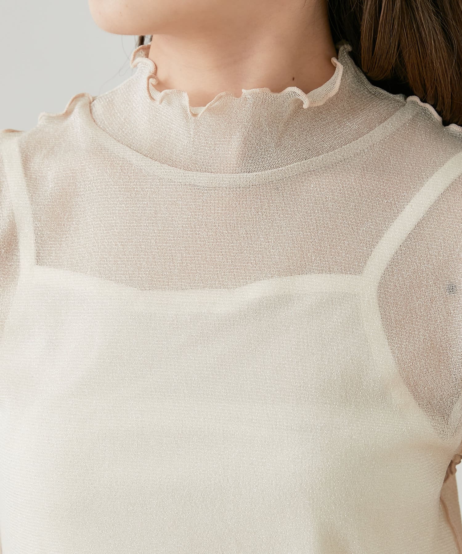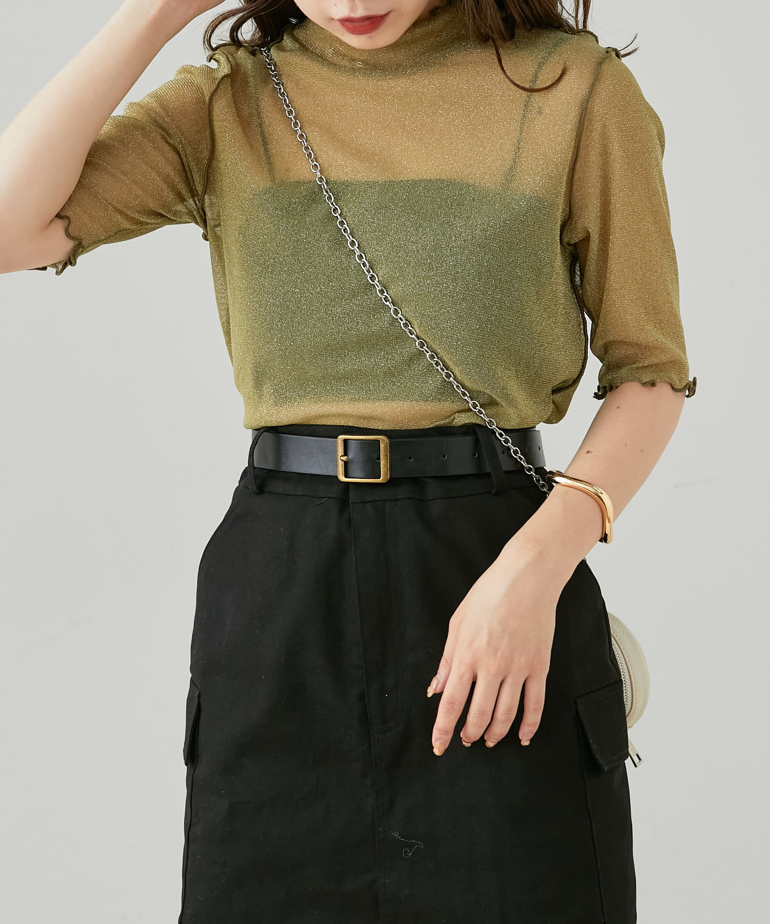 【Chico】5分袖キャミ付きハイネックシアーラメトップス