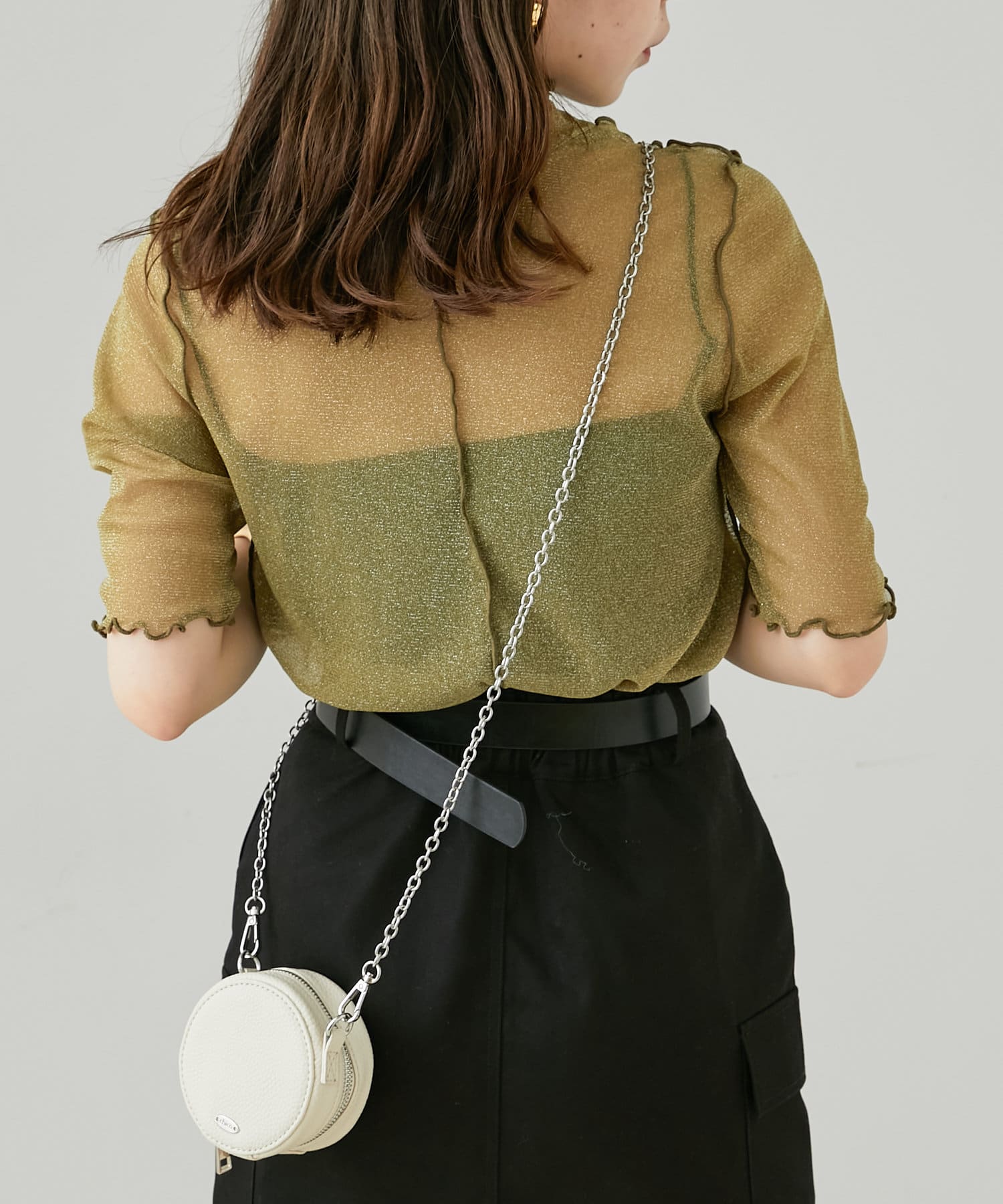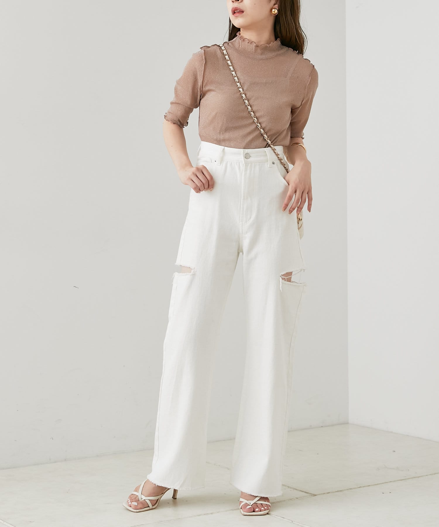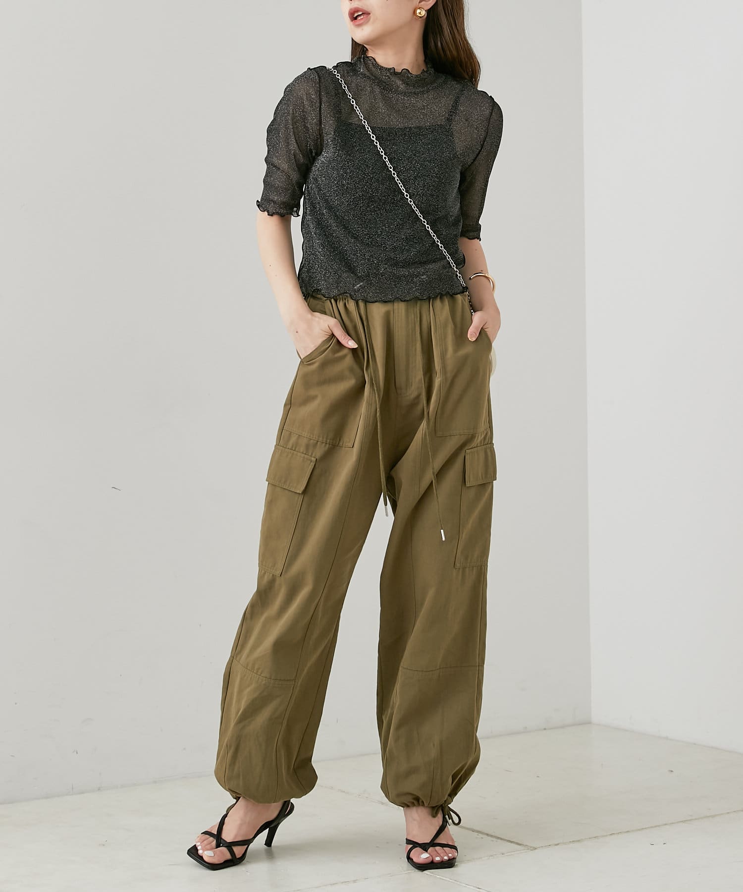 ・動くたびにきらきらするラメ感がかわいいトップスは、トレンドのメローデザインで女っぽく着こなせます。