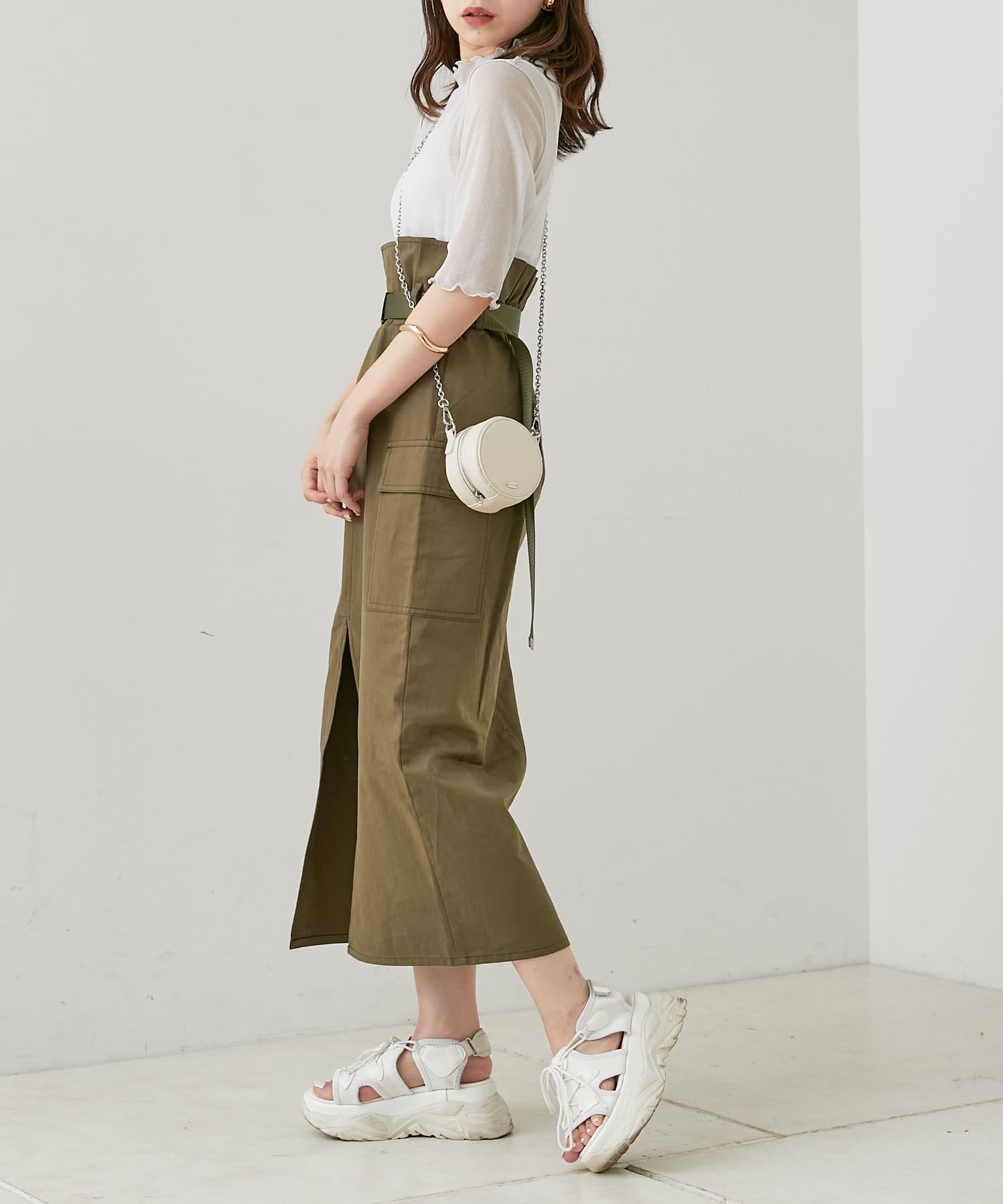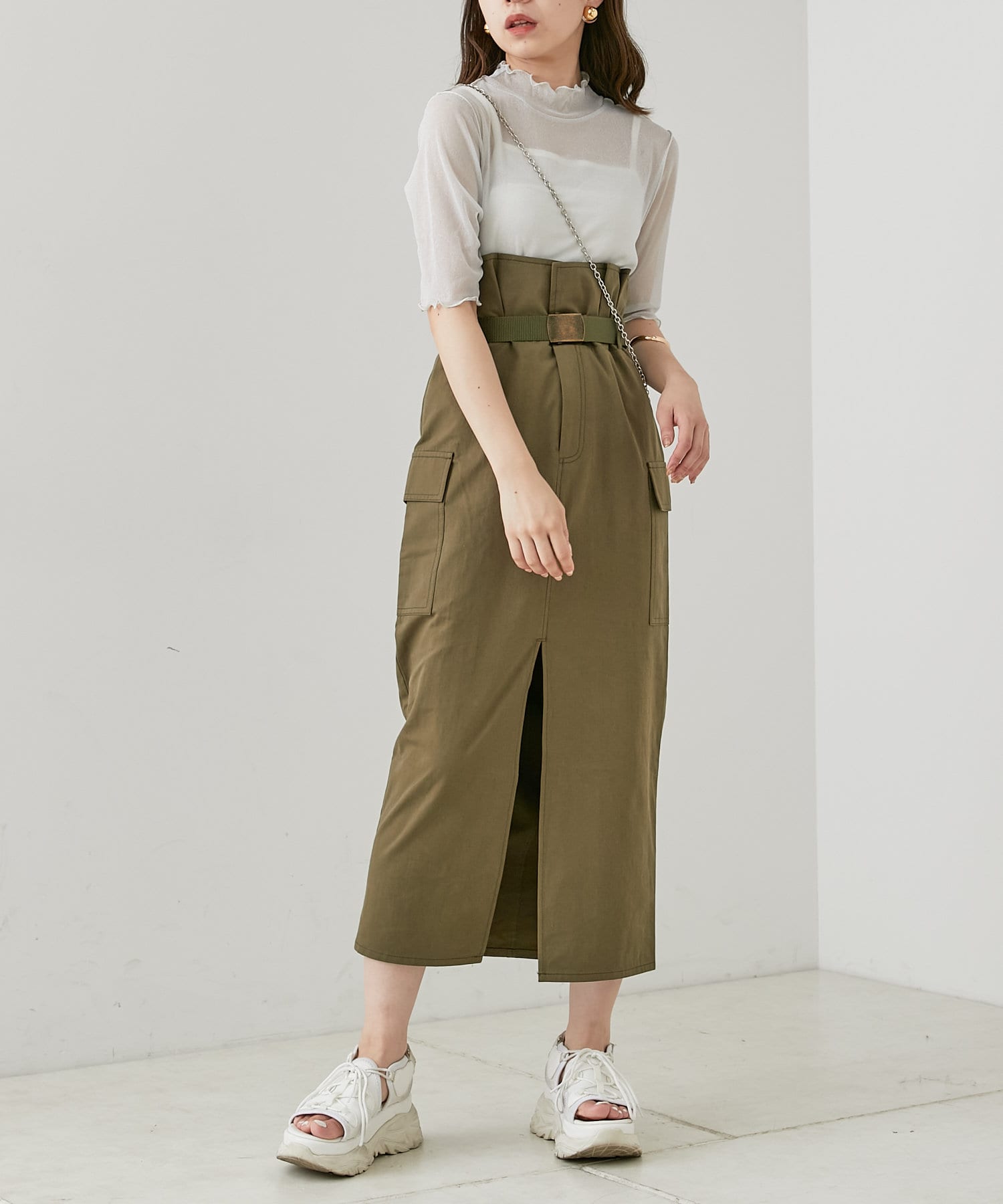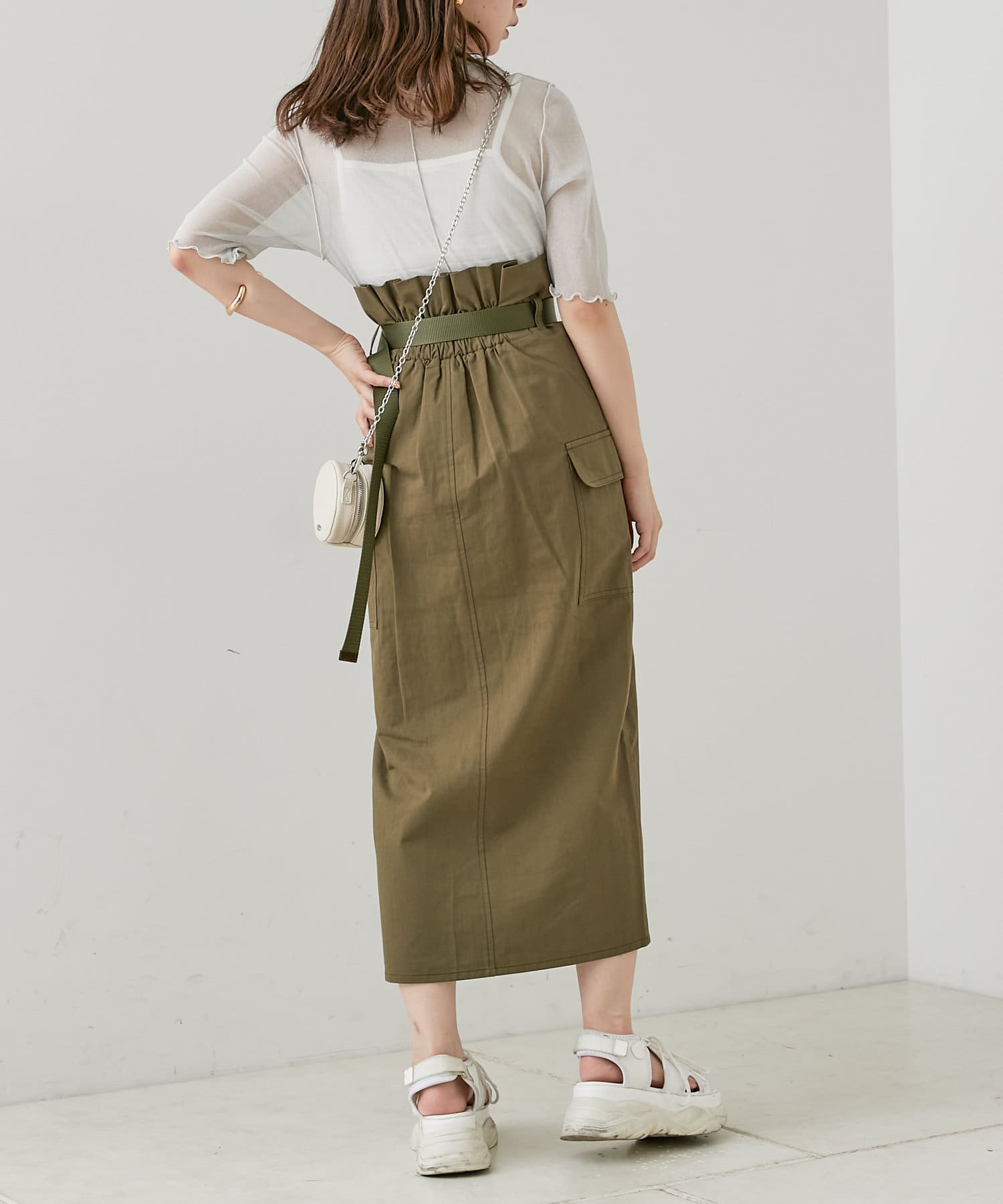 ・大人っぽいアイテムなので、ドロストスカートやIラインスカートなどのロングスカートと合わせると上品に女っぽさを演出できます。