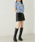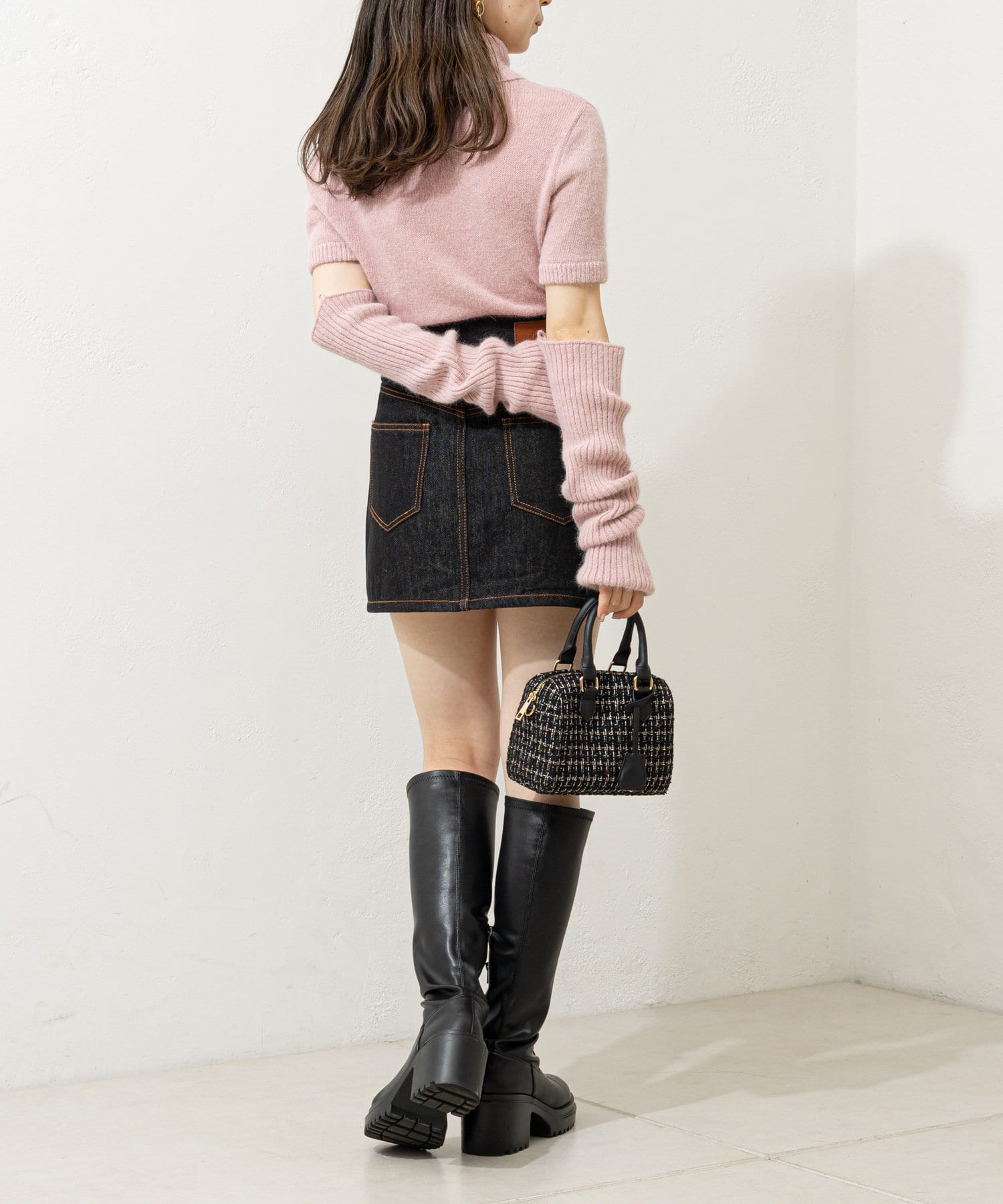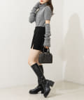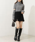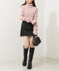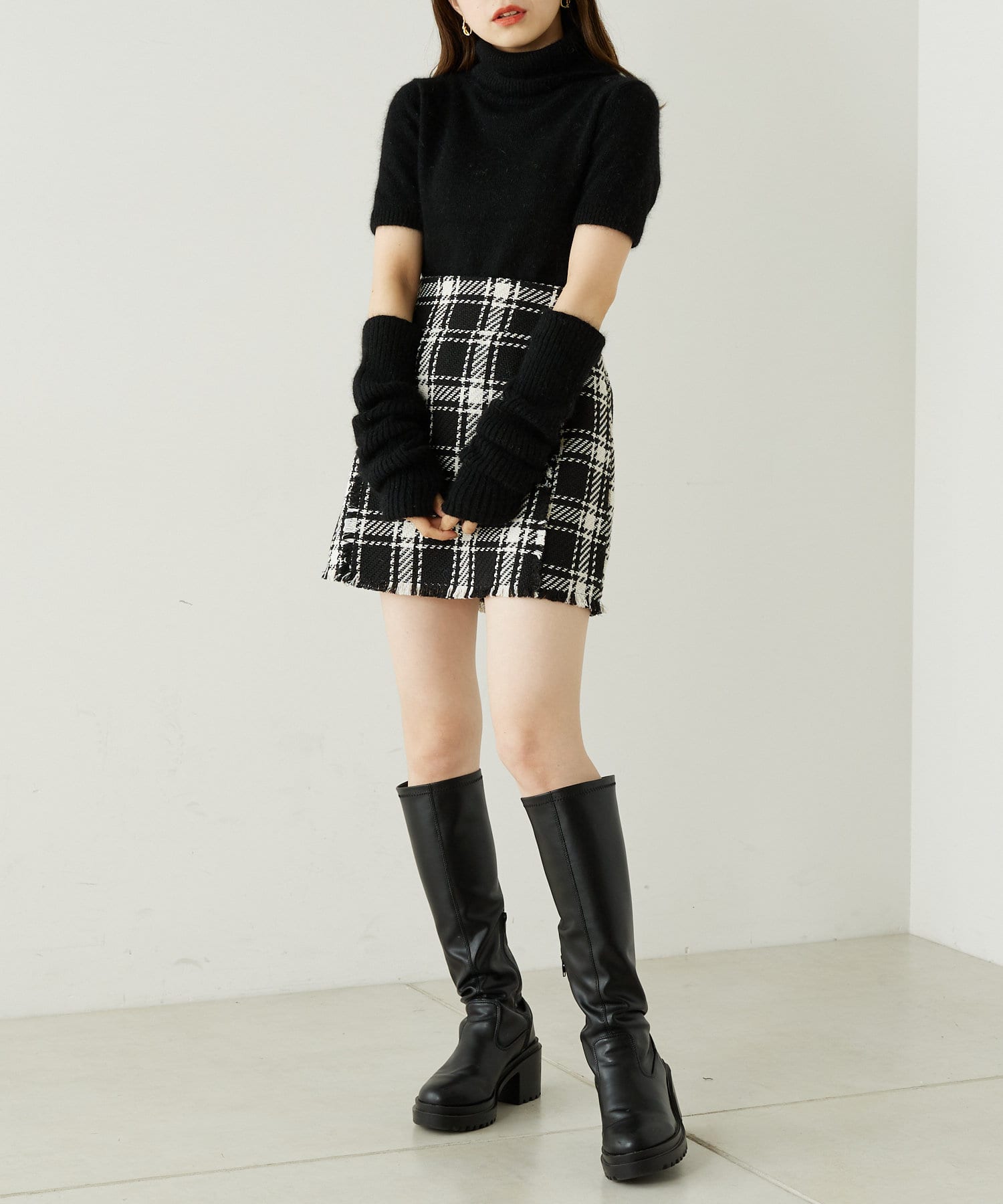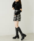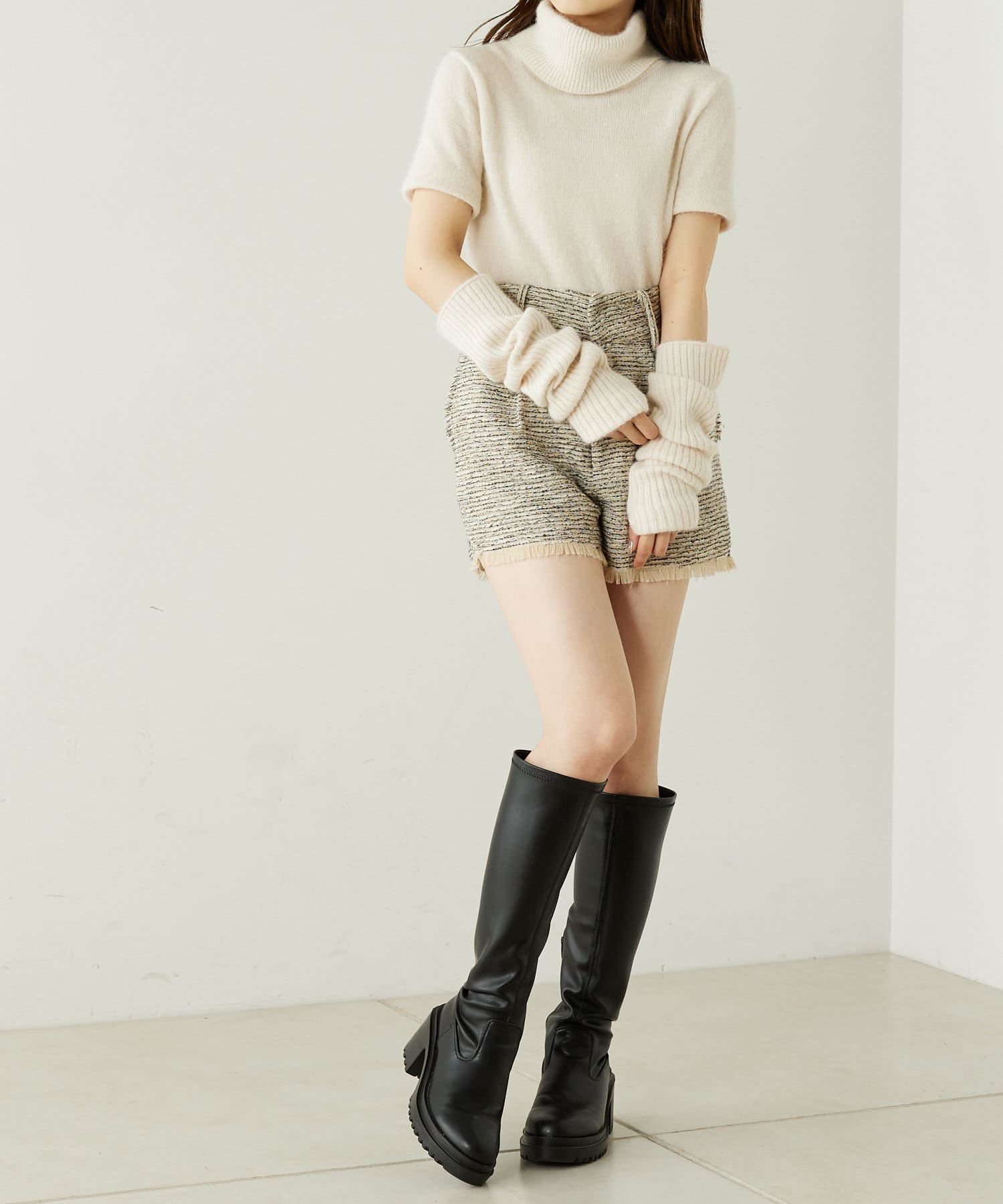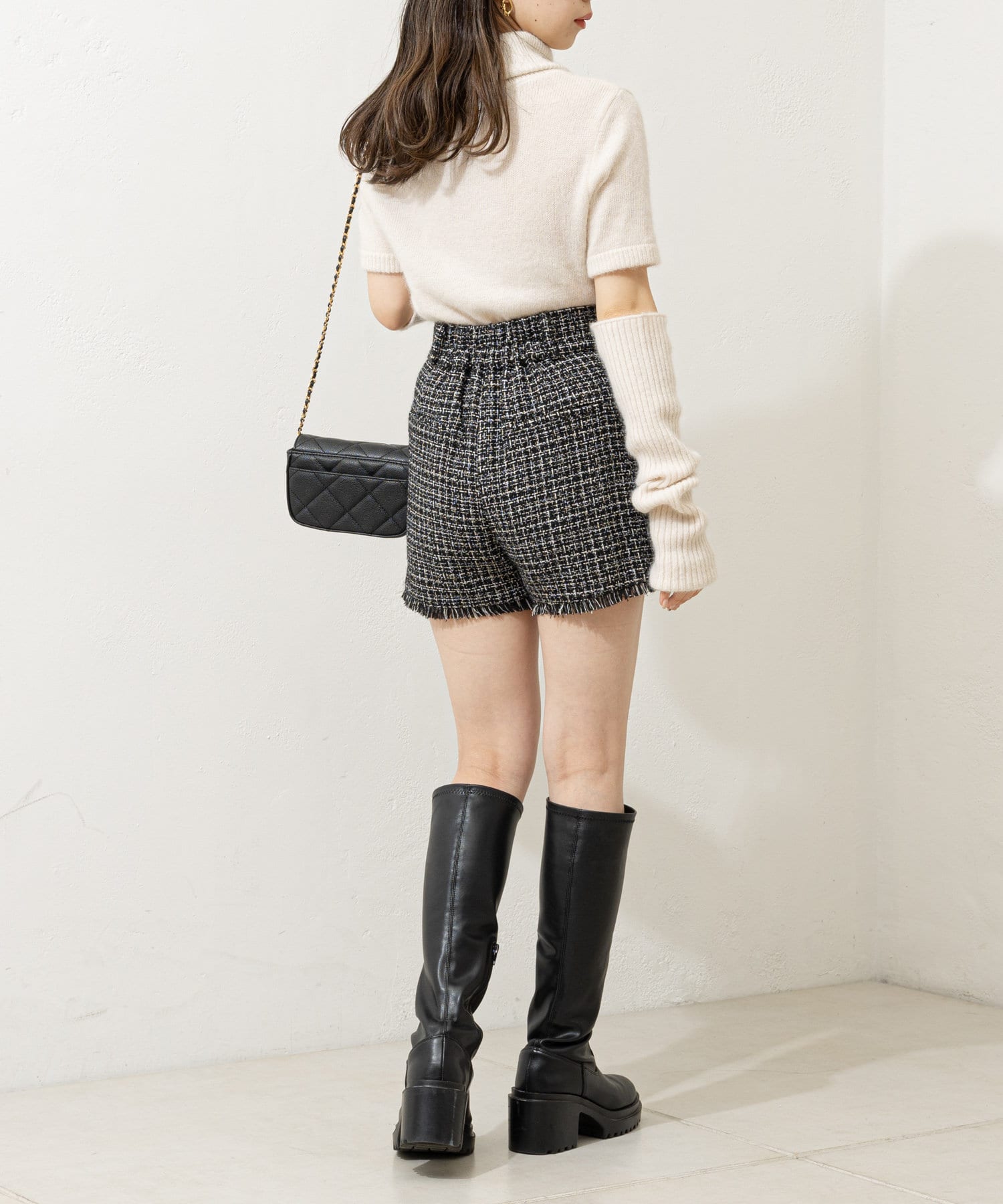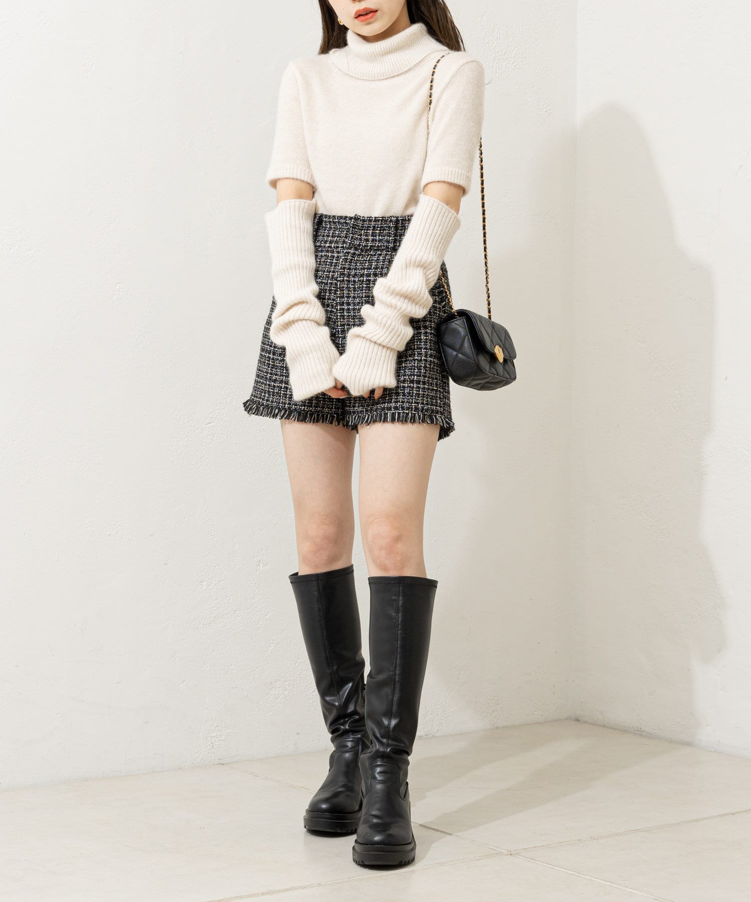 ・甘めに着こなすならプリーツスカートやツイードのショートパンツに、ロングブーツをプラスするとトレンドコーデに。
