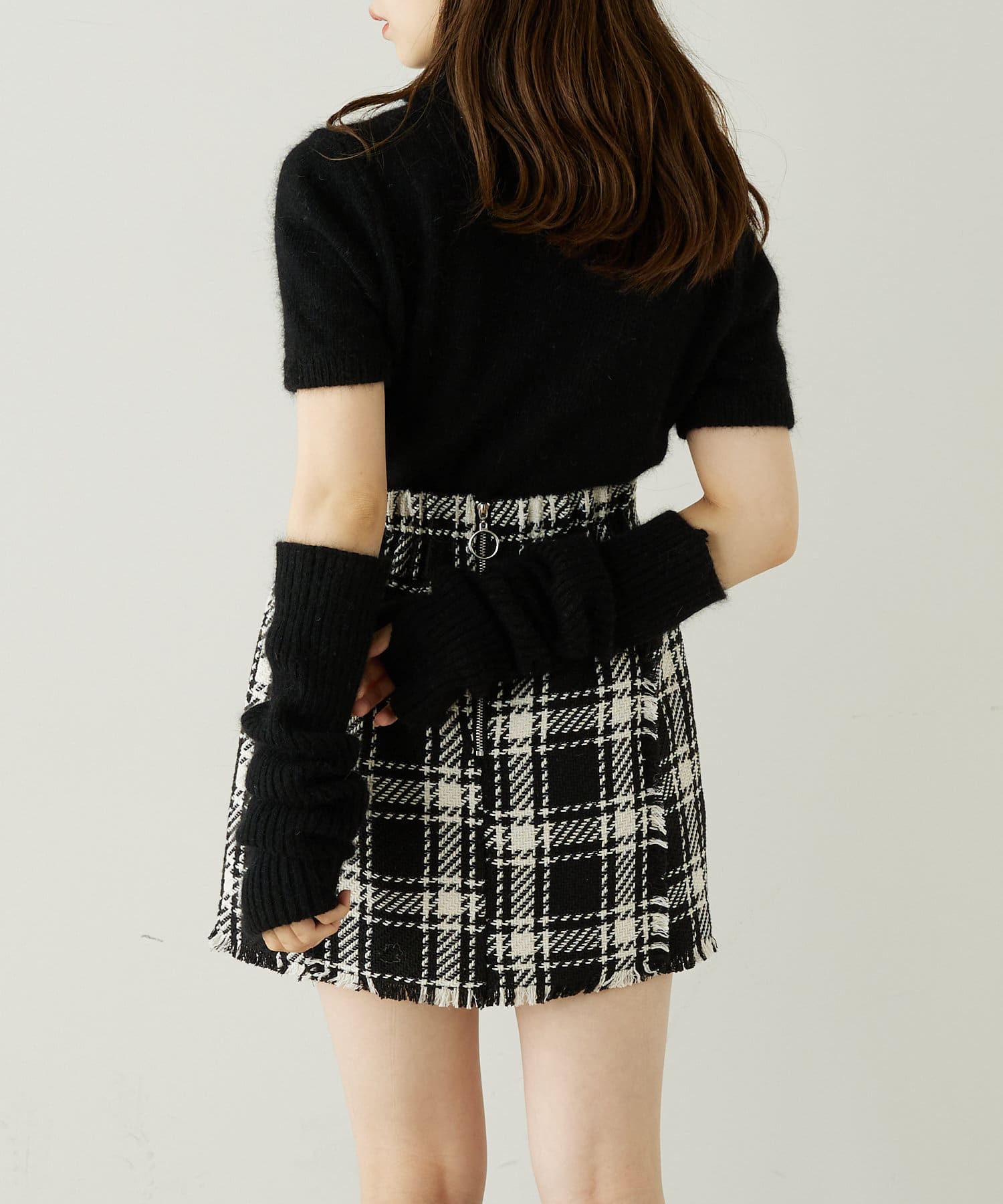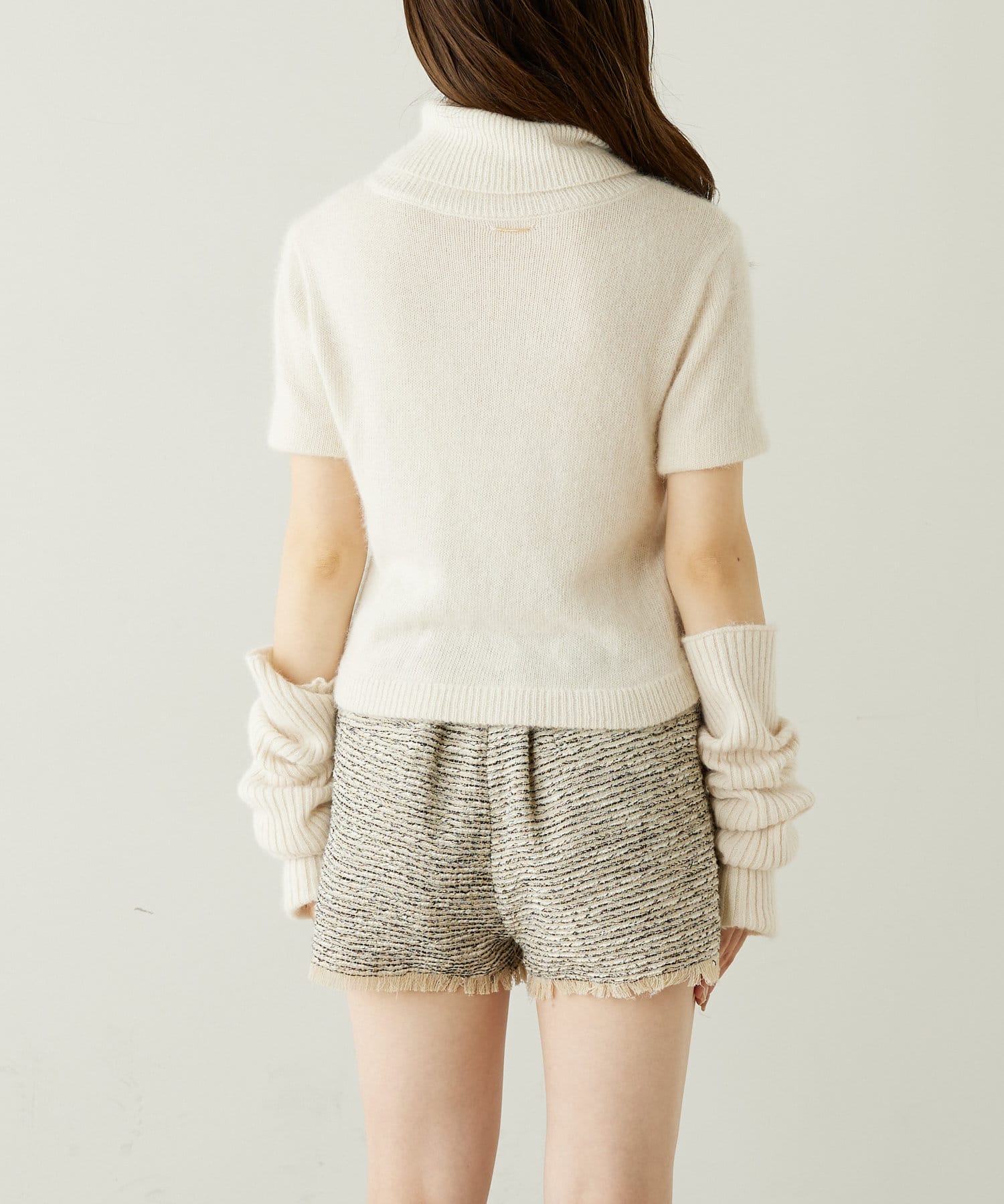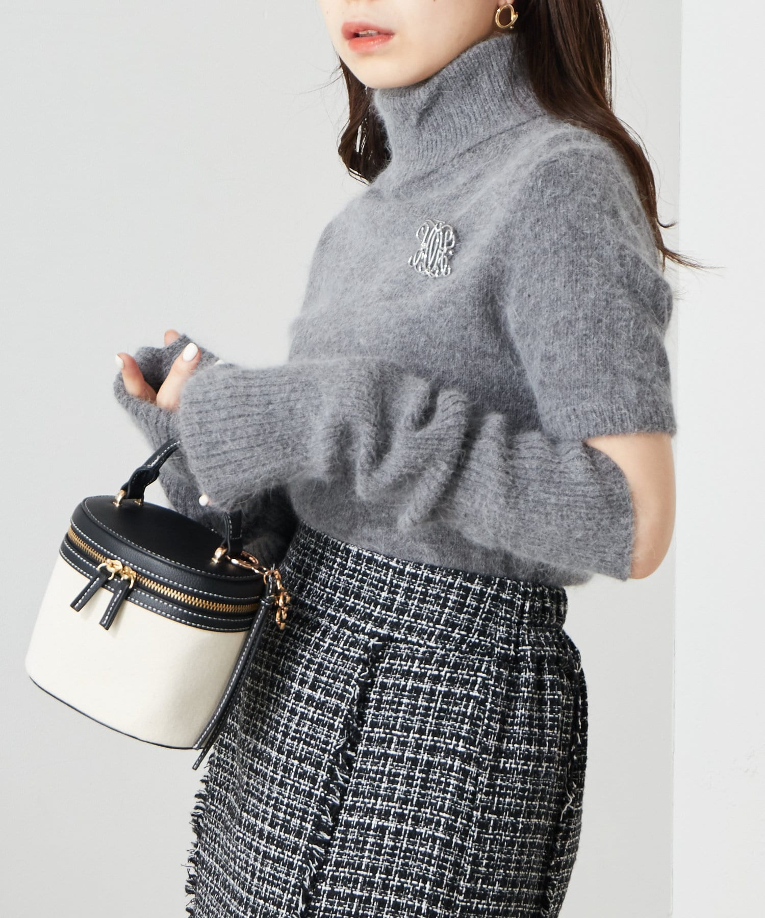 →アンゴラ素材を使ったふわふわな素材で、より甘めな印象に。バックにはゴールドのプレートが付いています。