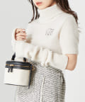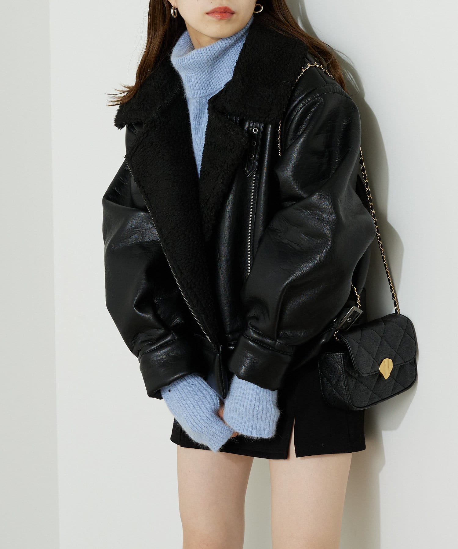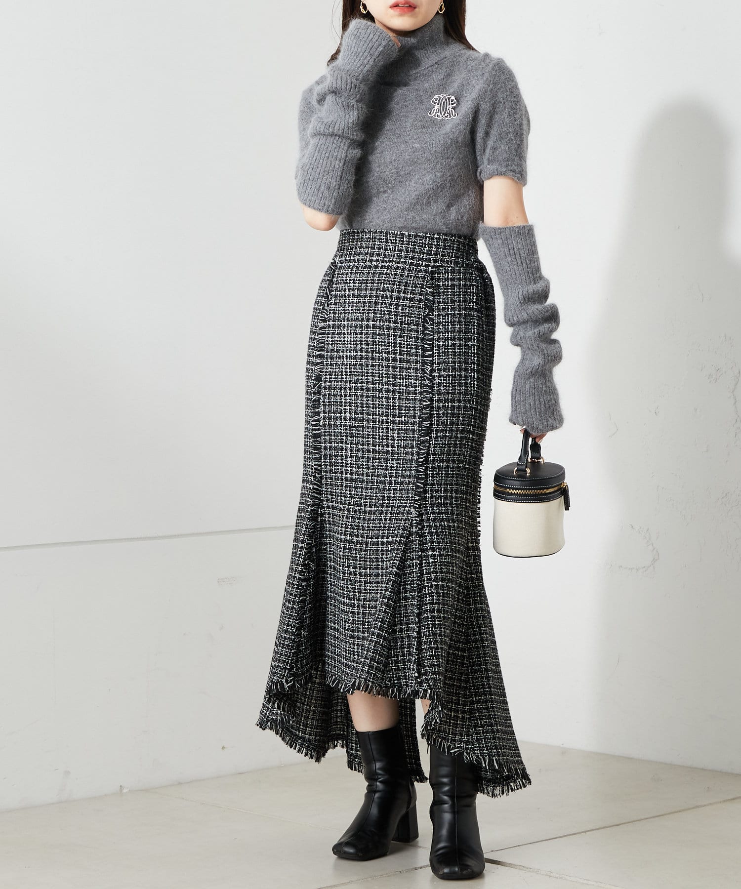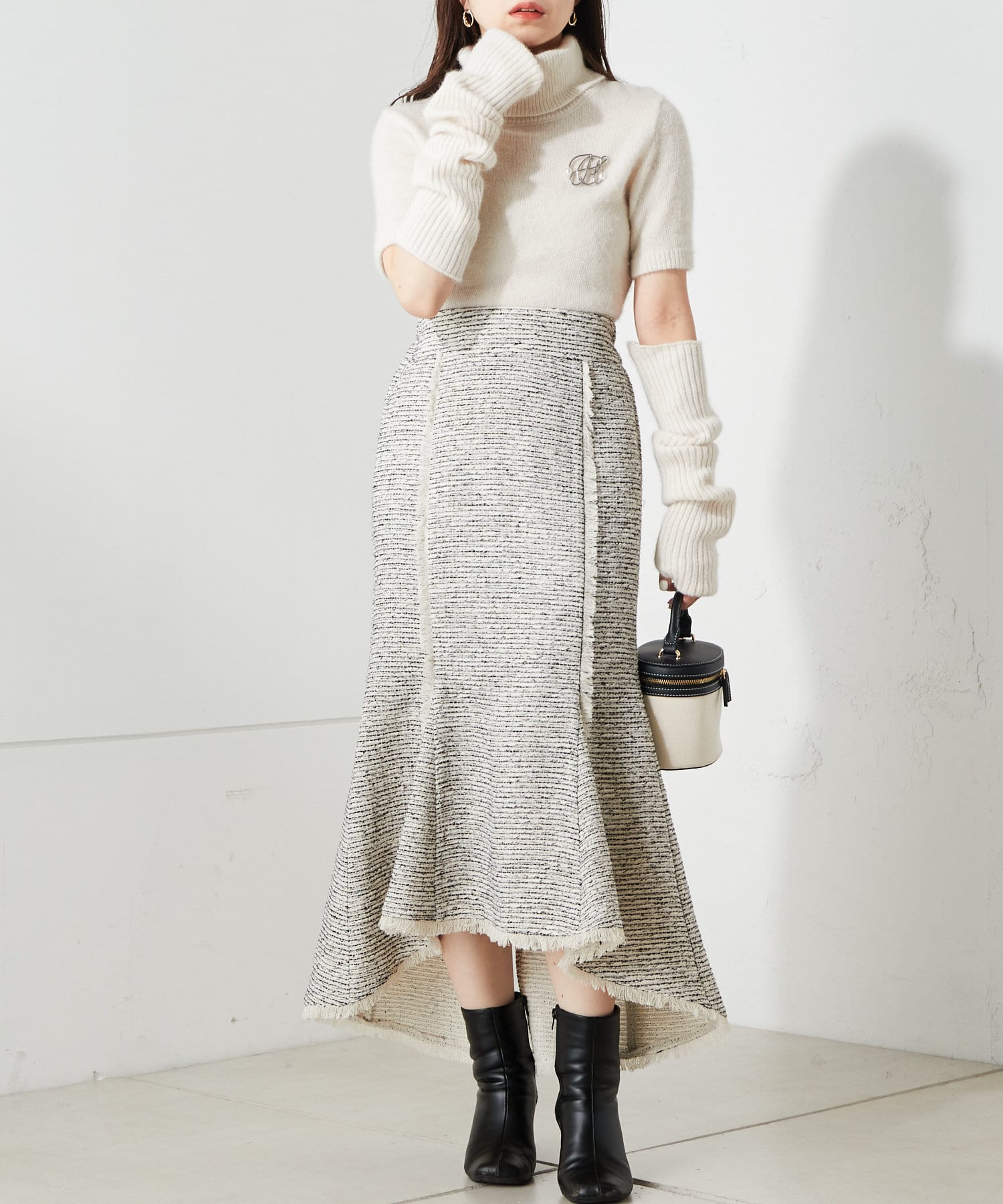 →アンゴラ素材を使ったふわふわな素材で、より甘めな印象に。バックにはゴールドのプレートが付いています。