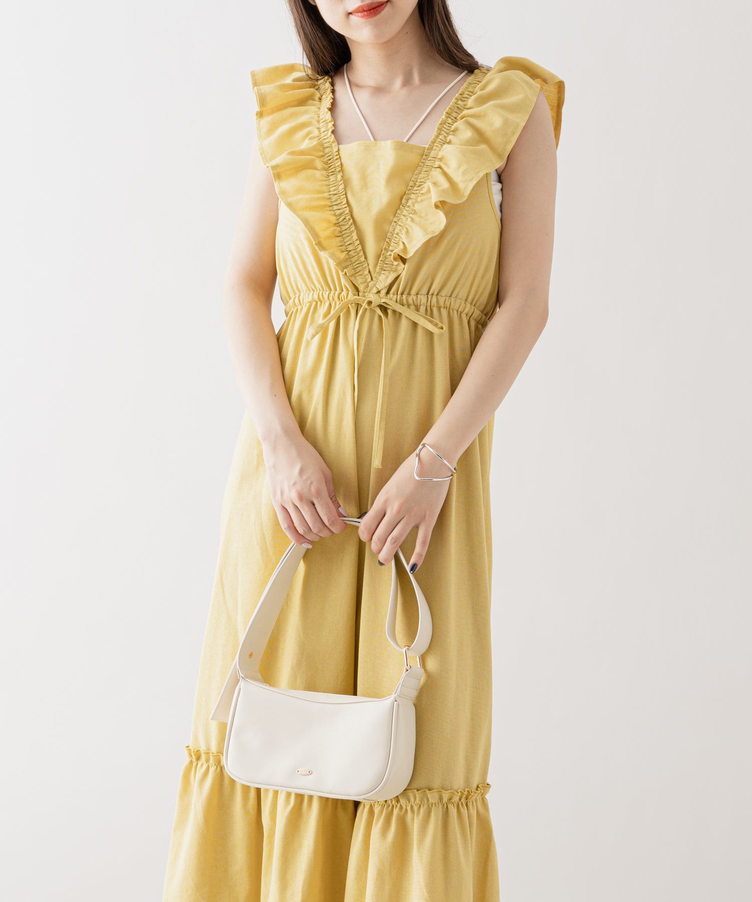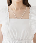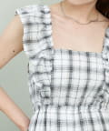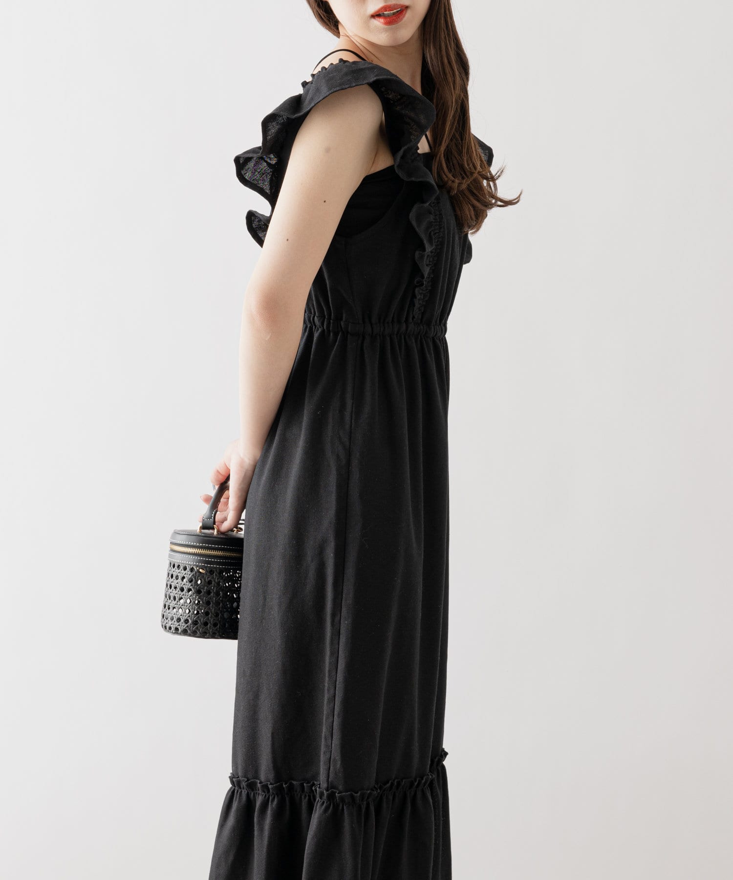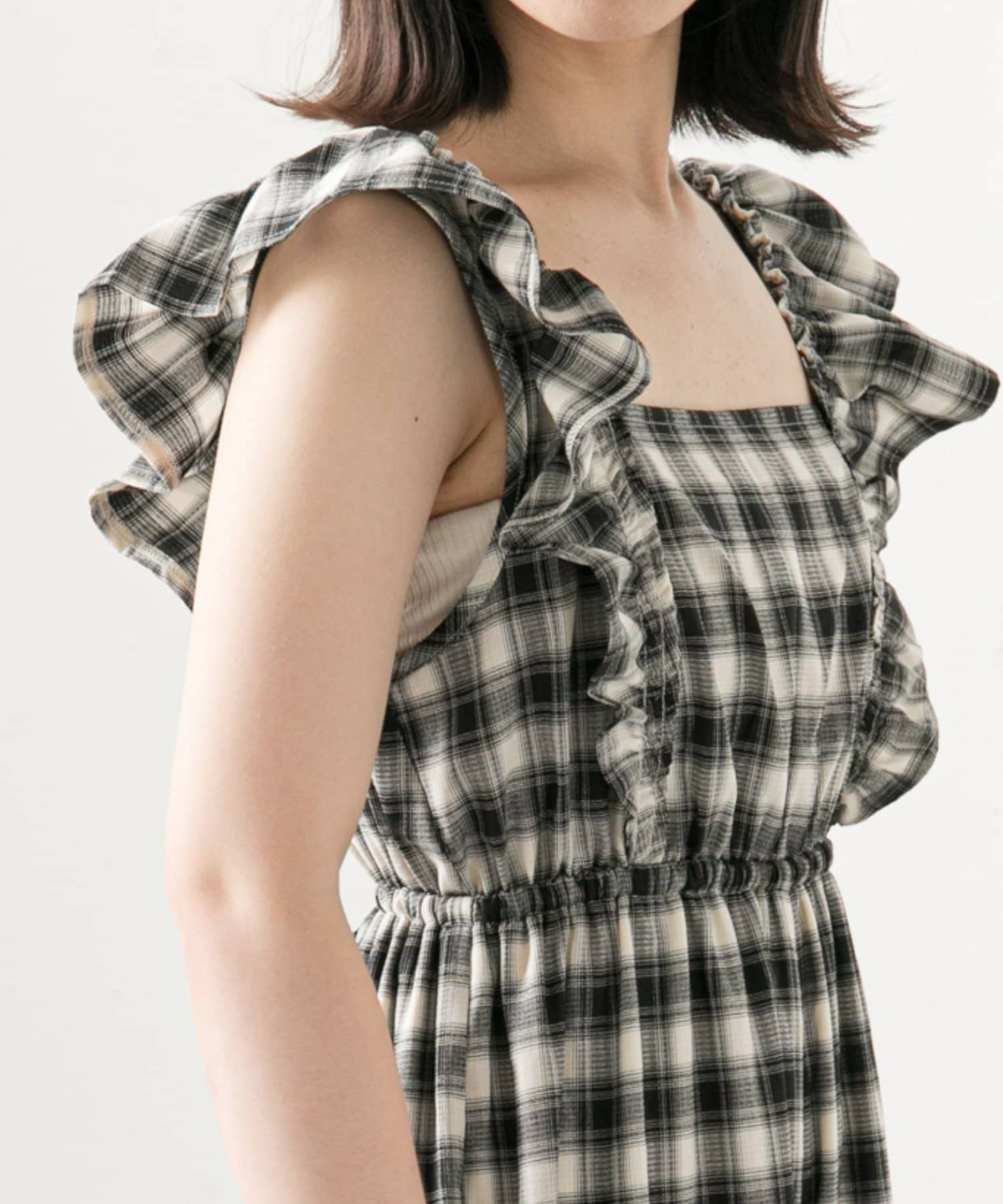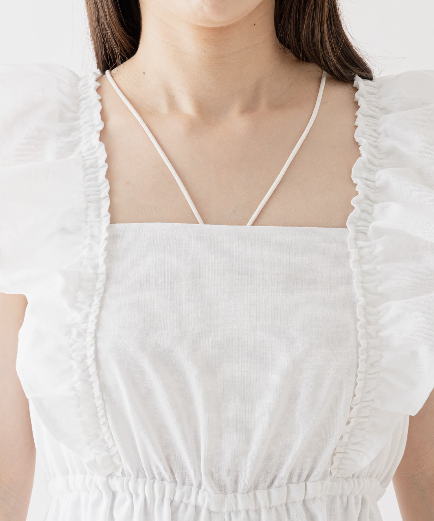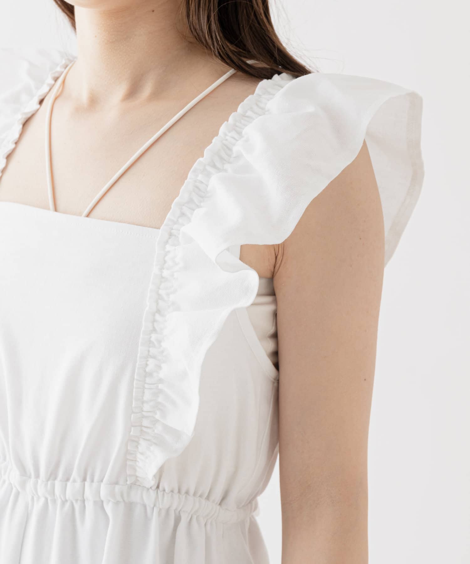 ・肩周りのフリルが腕周りを華奢に見せてくれ、1枚でも着やすいデザイン。