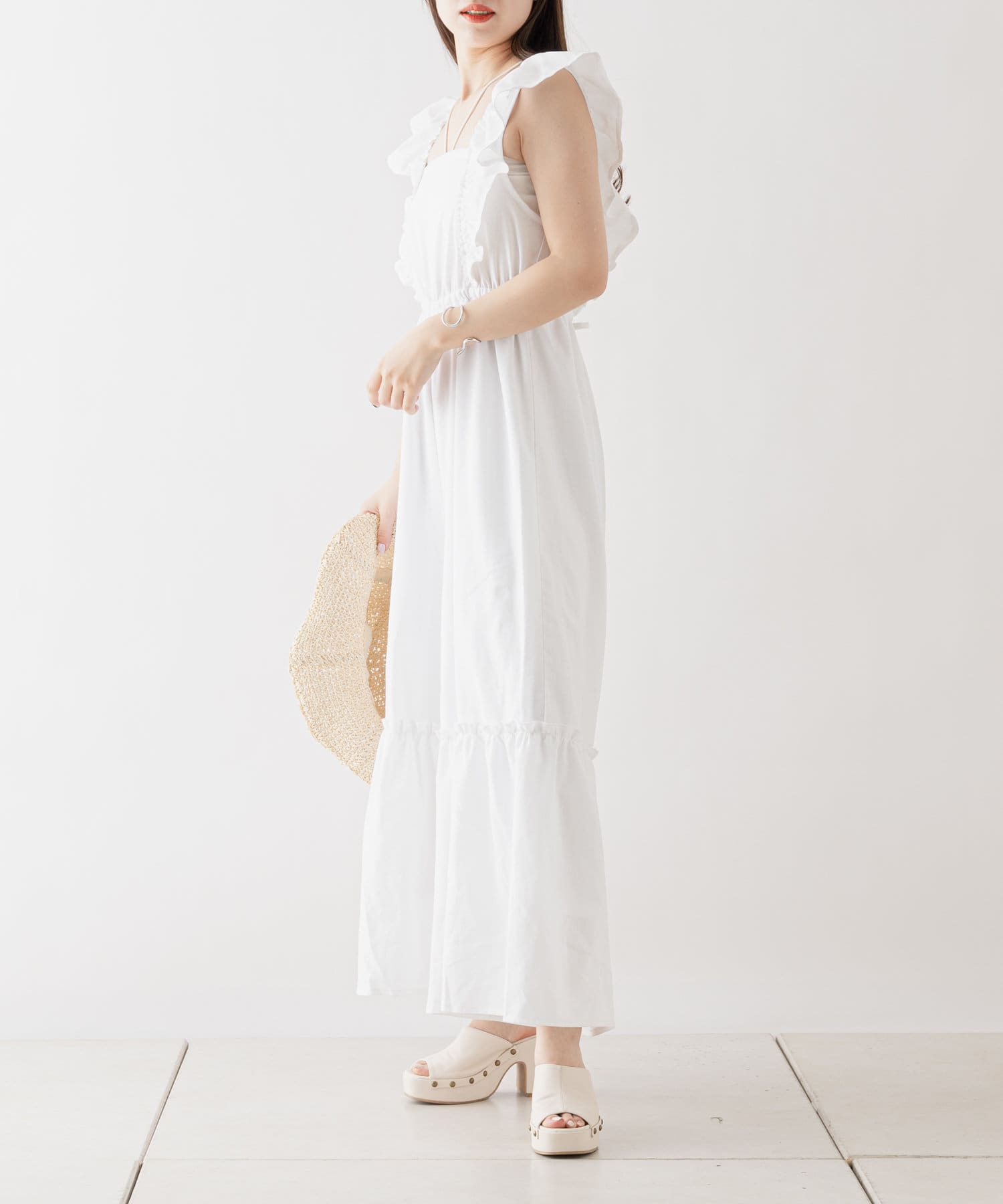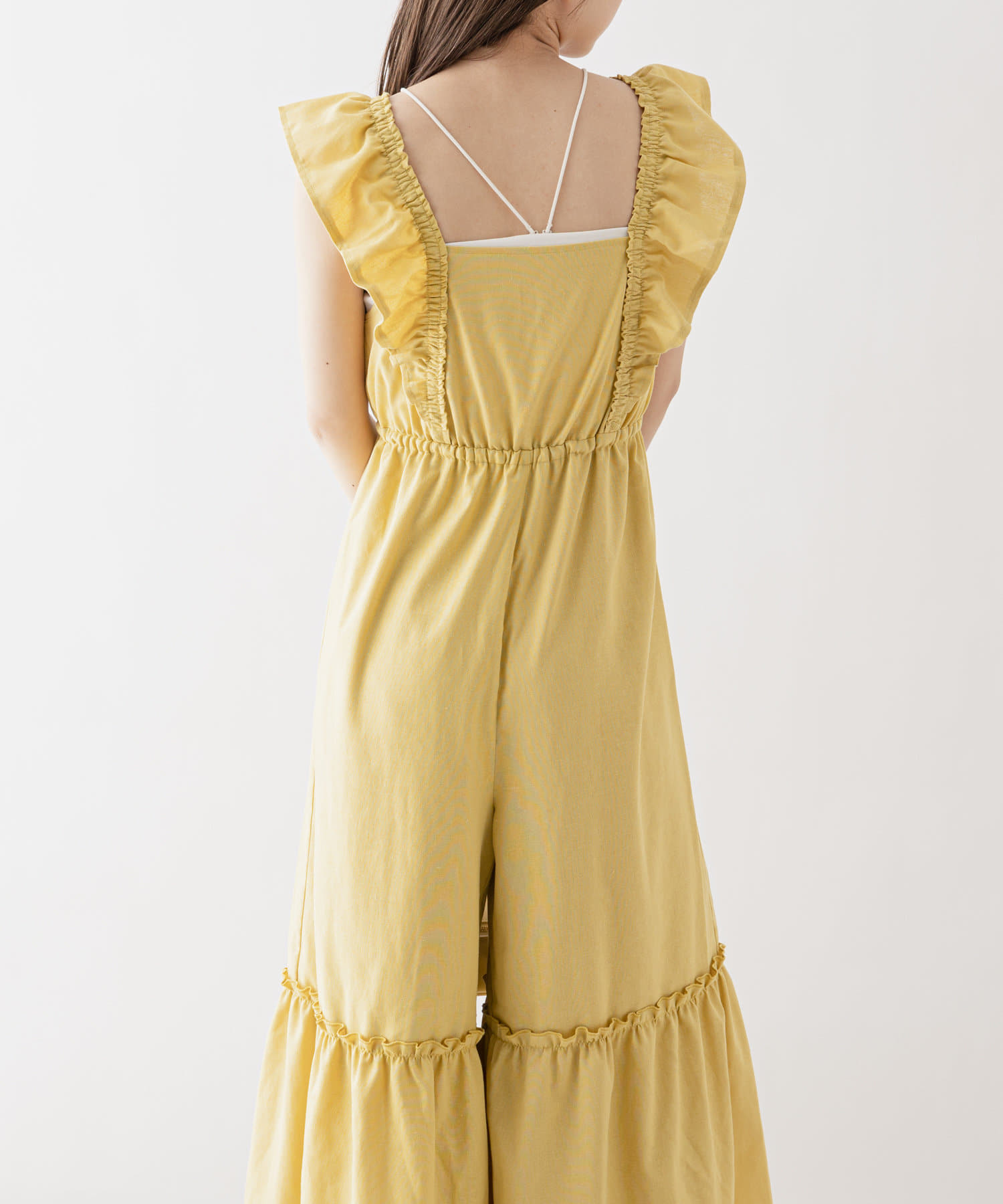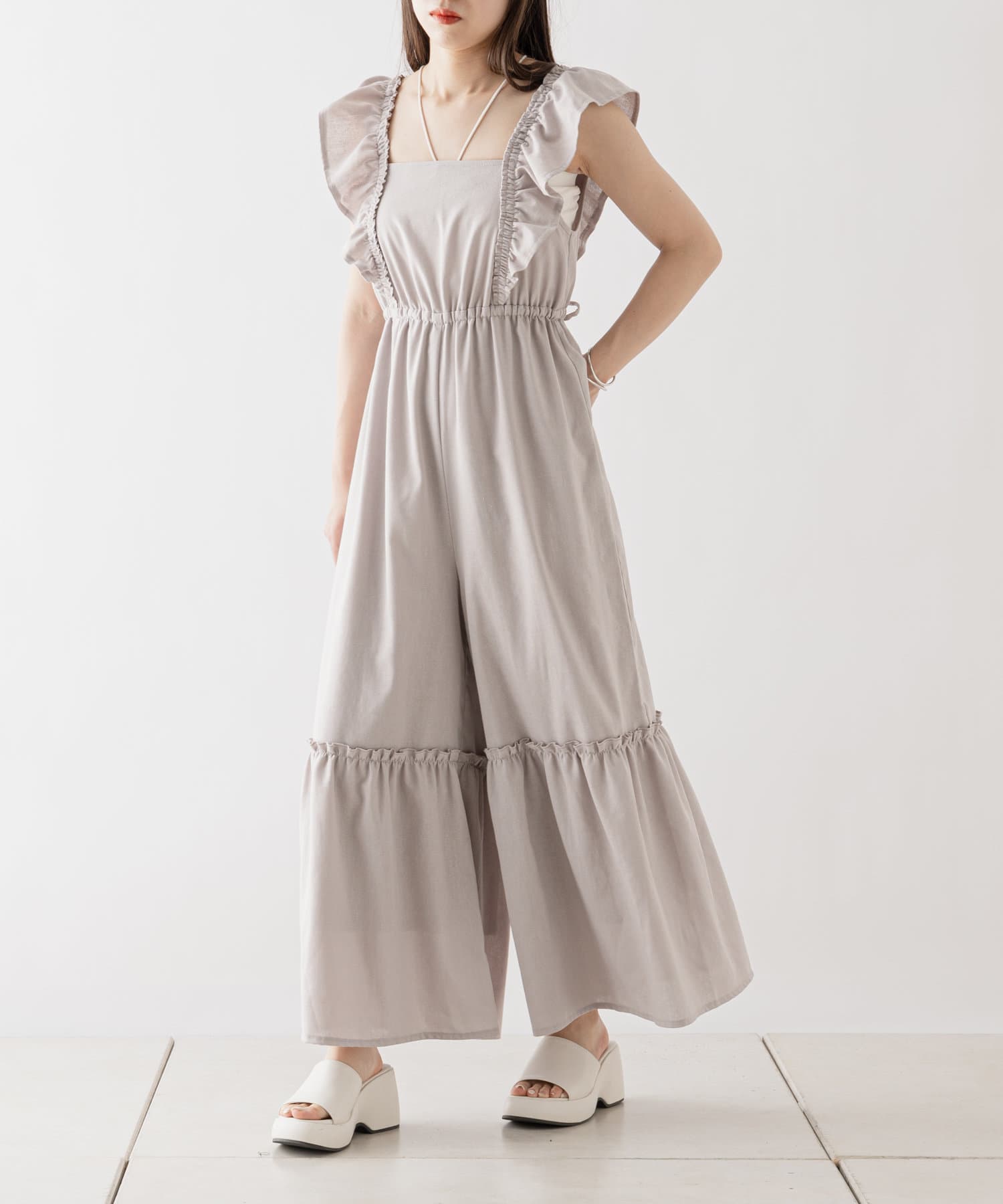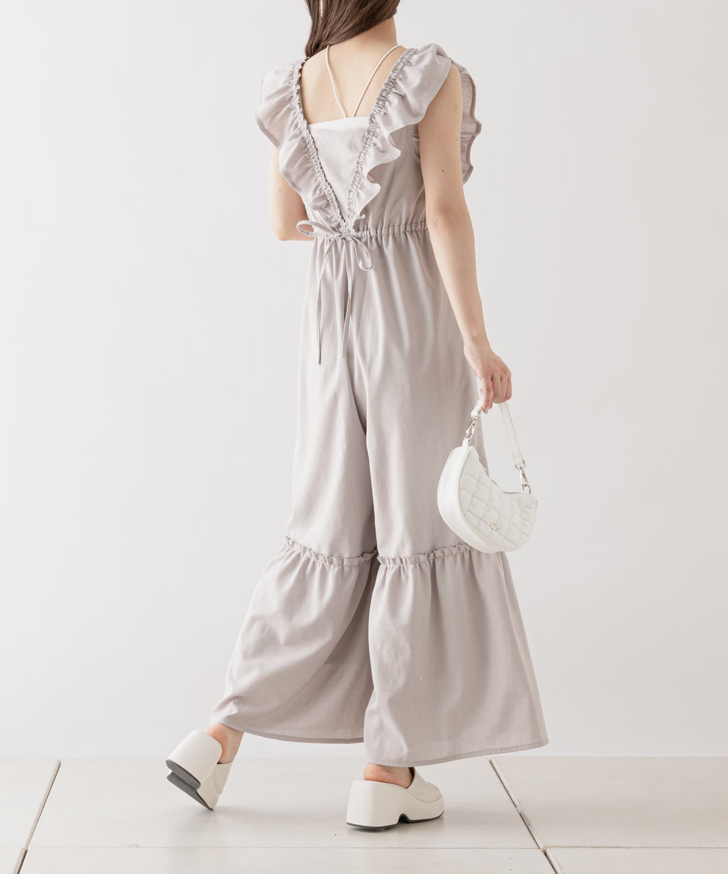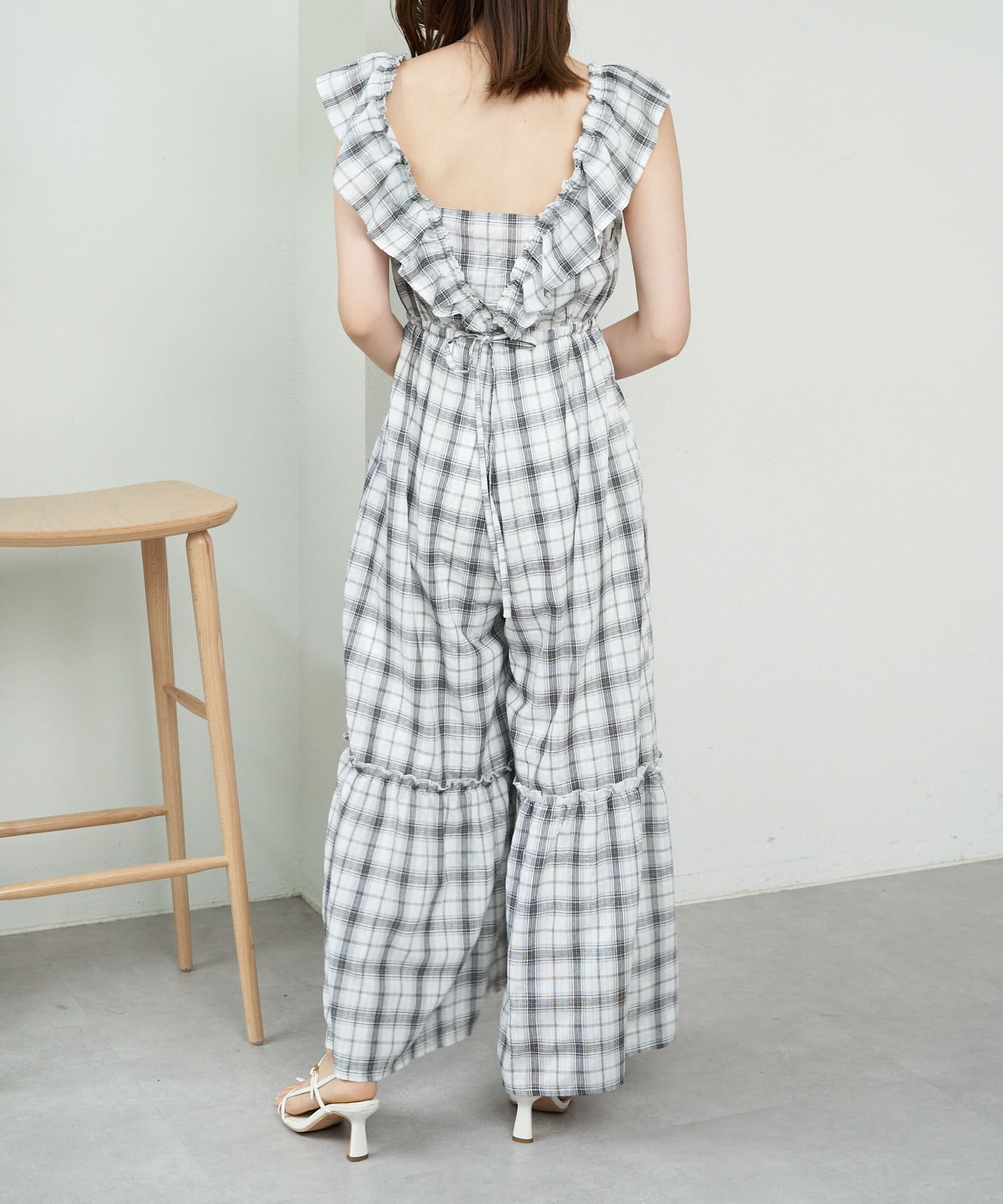 大胆なフリルが目を惹くサロペ