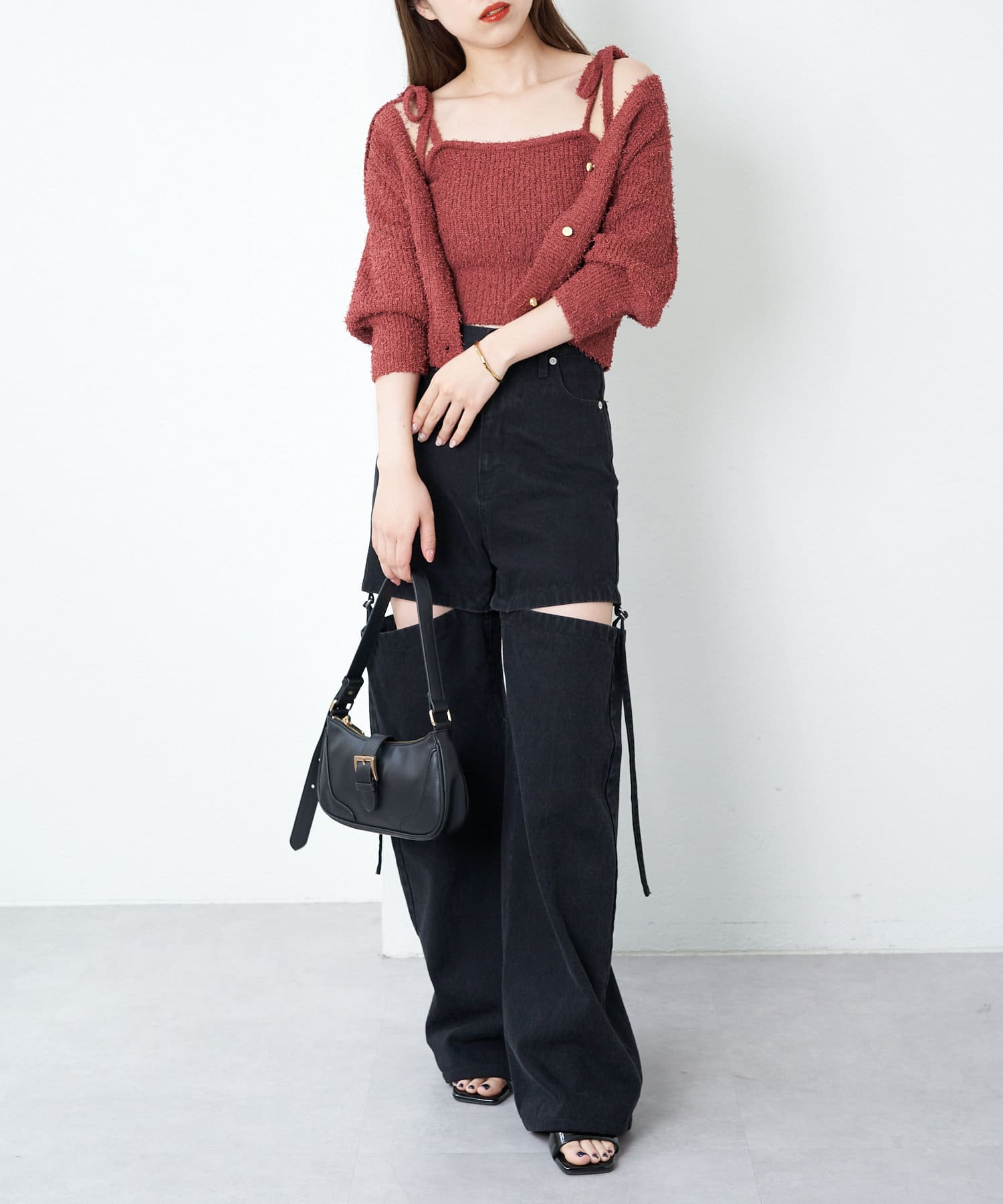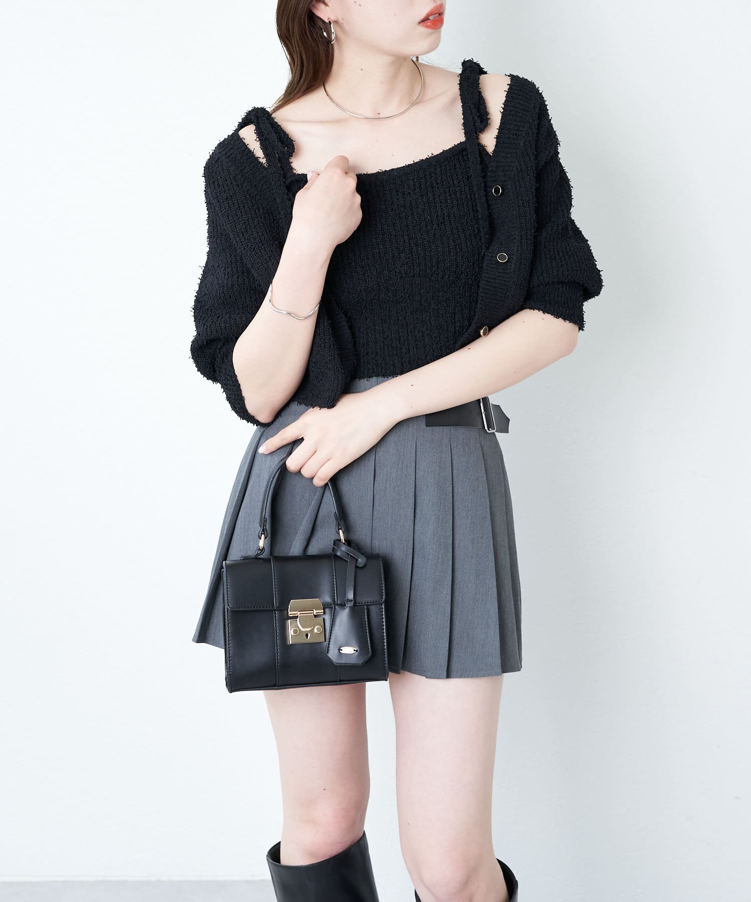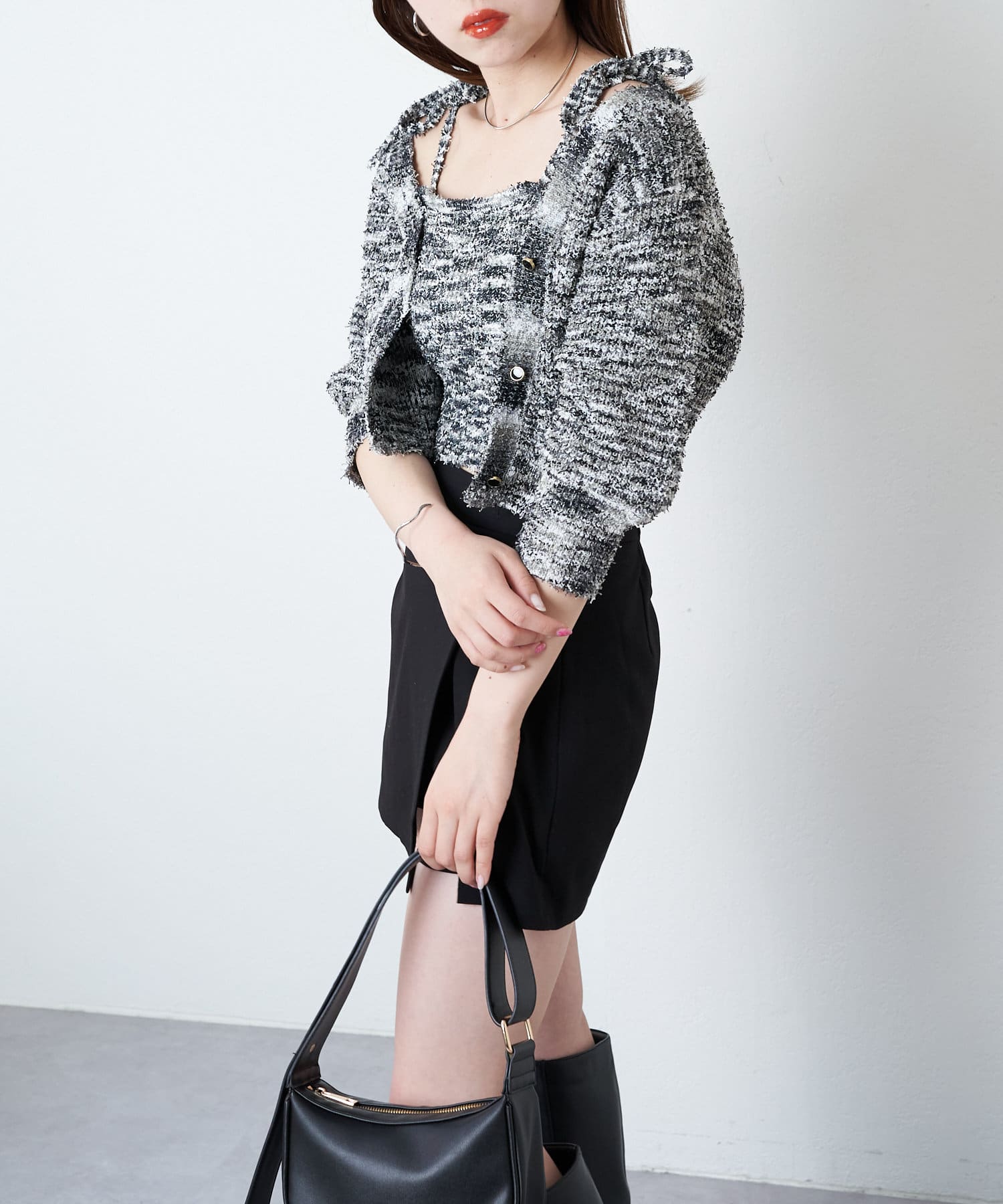 ・素材感と肩リボンのデザインが目を惹くカーデセット