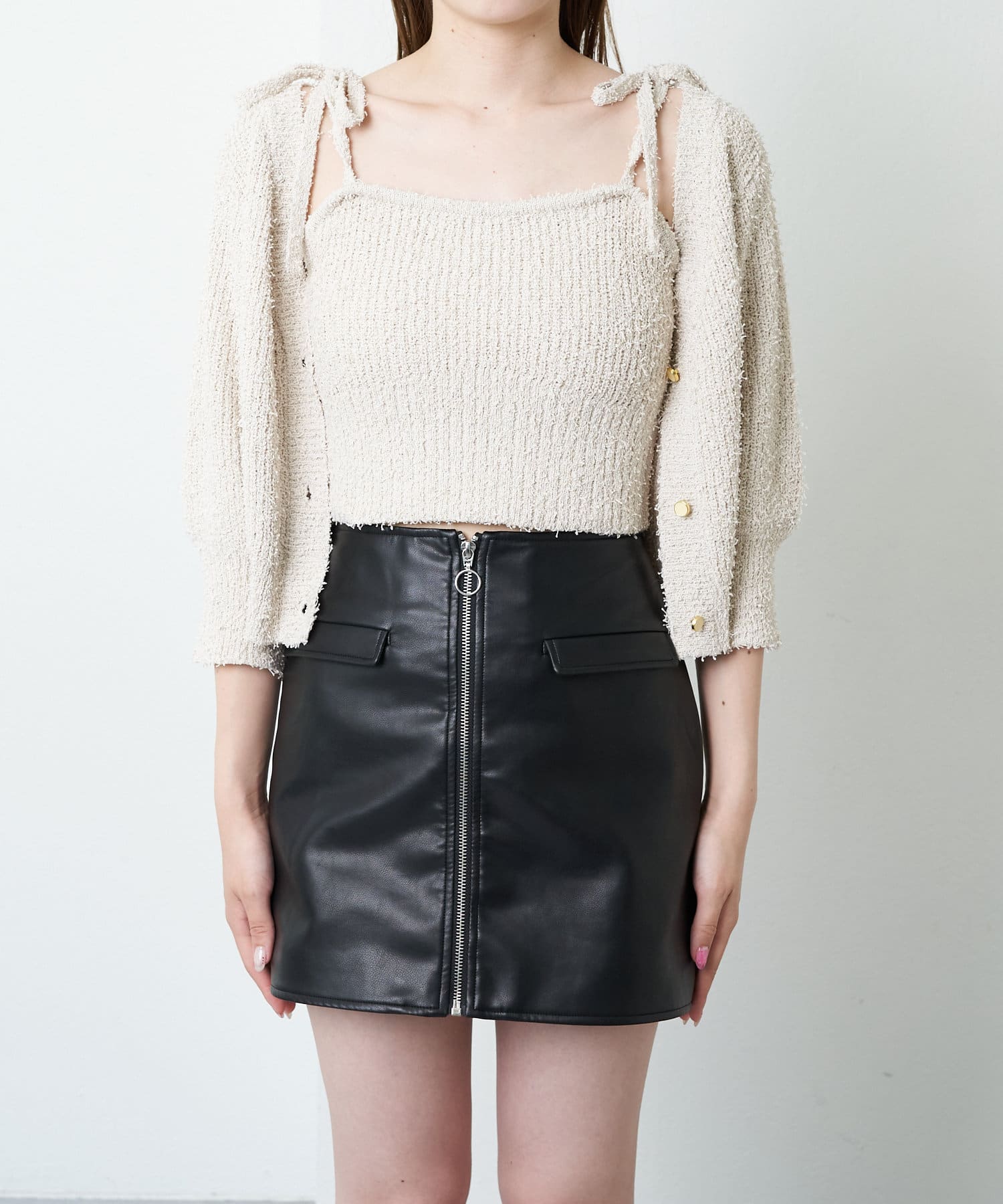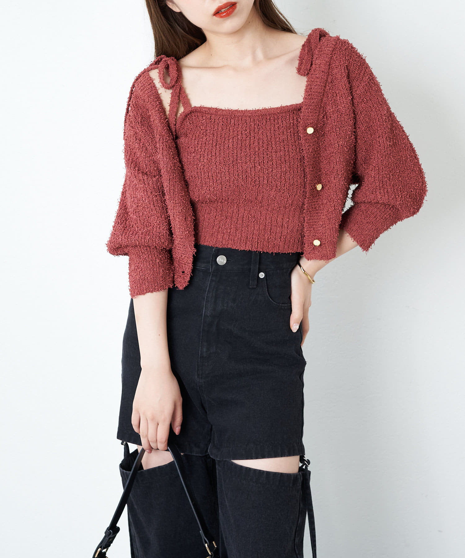 【Chico】5分袖テープヤーンカーデ+リボンキャミセット