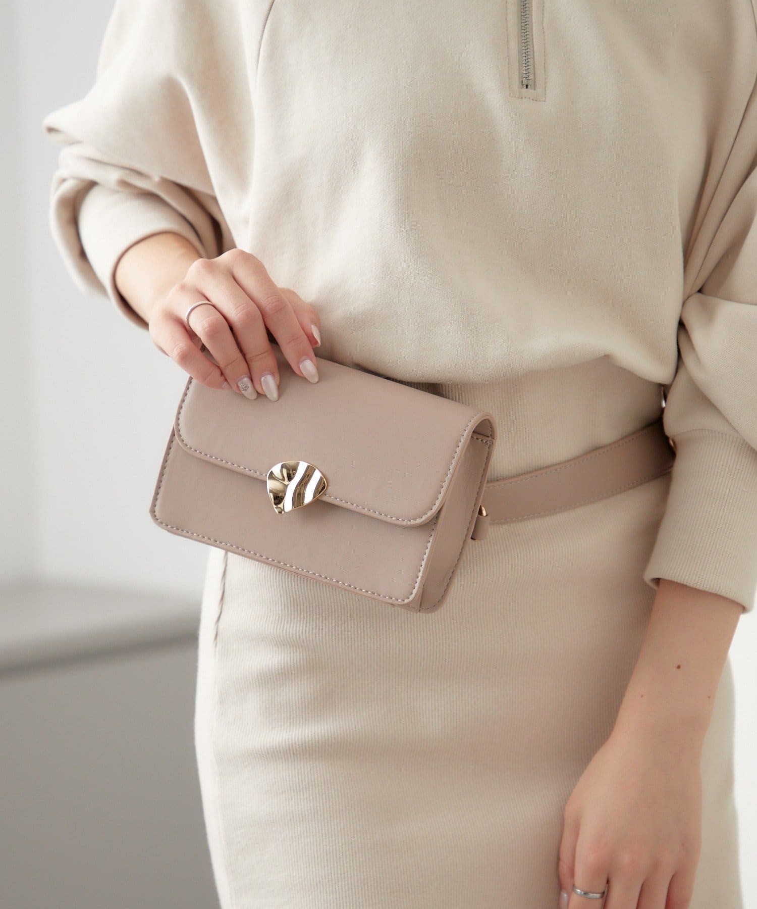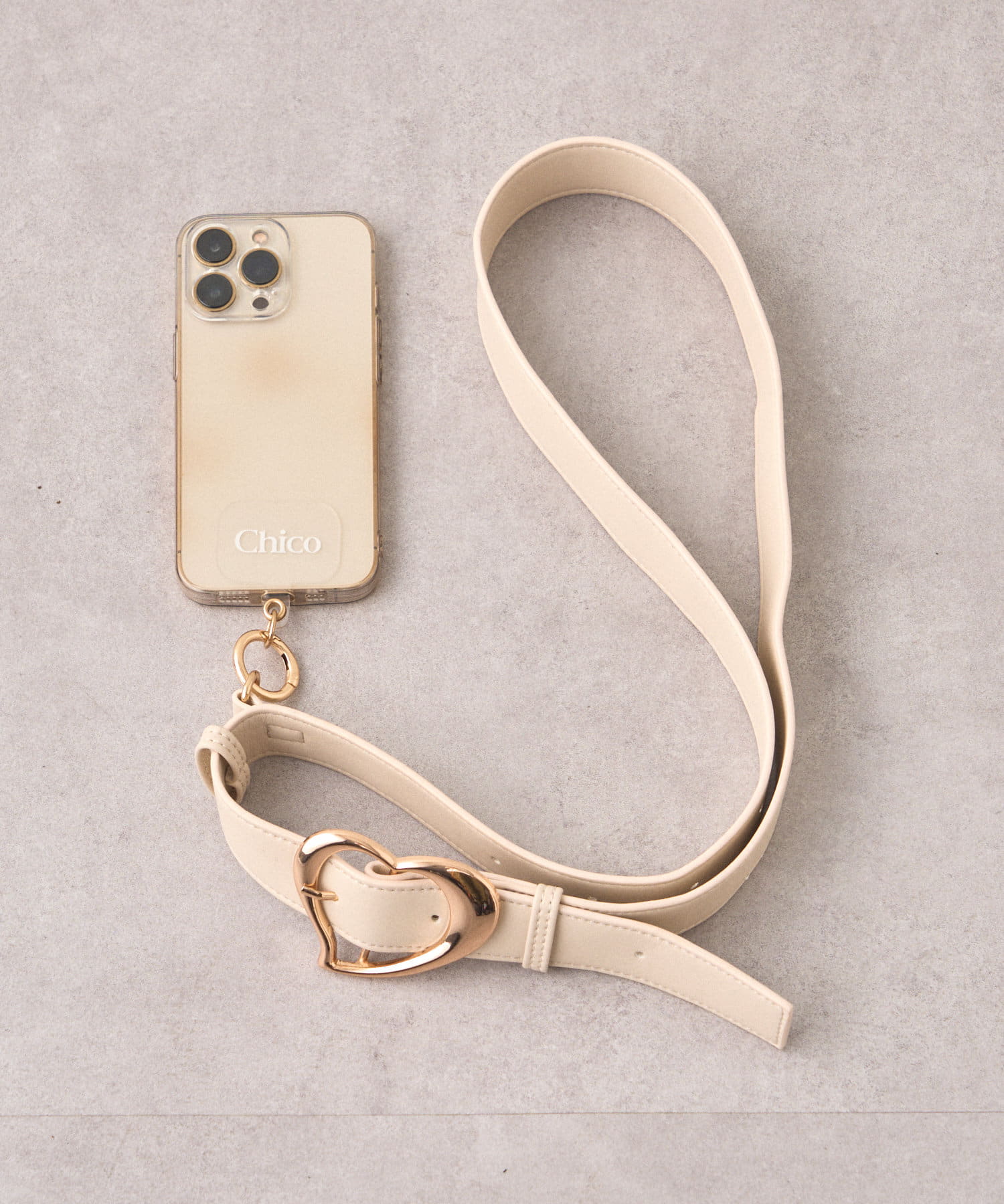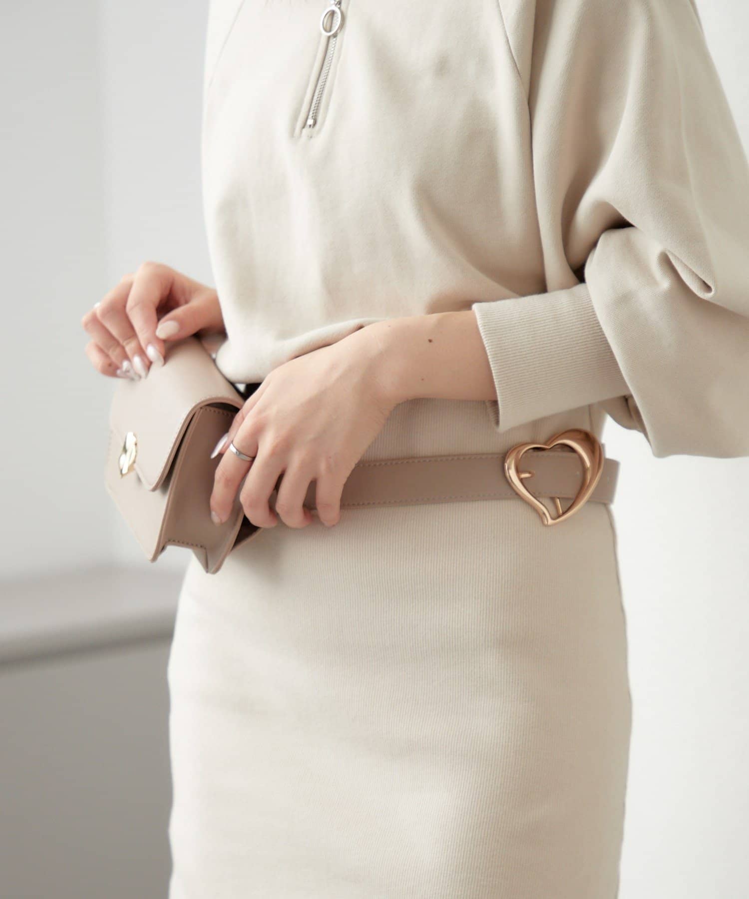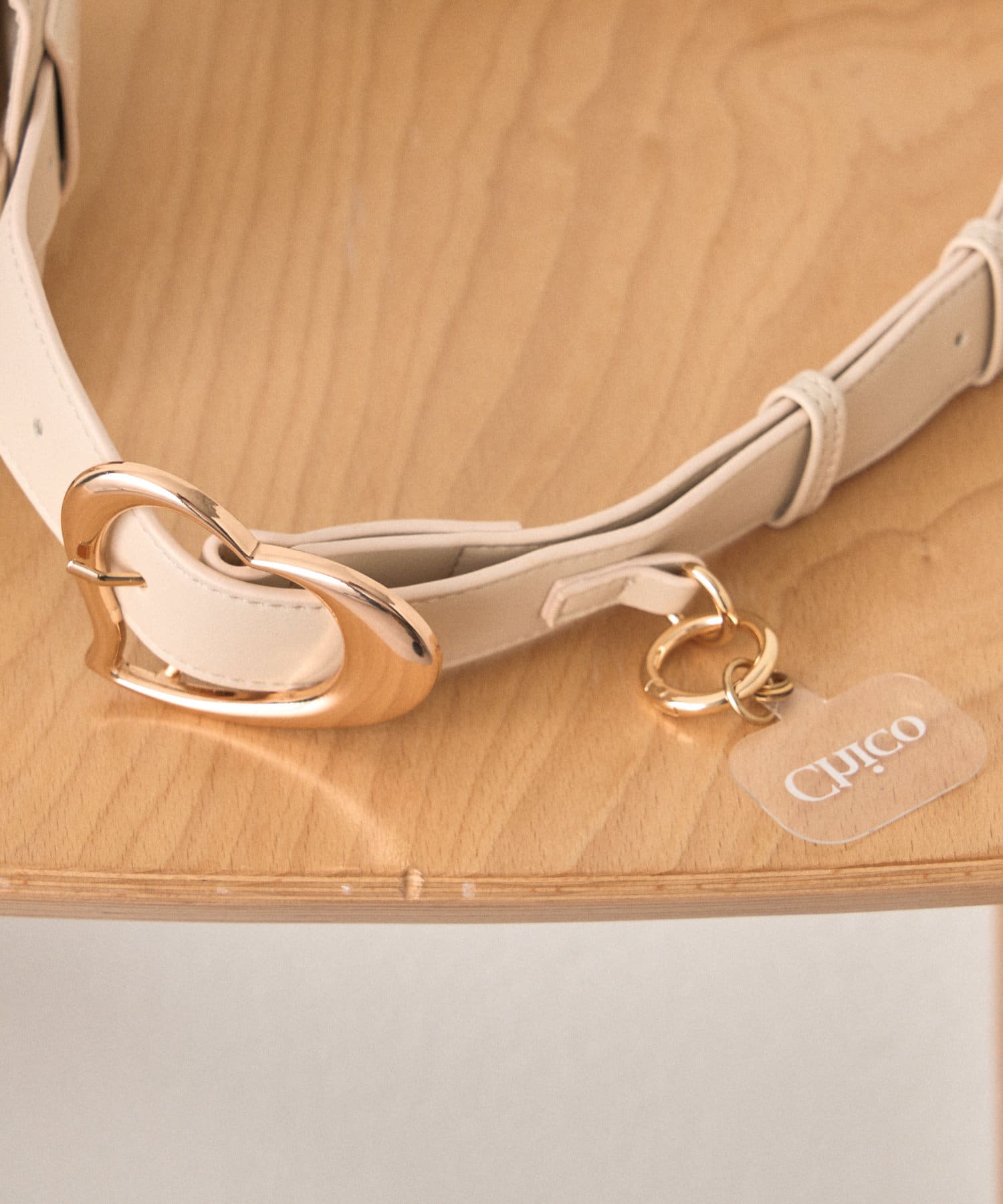 ハートモチーフのバックルがスタイリングのアクセントに。