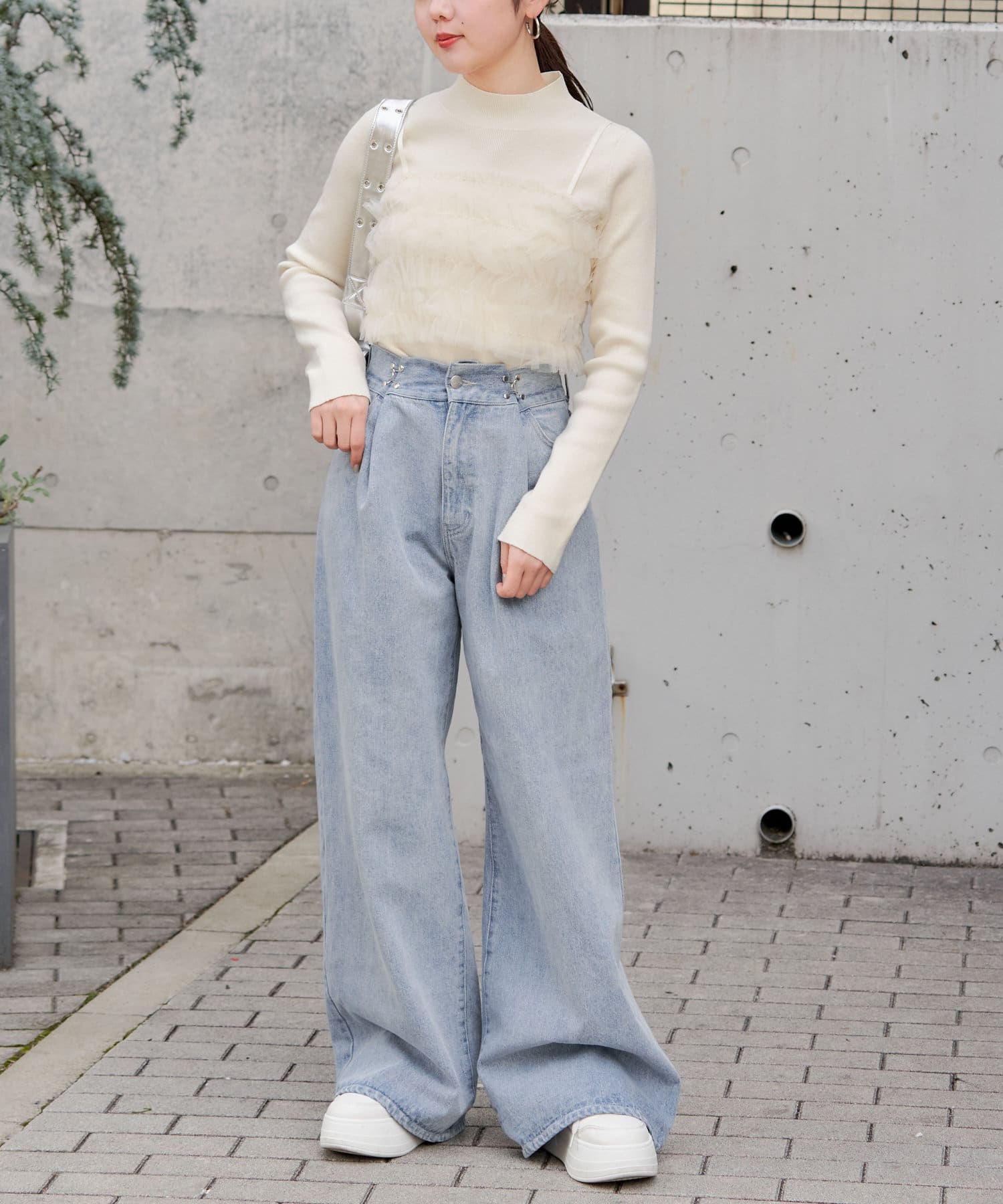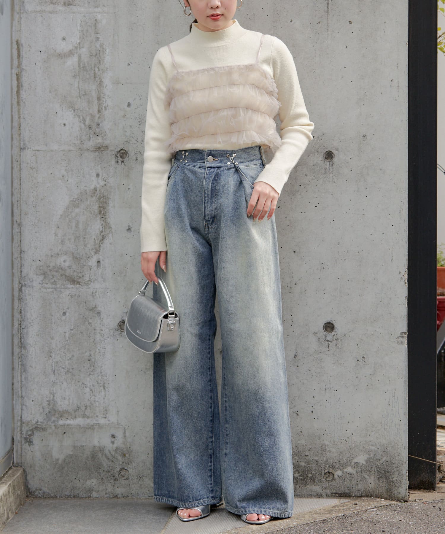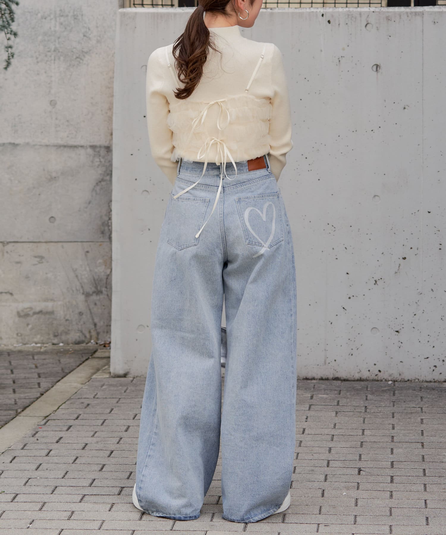 ▶おすすめアイテム:ハートプリントボックスワイドデニムパンツ ウエストベルトデザインワイドスラックスパンツ