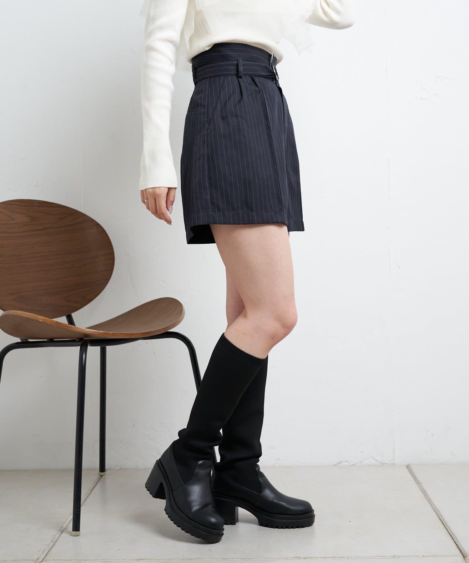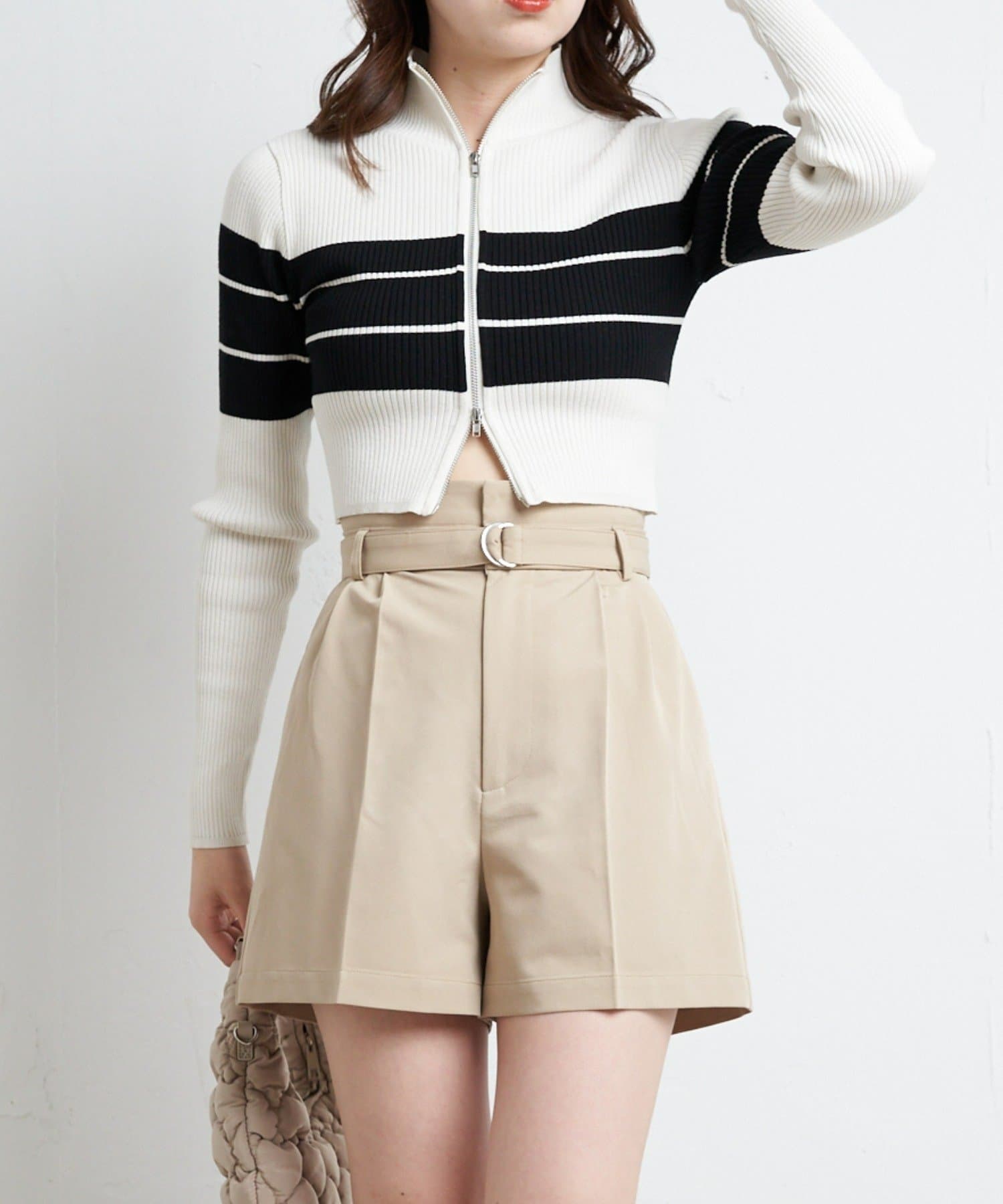 ・トレンドのショートトップスと合わせてウエストのデザインを見せて着るのも◎
