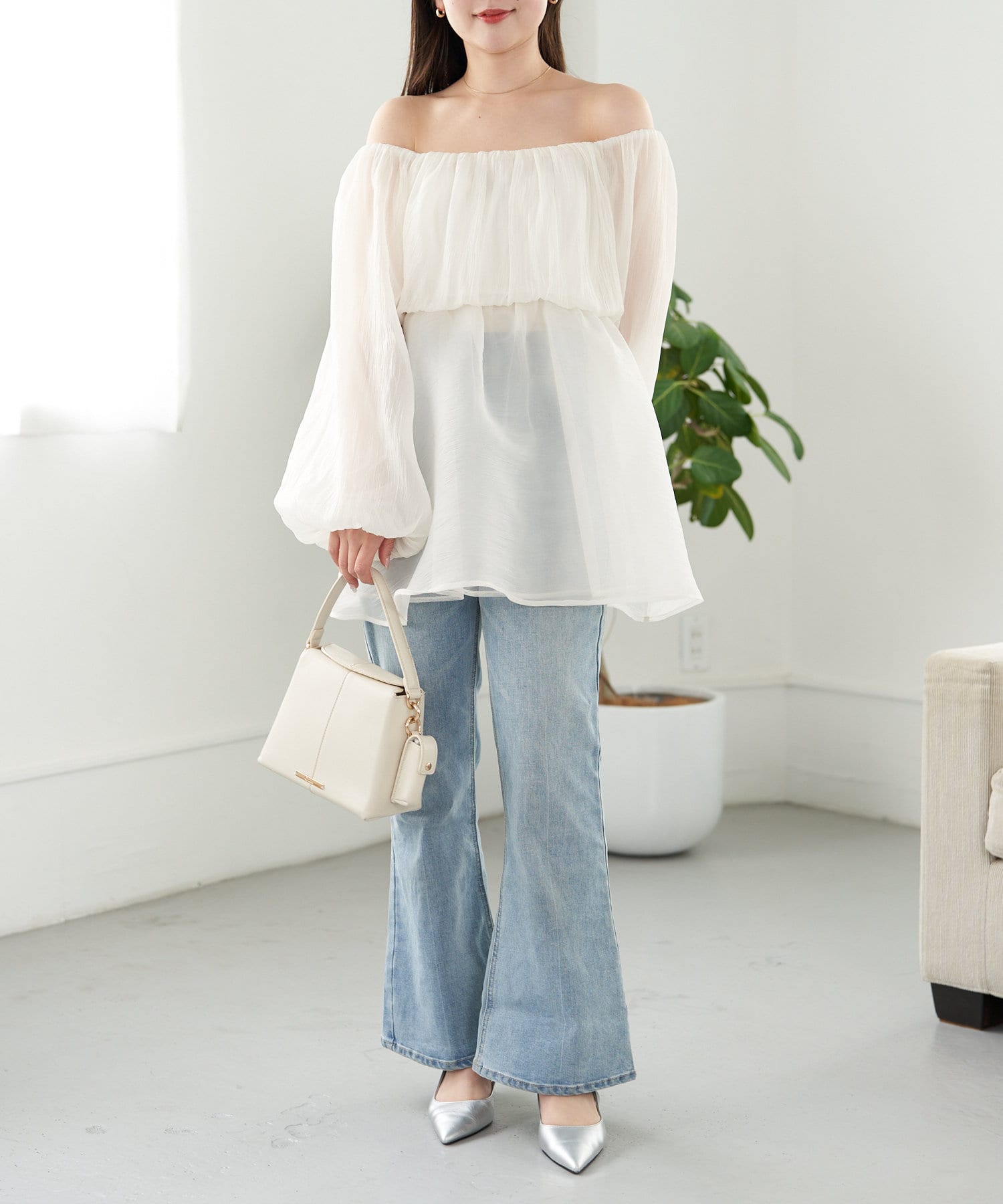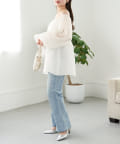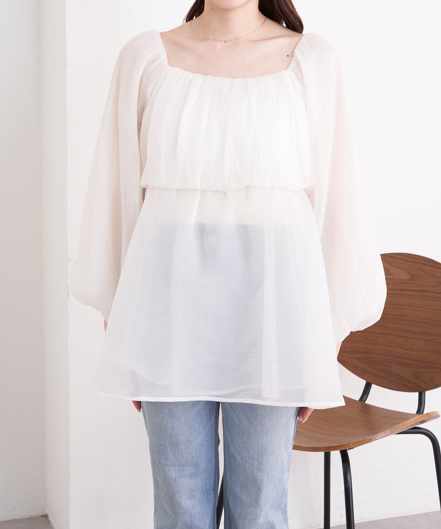 ・程よい透け感でデニム合わせでも抜け感のある女性らしいコーデに。