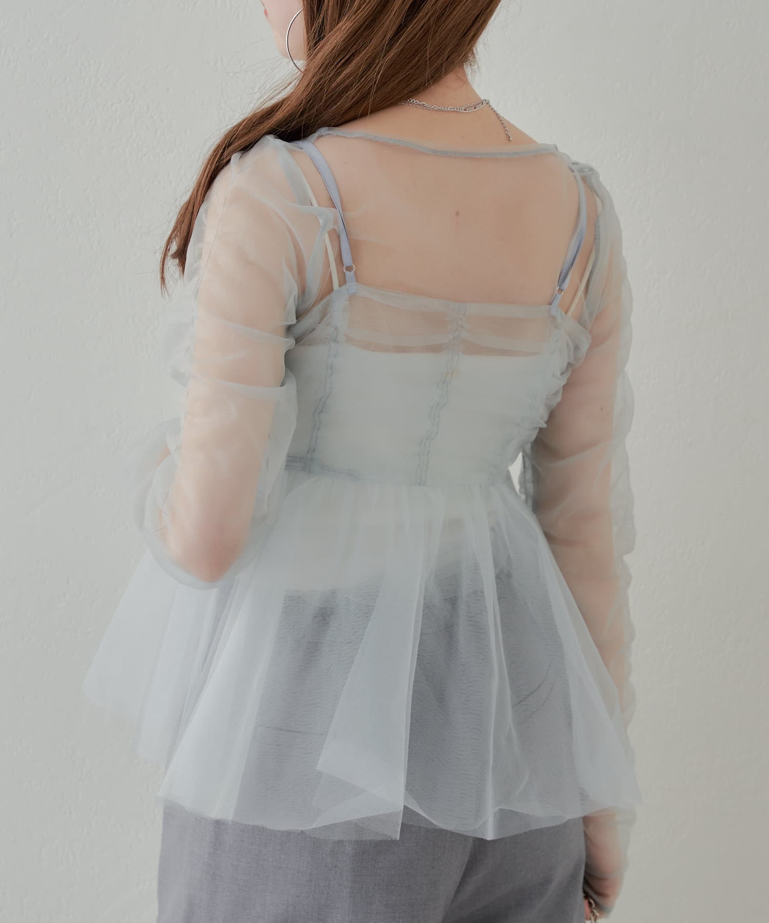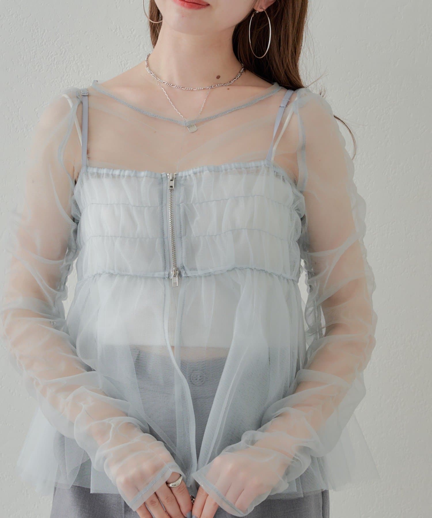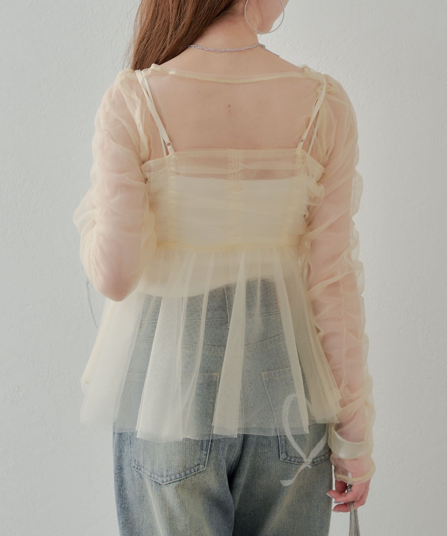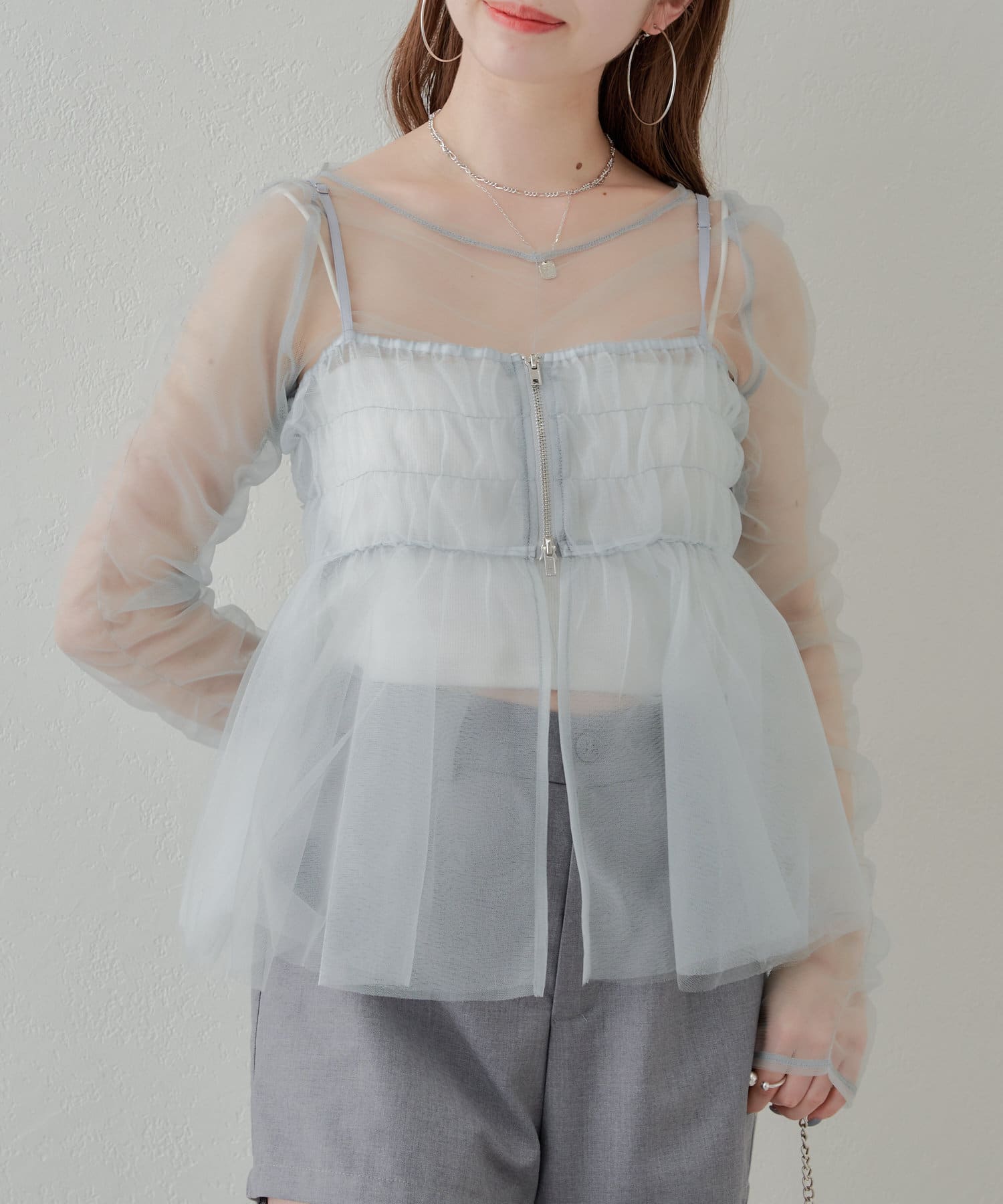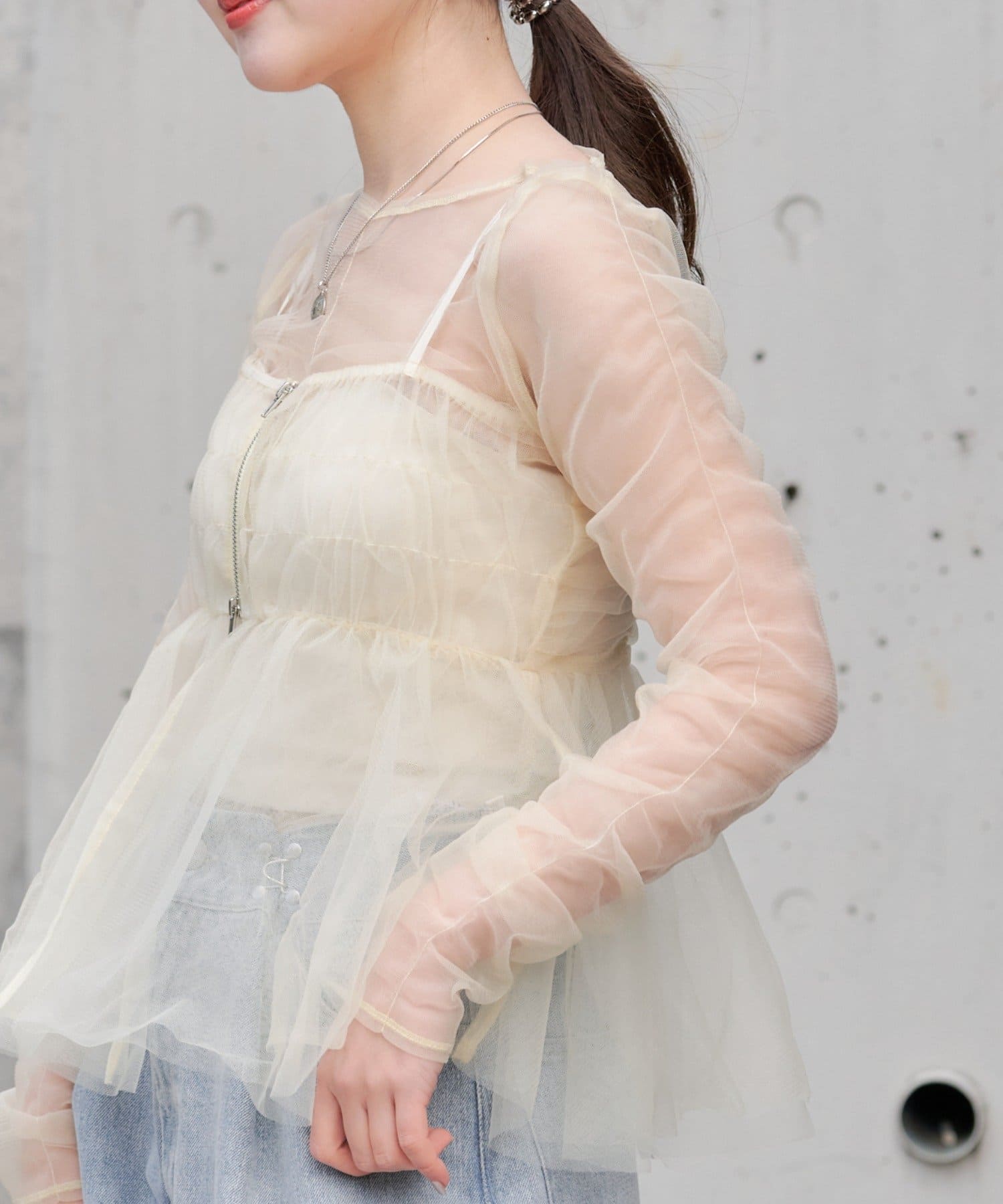華やかなチュールキャミとシアートップスのセットアイテム