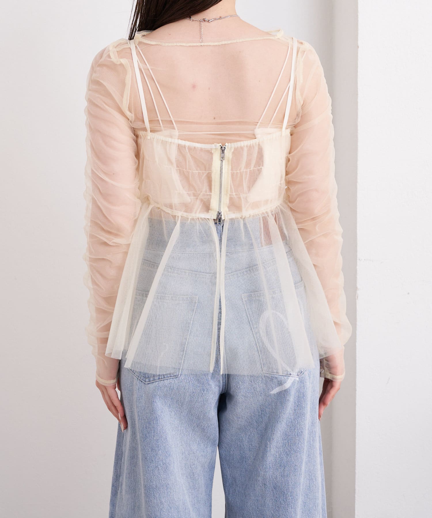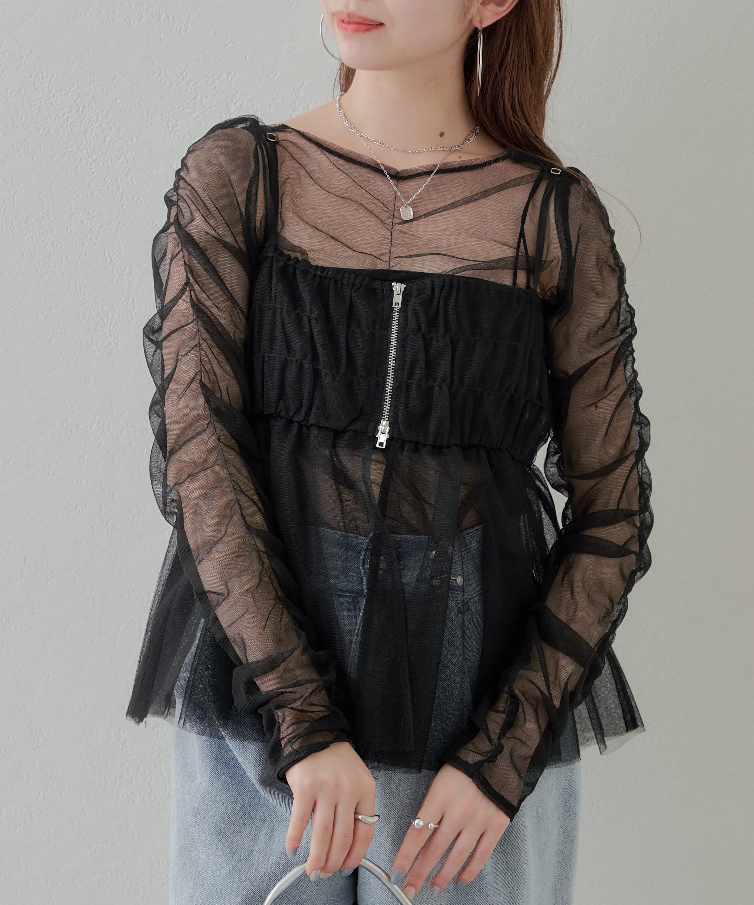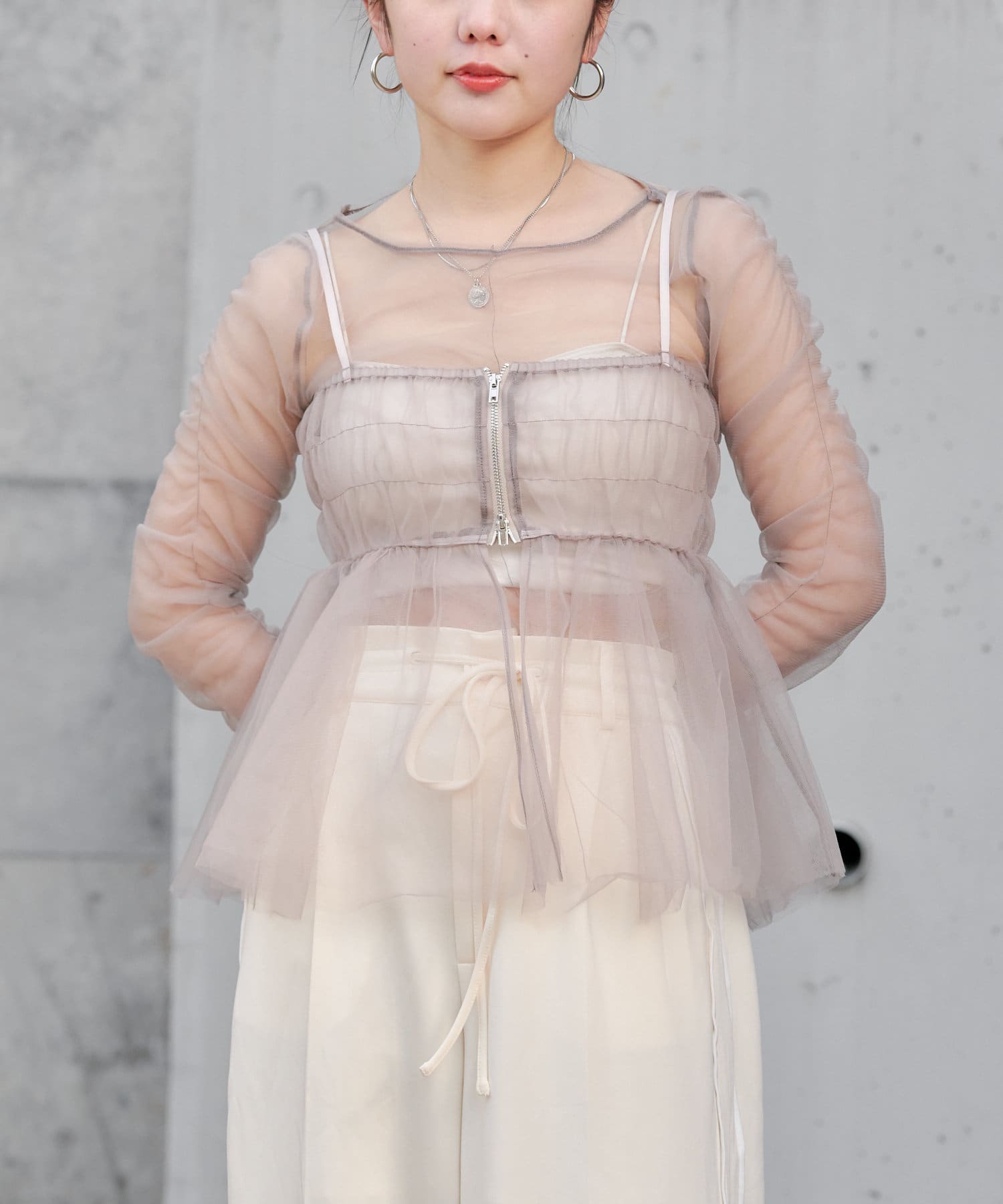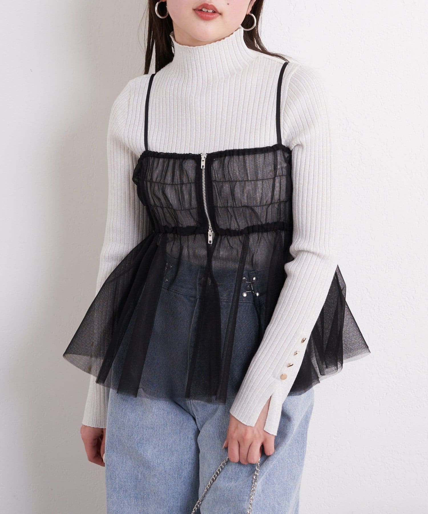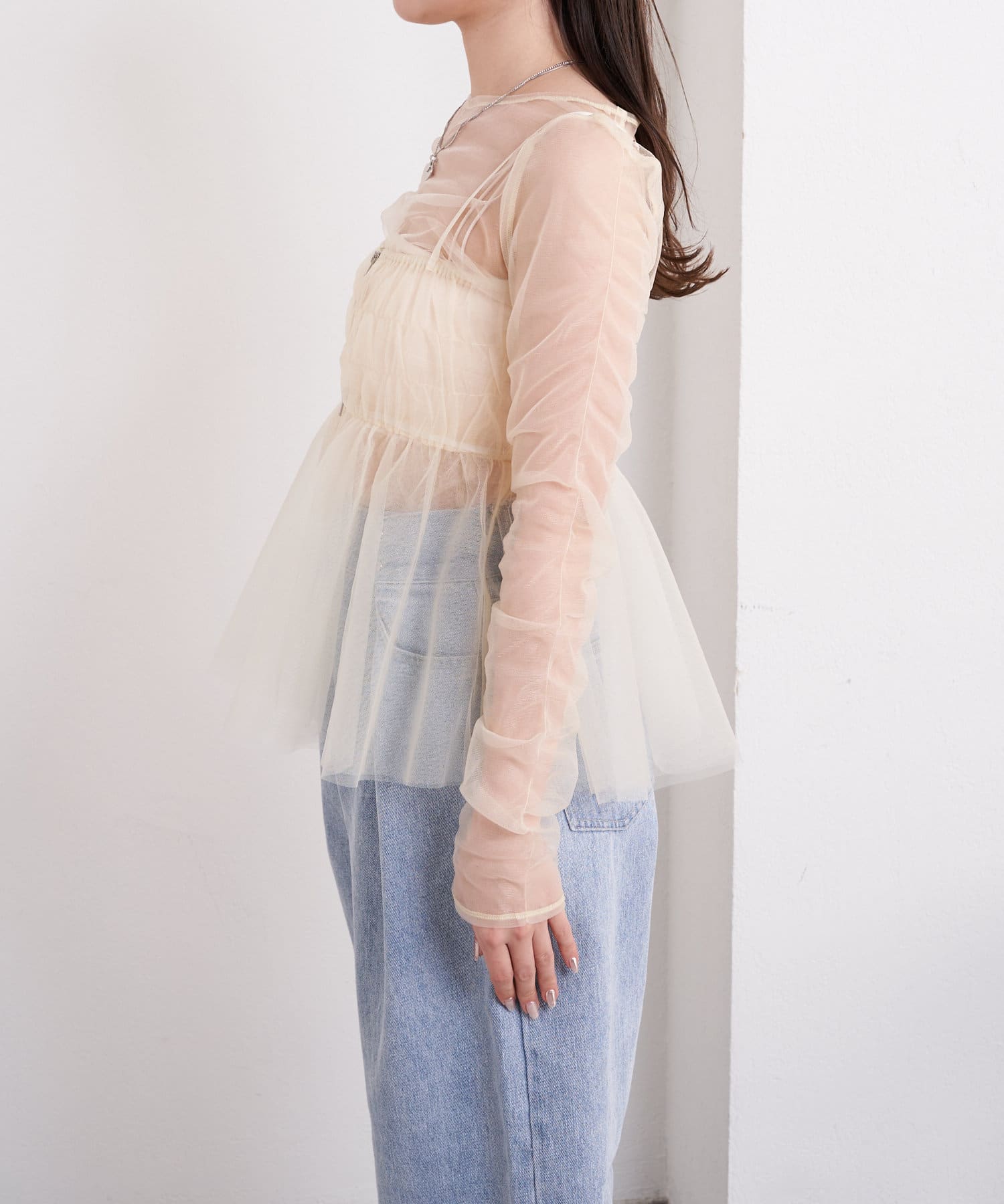 華やかなチュールキャミとシアートップスのセットアイテム