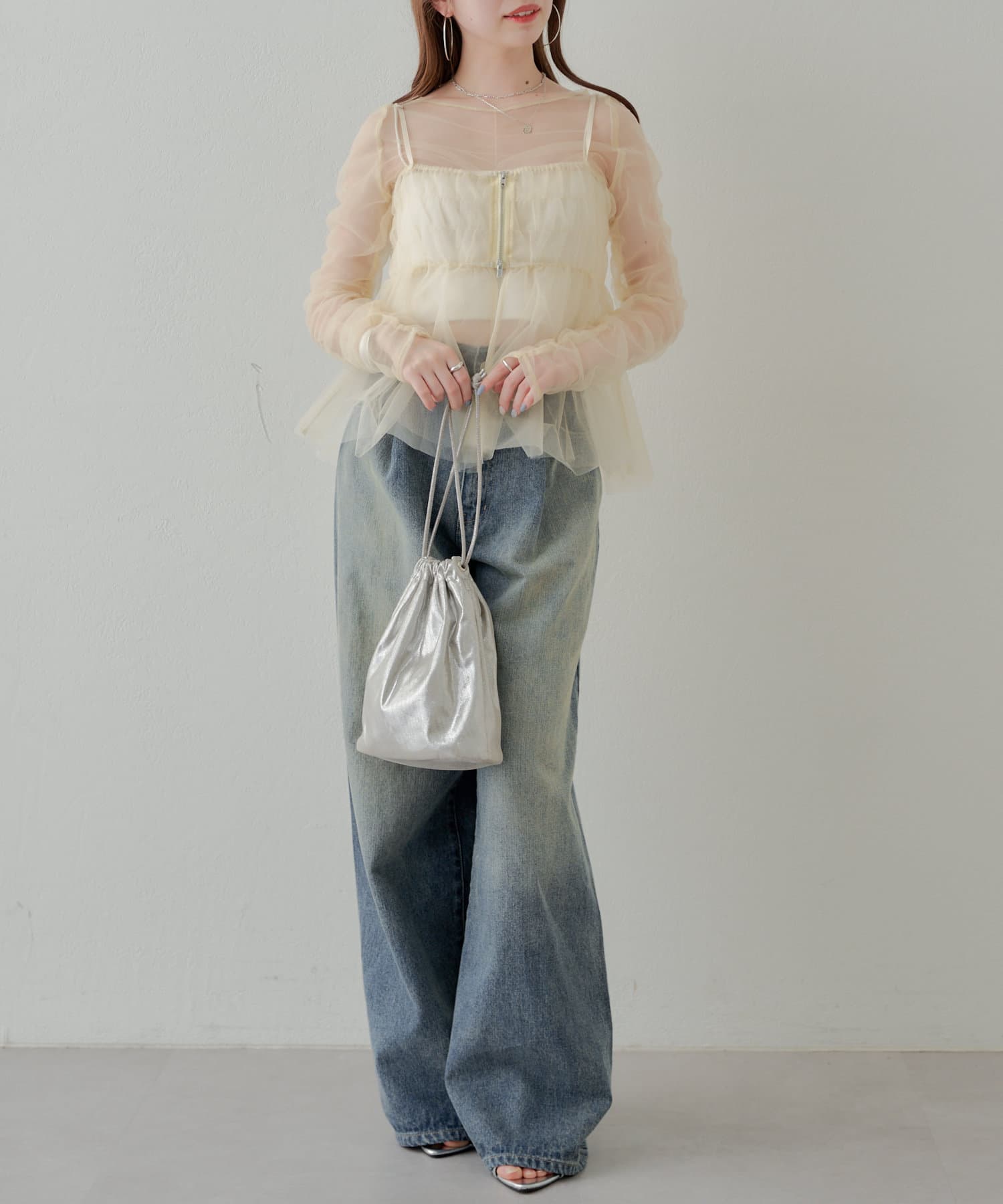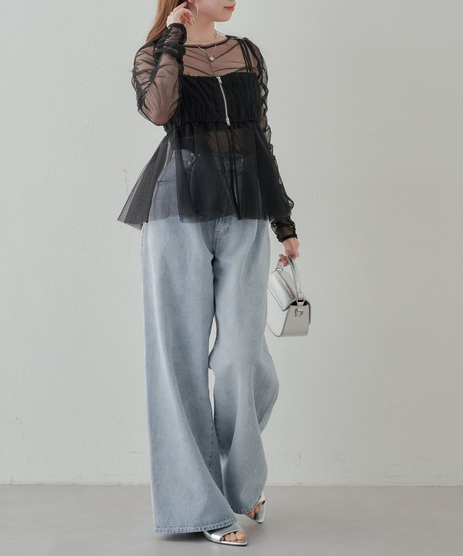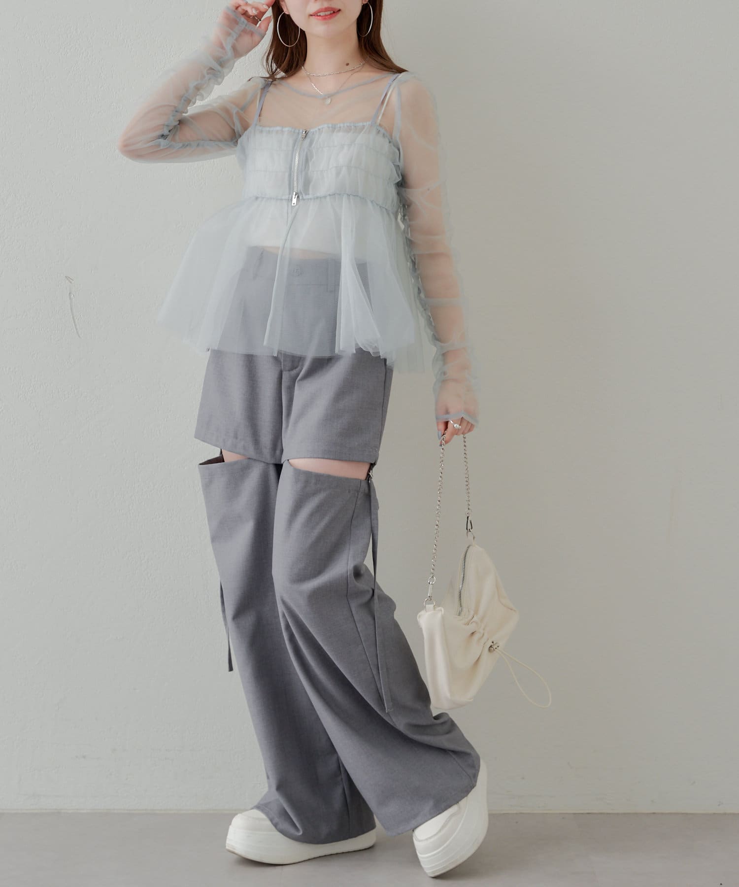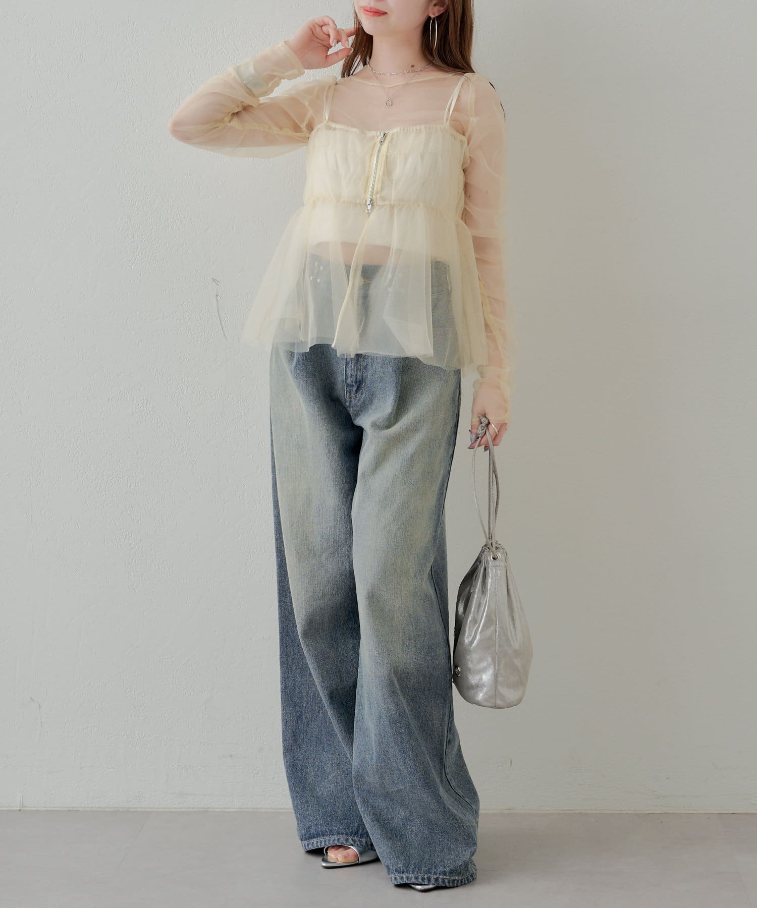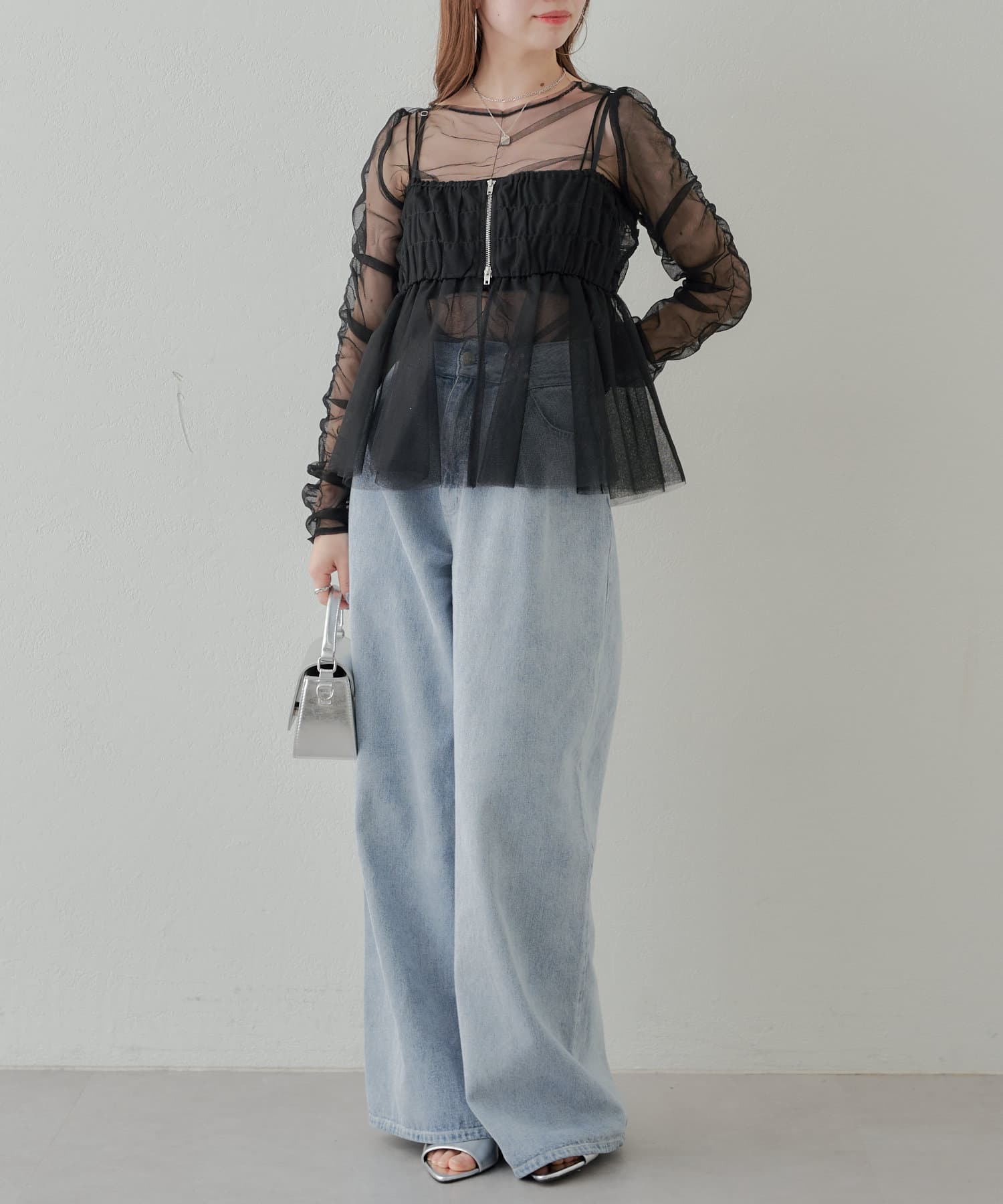 華やかなチュールキャミとシアートップスのセットアイテム