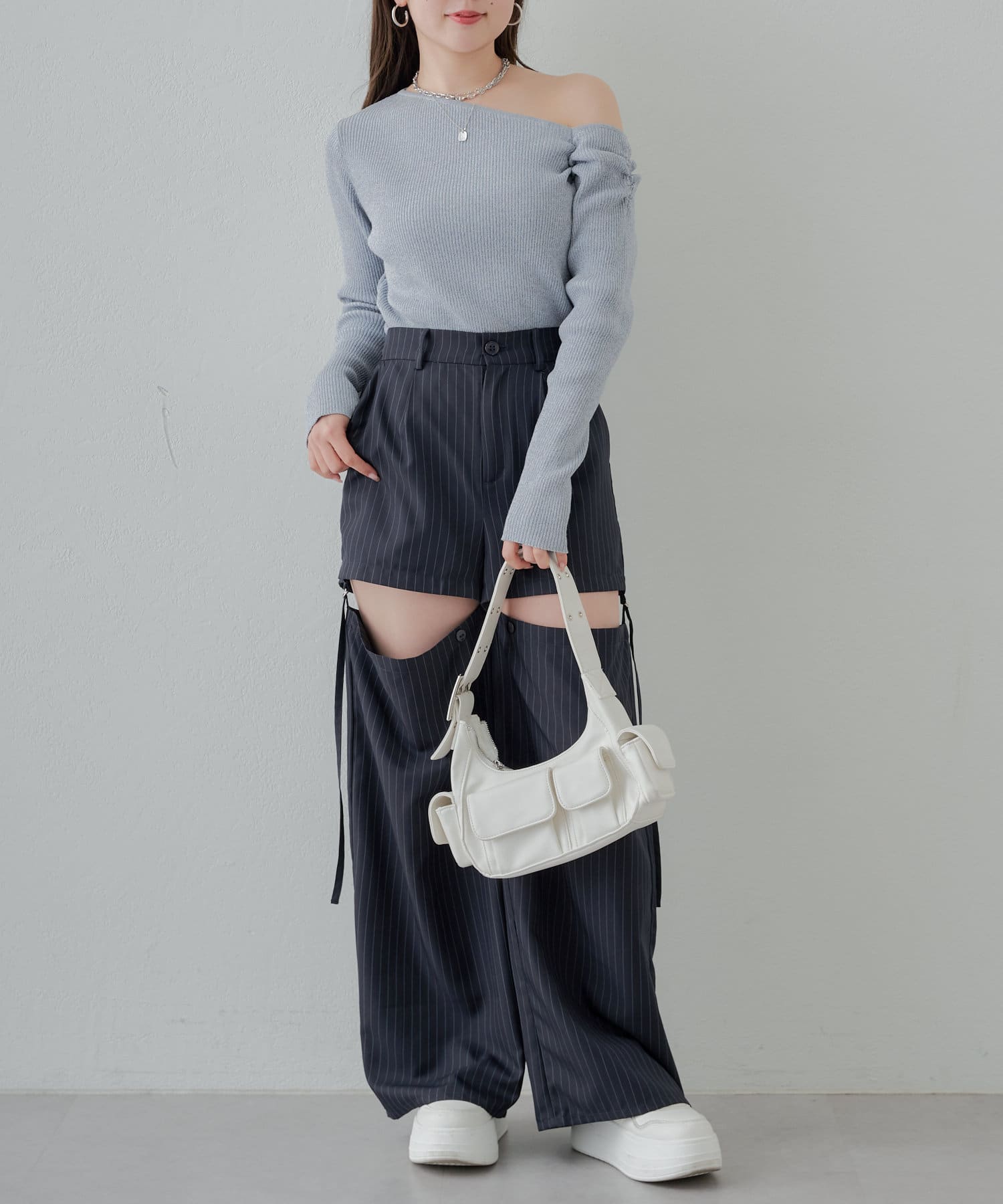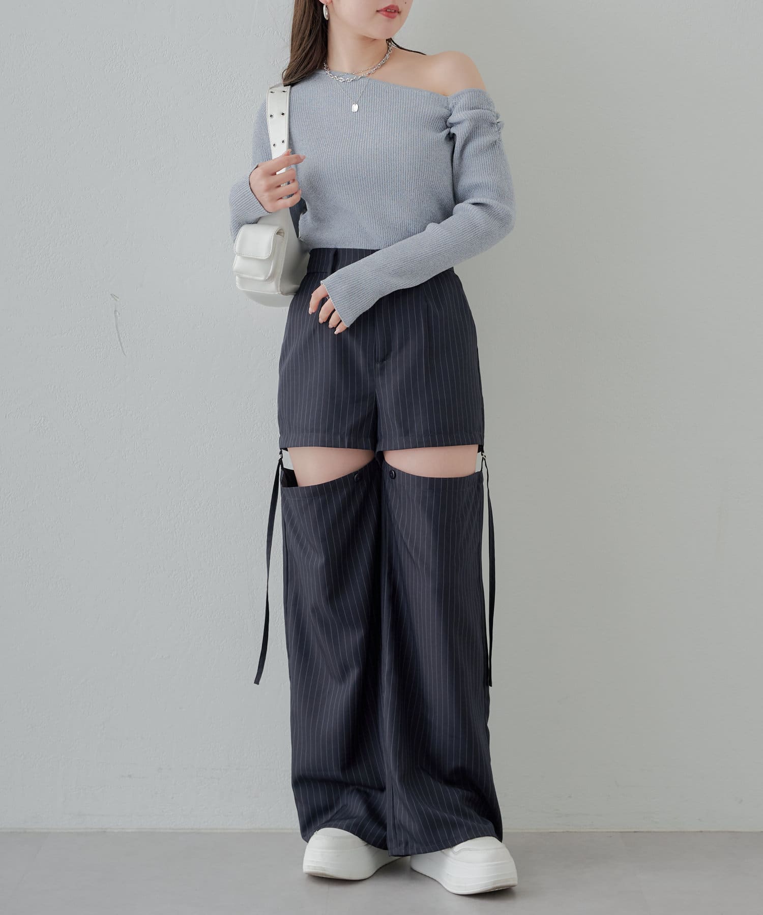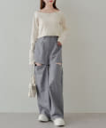 ・オフショルトップスなどフェミニンなトップスと合わせるのも◎
