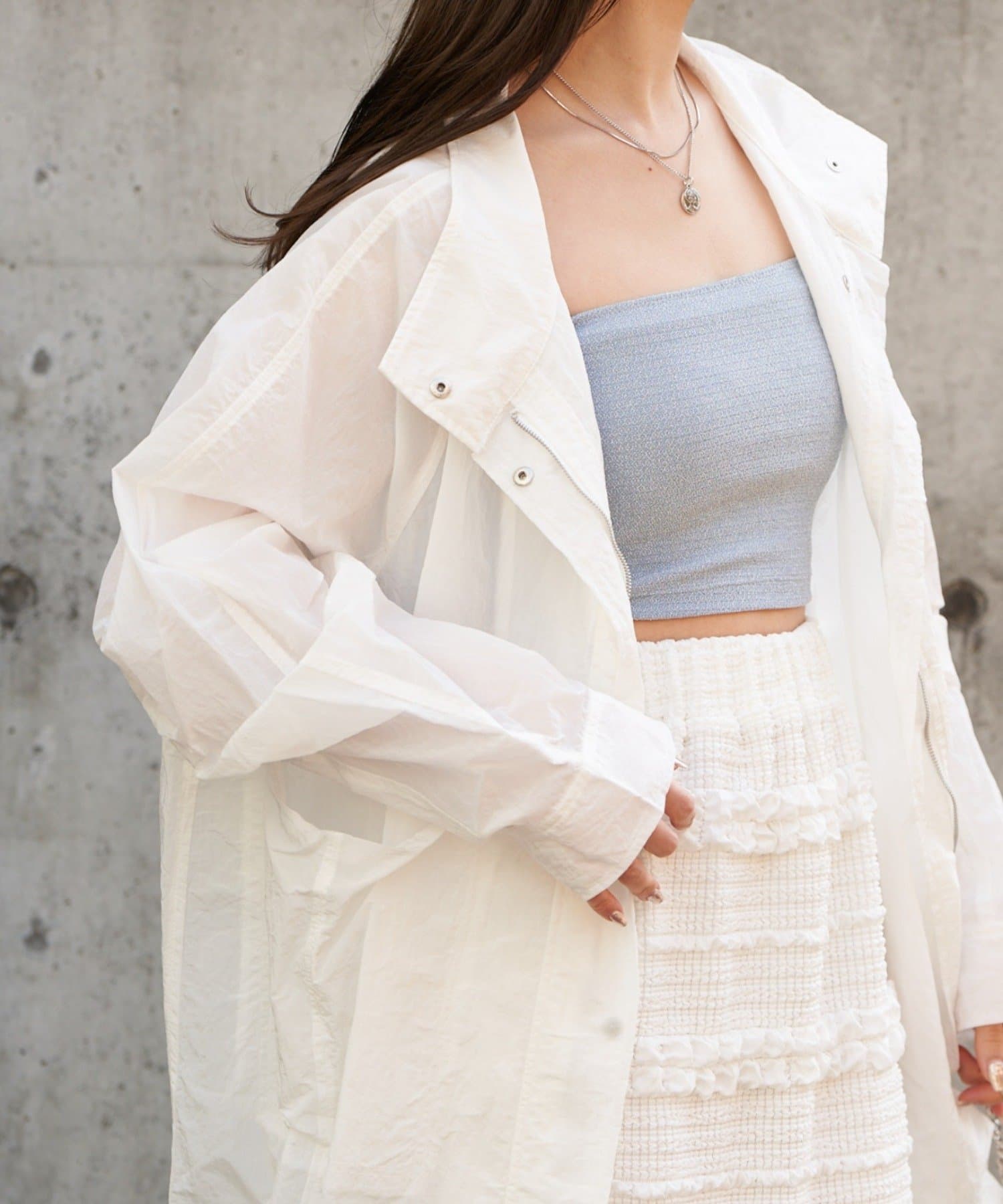 ・軽い素材で着やすく、シアー素材が春らしい抜け感を演出。