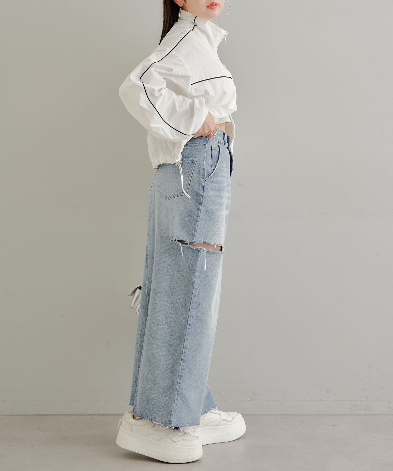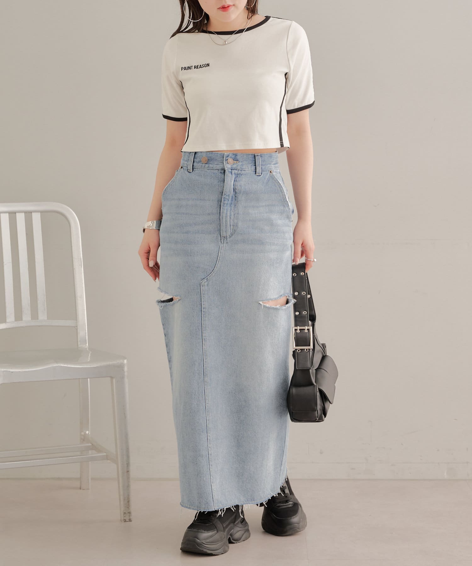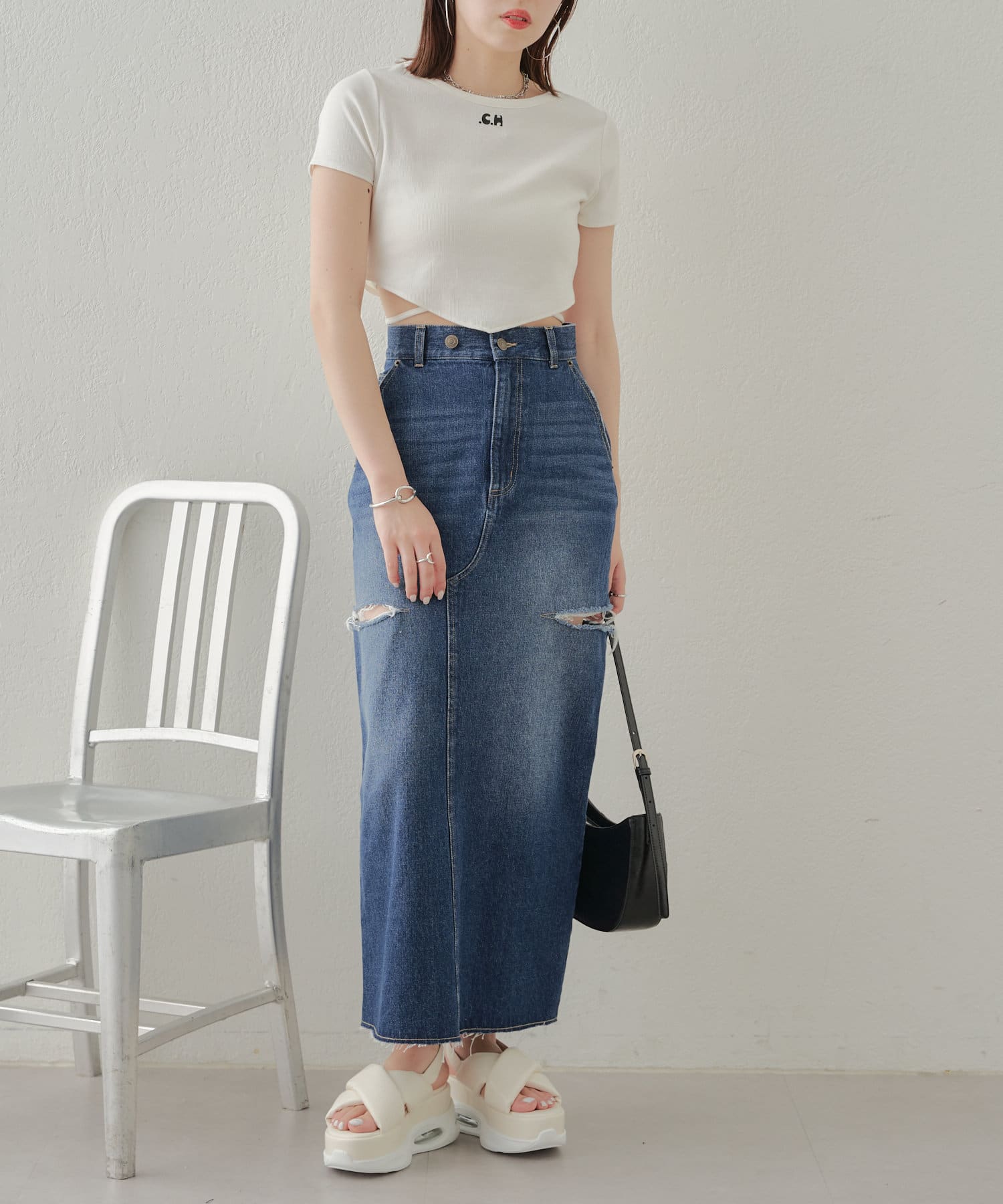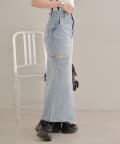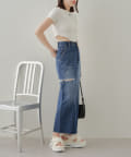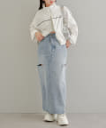 ・デニムのロングボトムなのでトップスは軽めなシアーやチュール素材を合わせるとバランスが取れます。