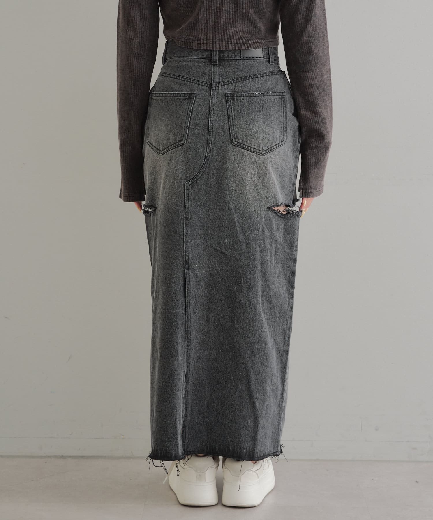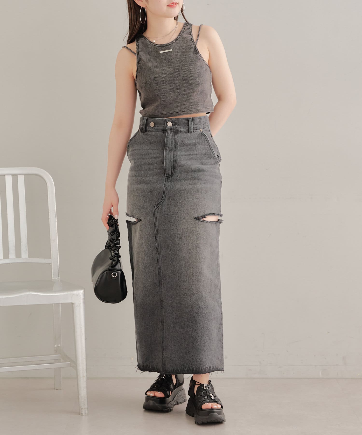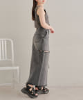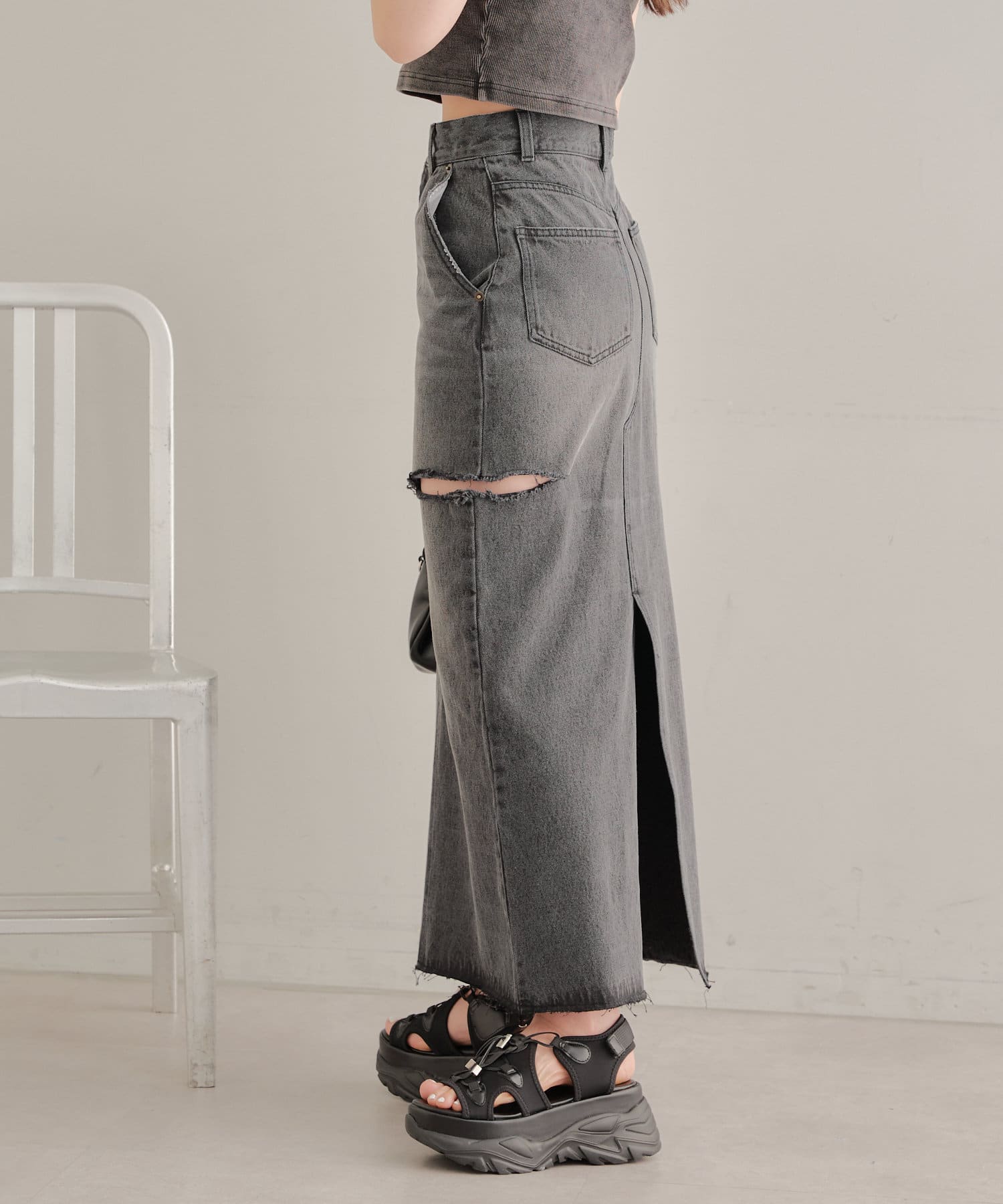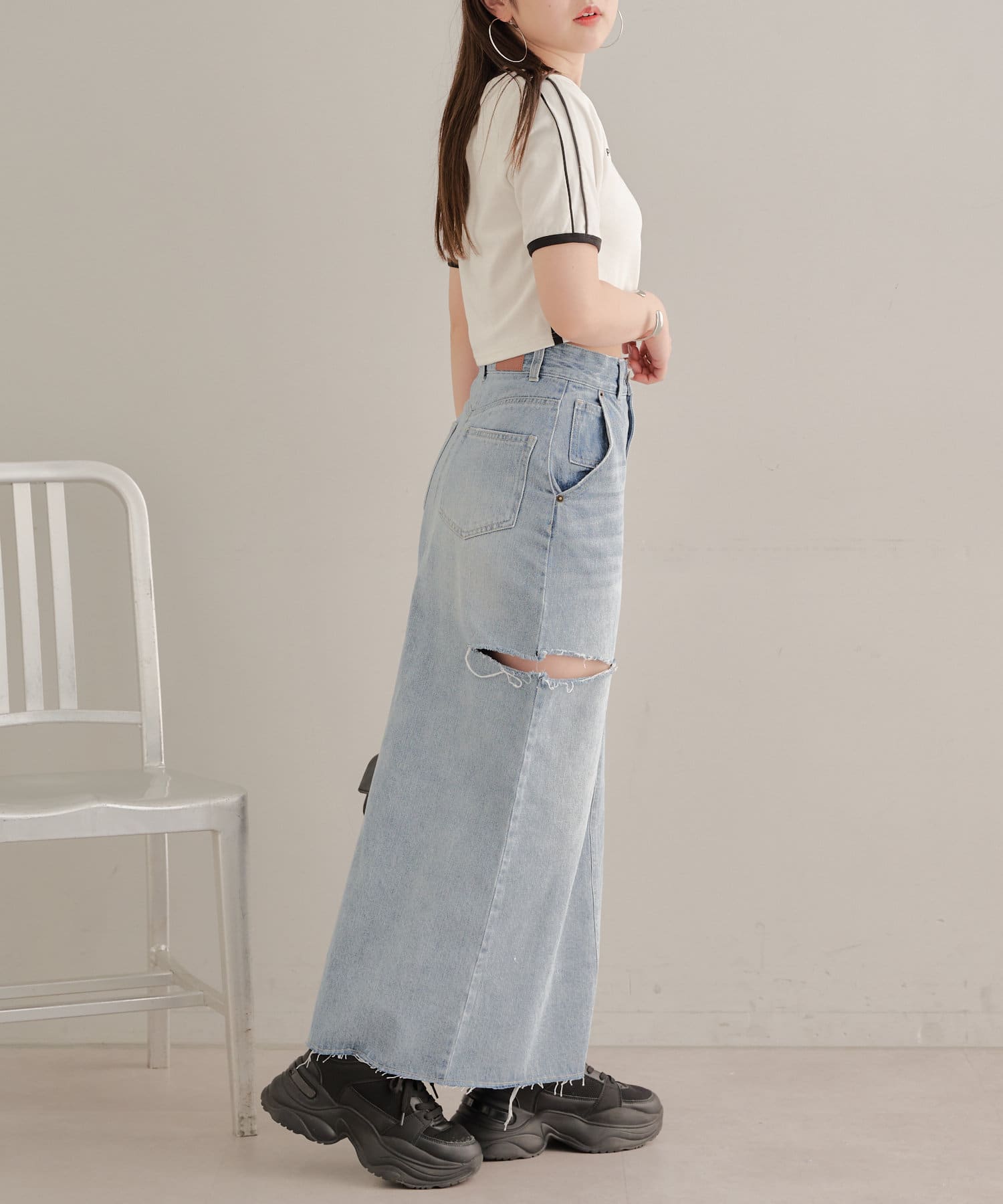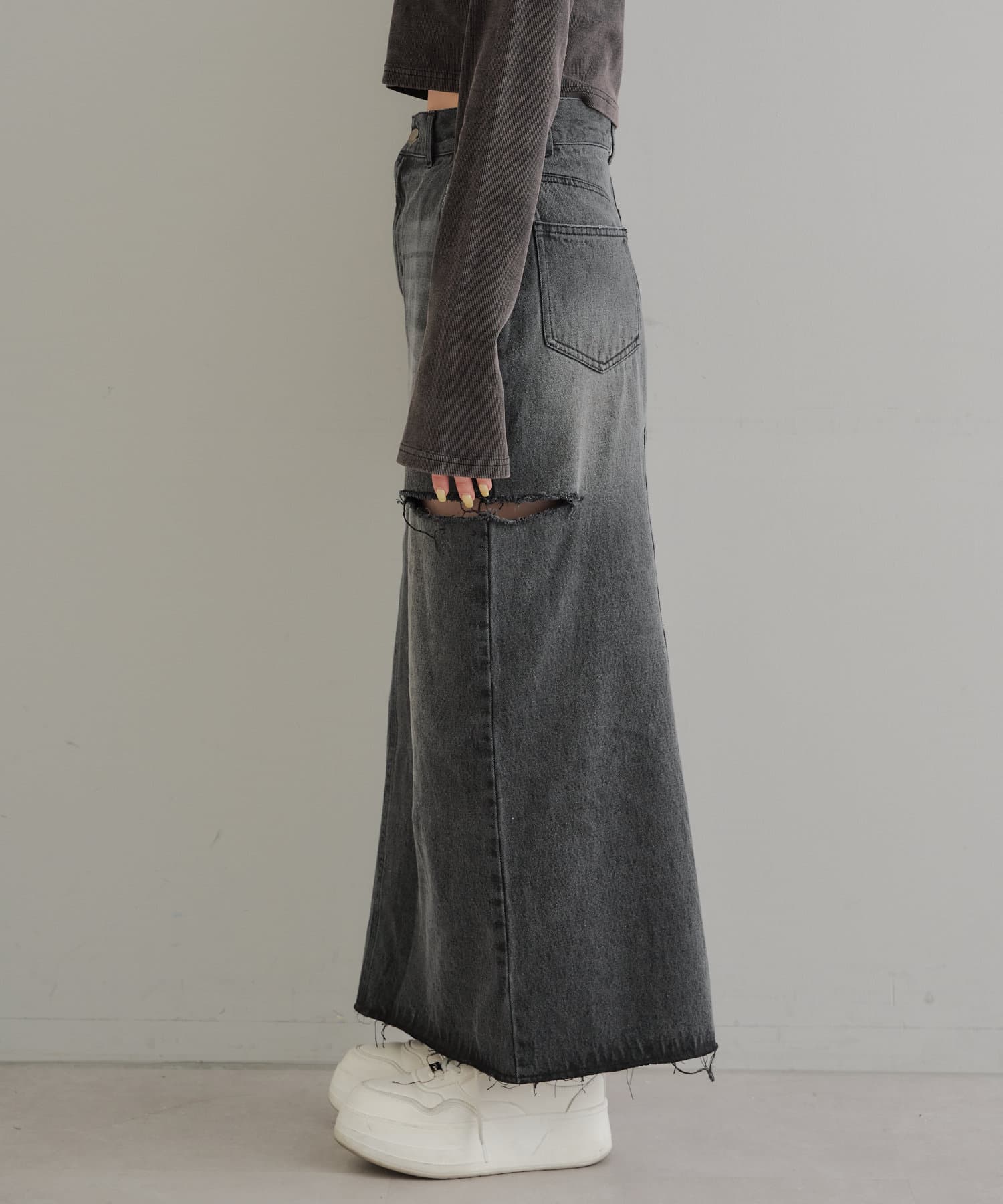 ・ロングスカートでもサイドスリットの程よい肌見せがコーデに抜け感をプラス。