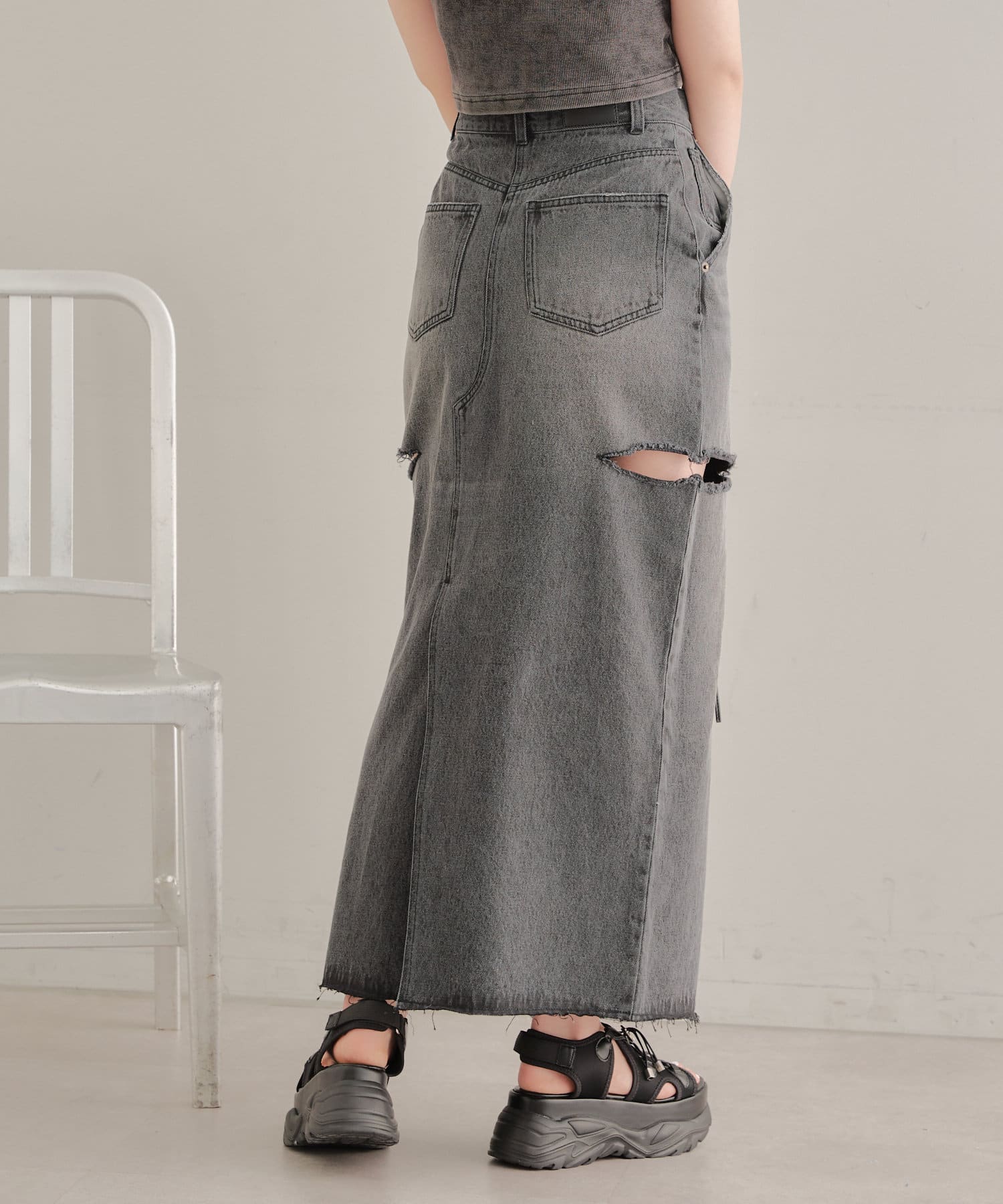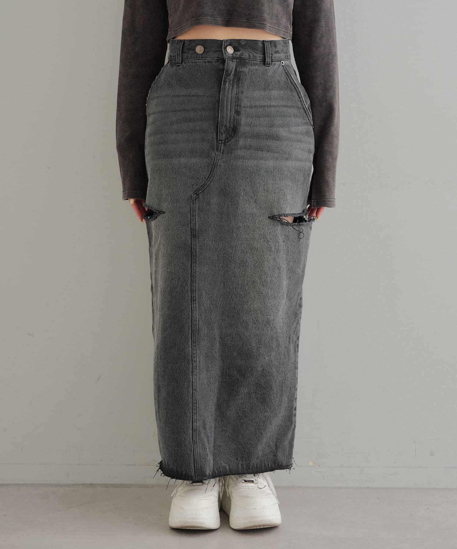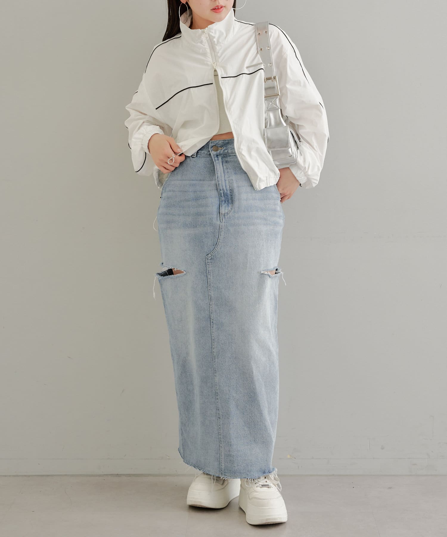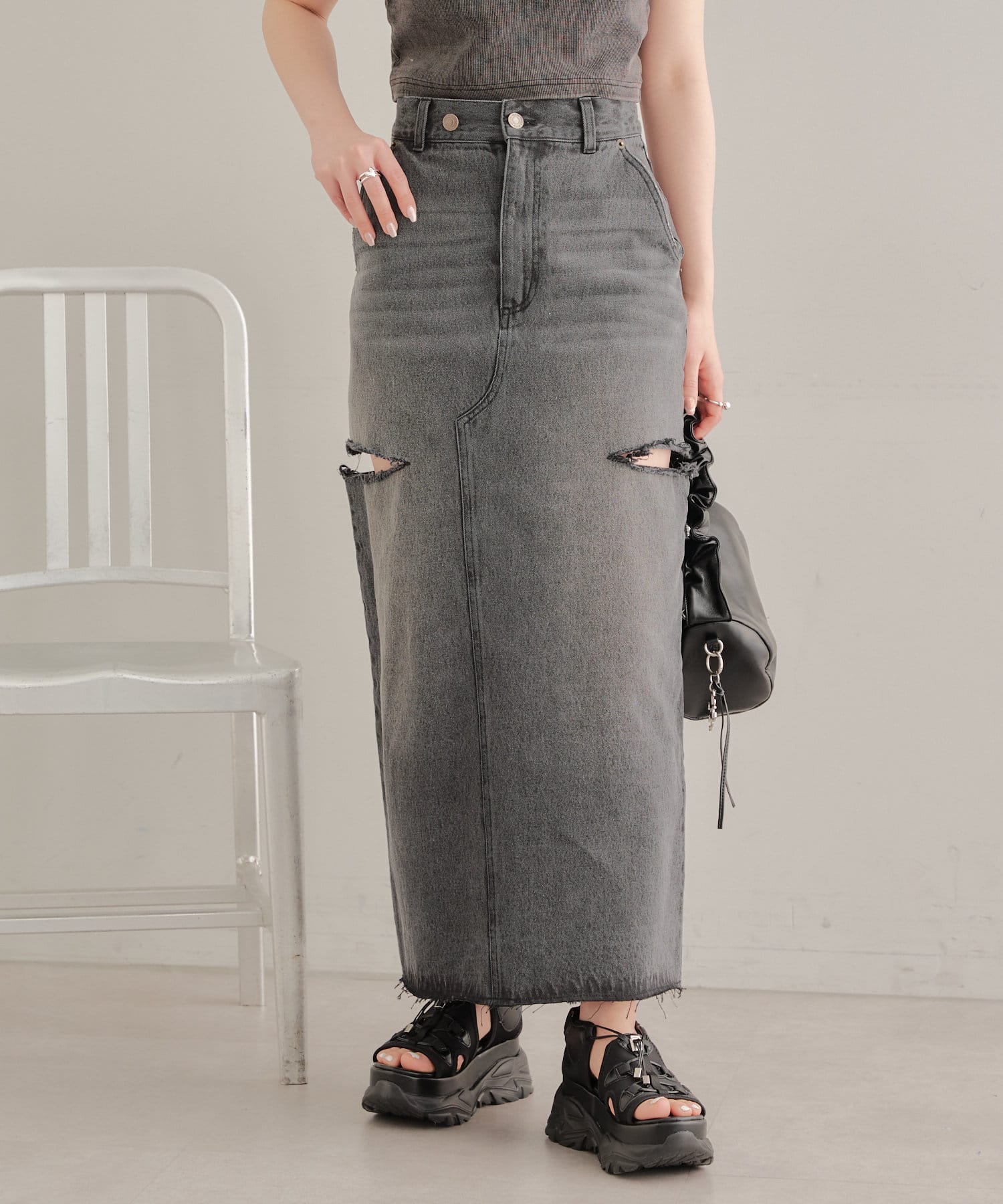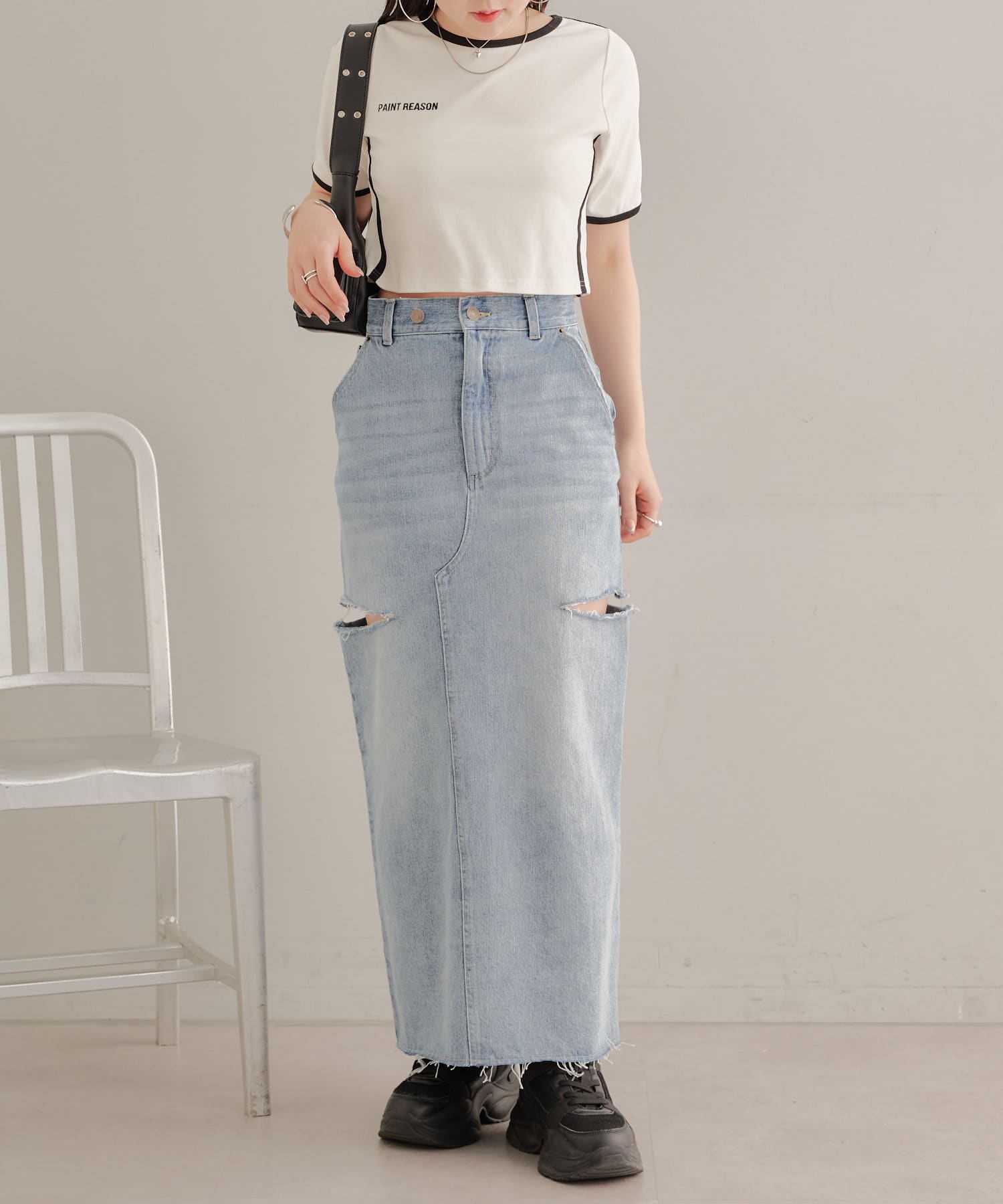 ・ロングスカートでもサイドスリットの程よい肌見せがコーデに抜け感をプラス。