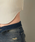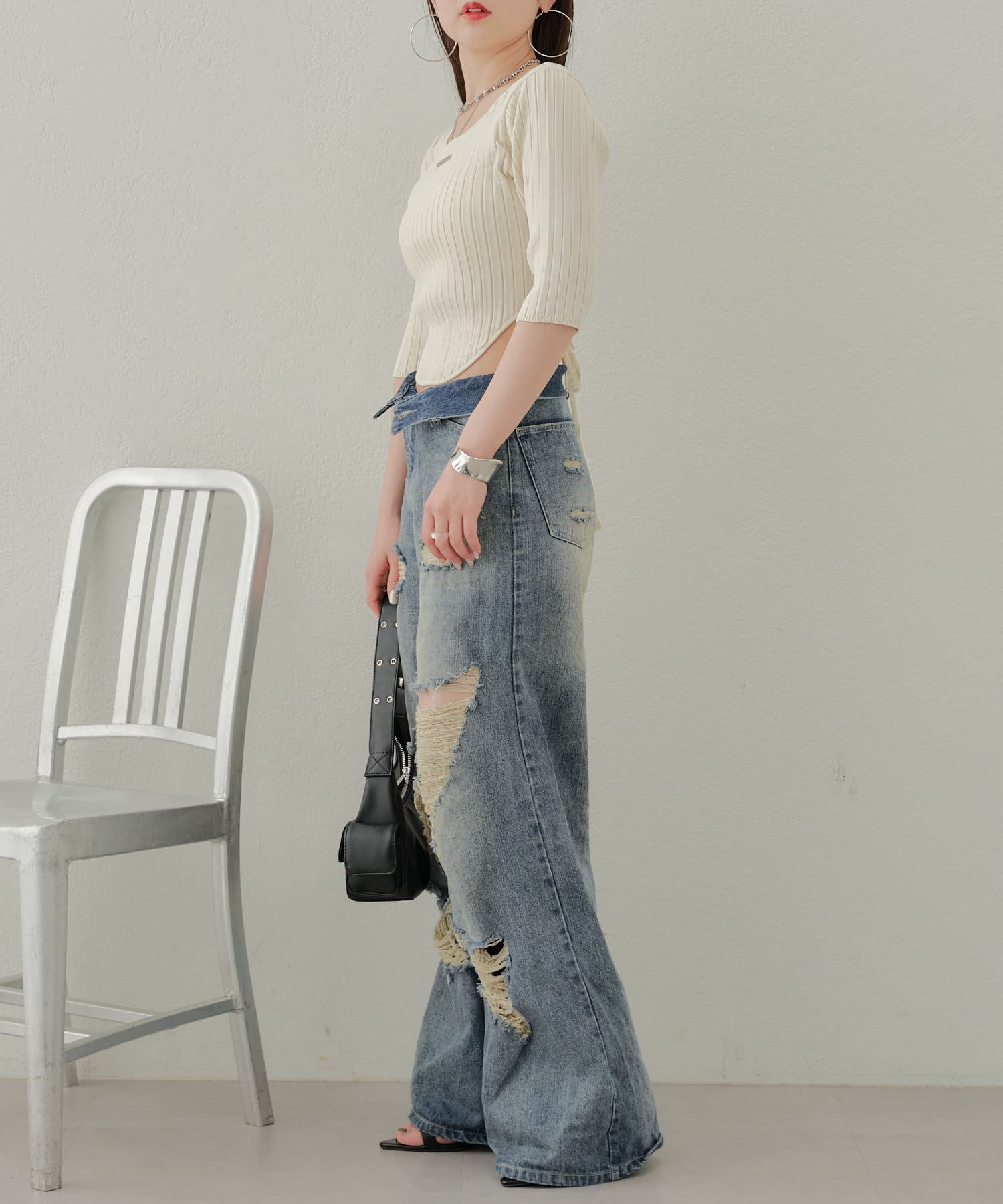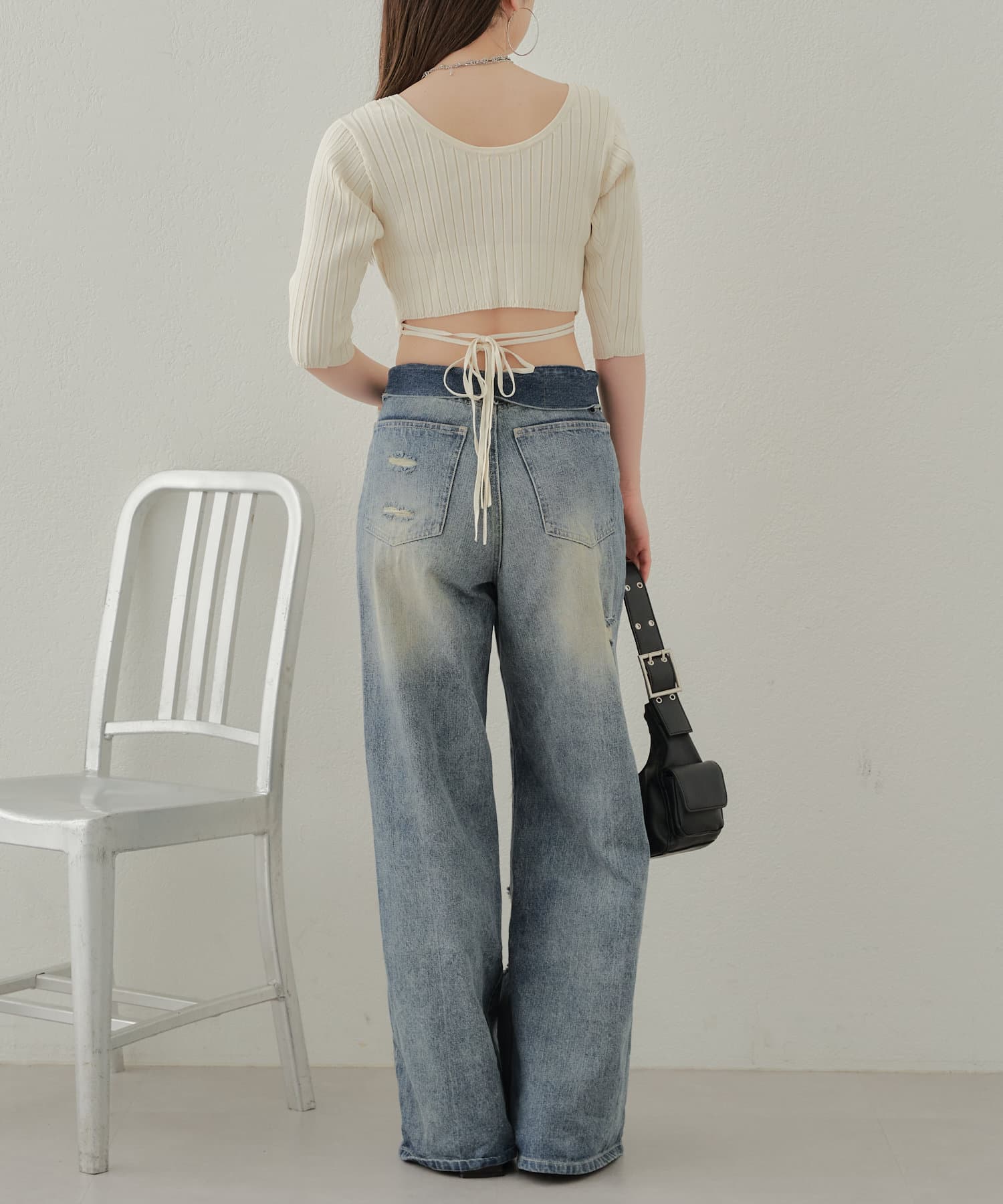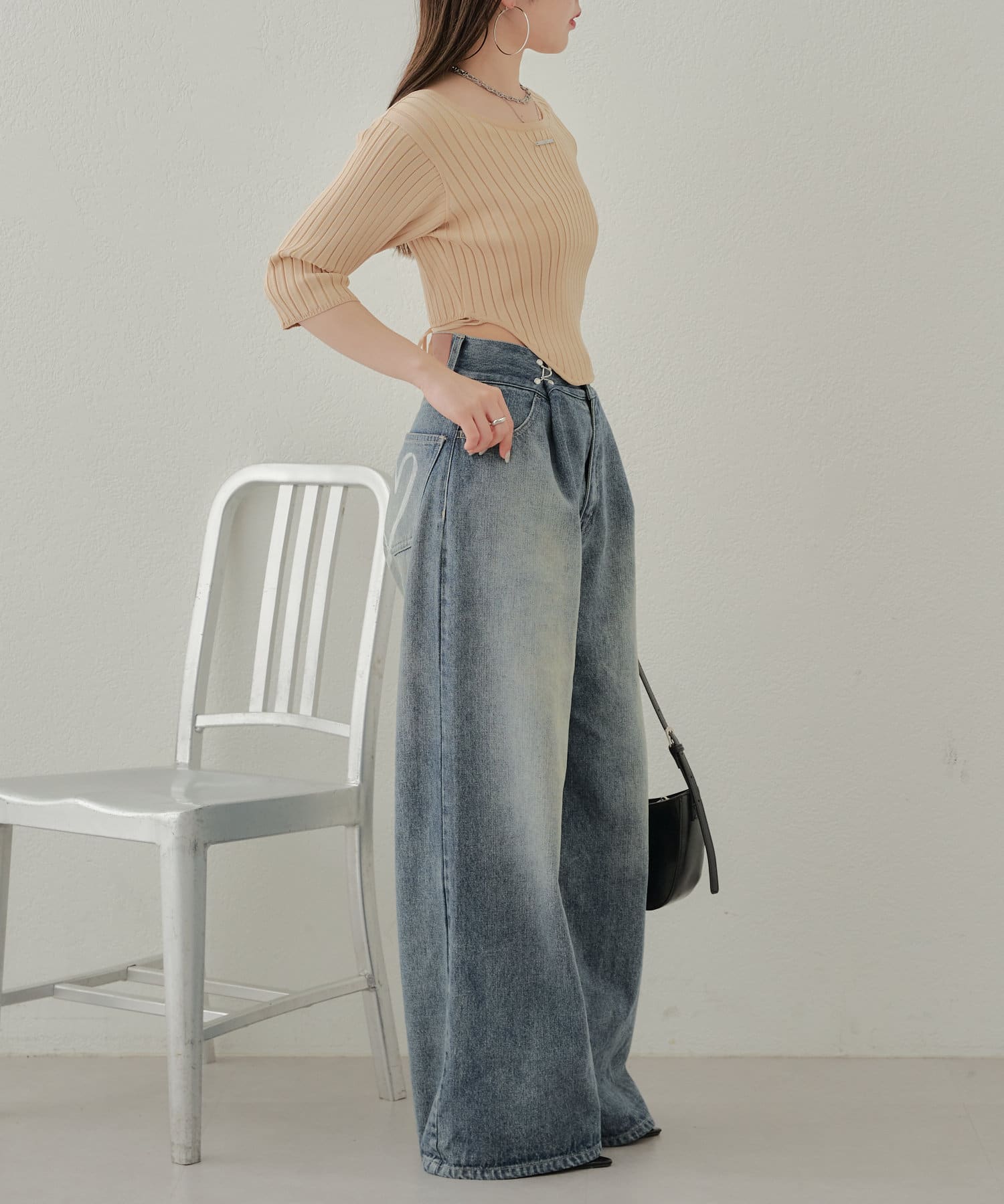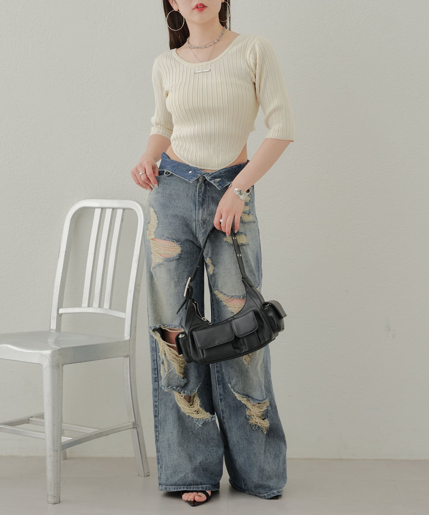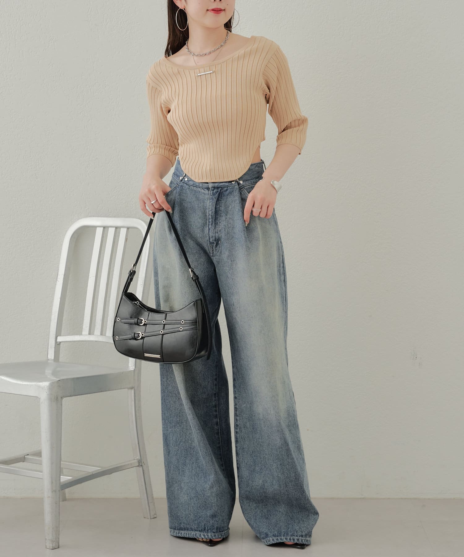 ・ローウエストボトム合わせやハイウエストデニムの口を折ることでたっぷりとラウンドデザインを見せて着るのが人気です。