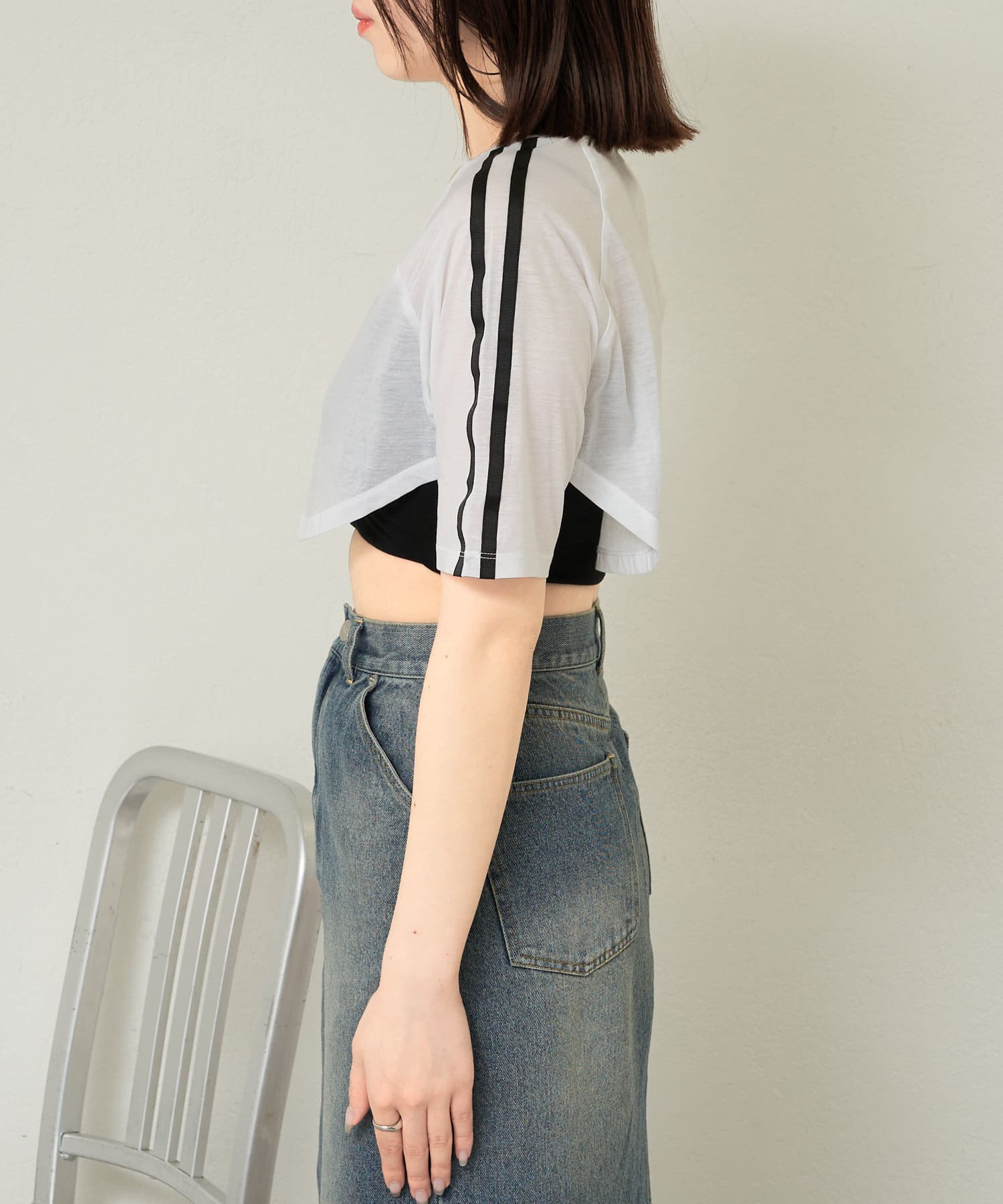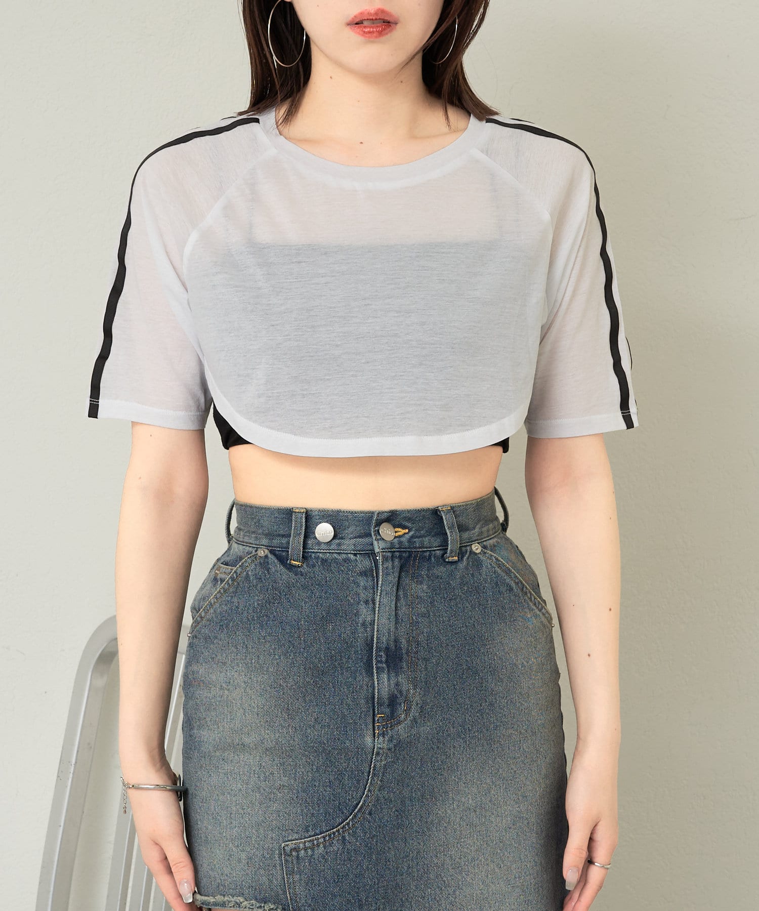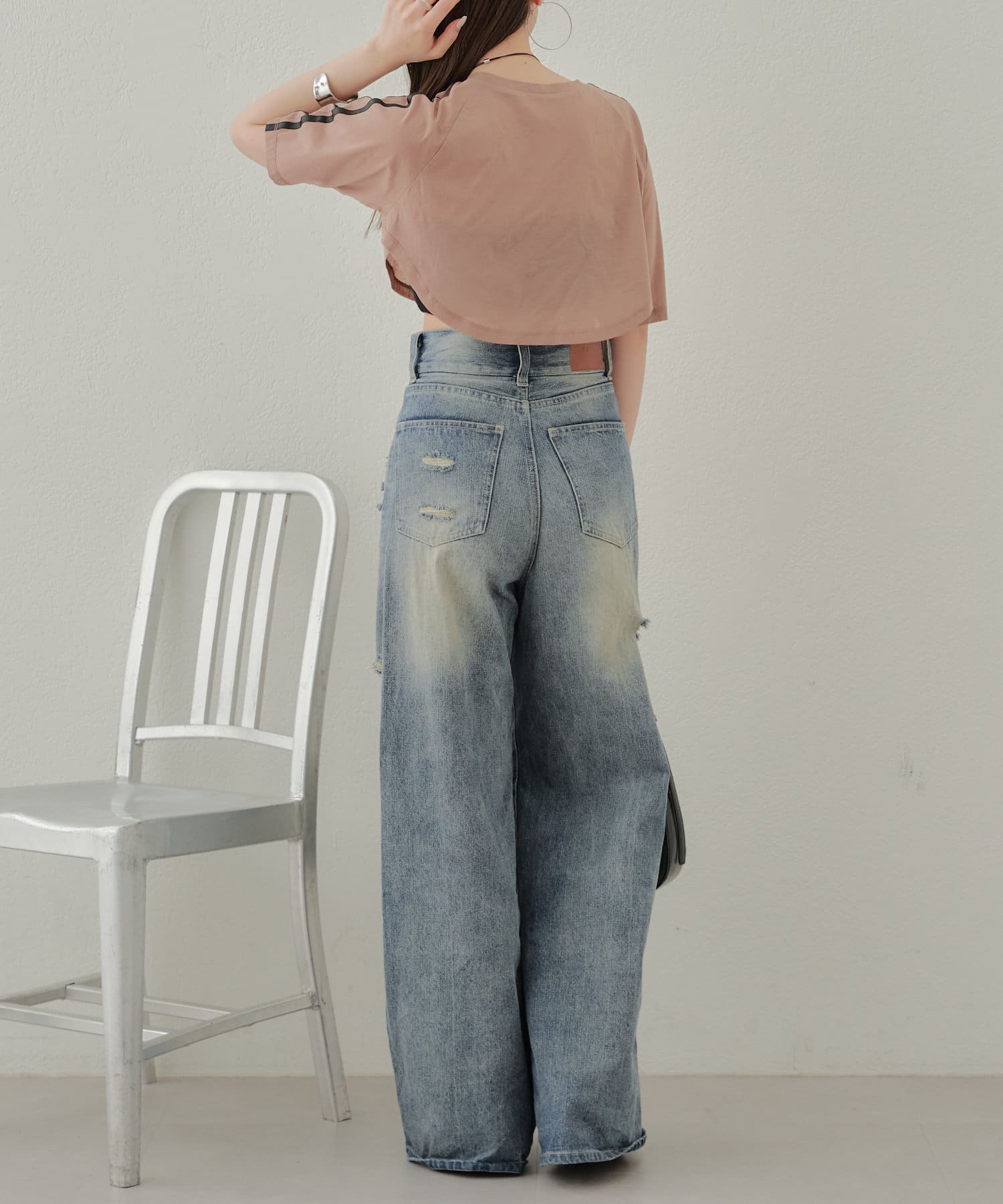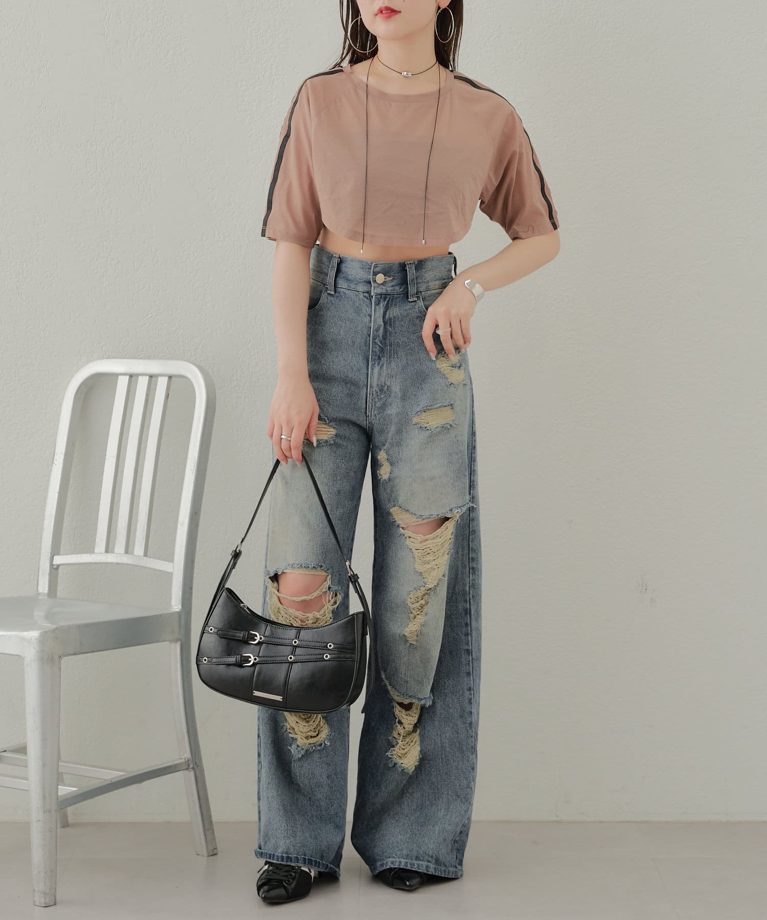 ・ハイウエストデニムにインナーも短丈をチョイスした肌見せコーデがおすすめ。