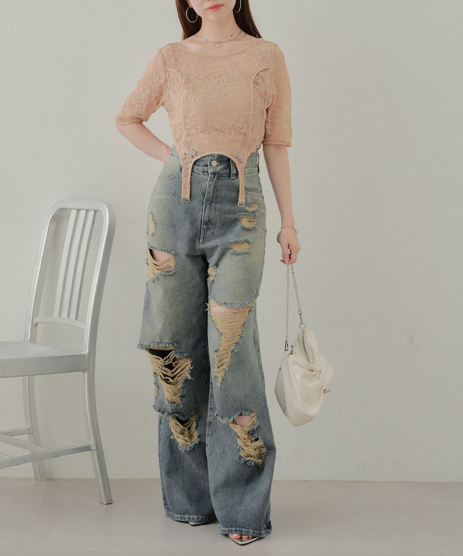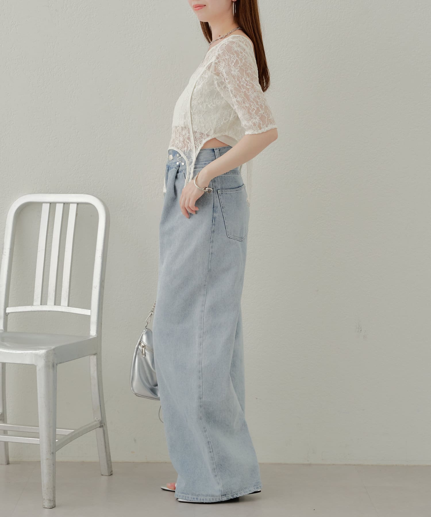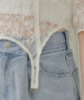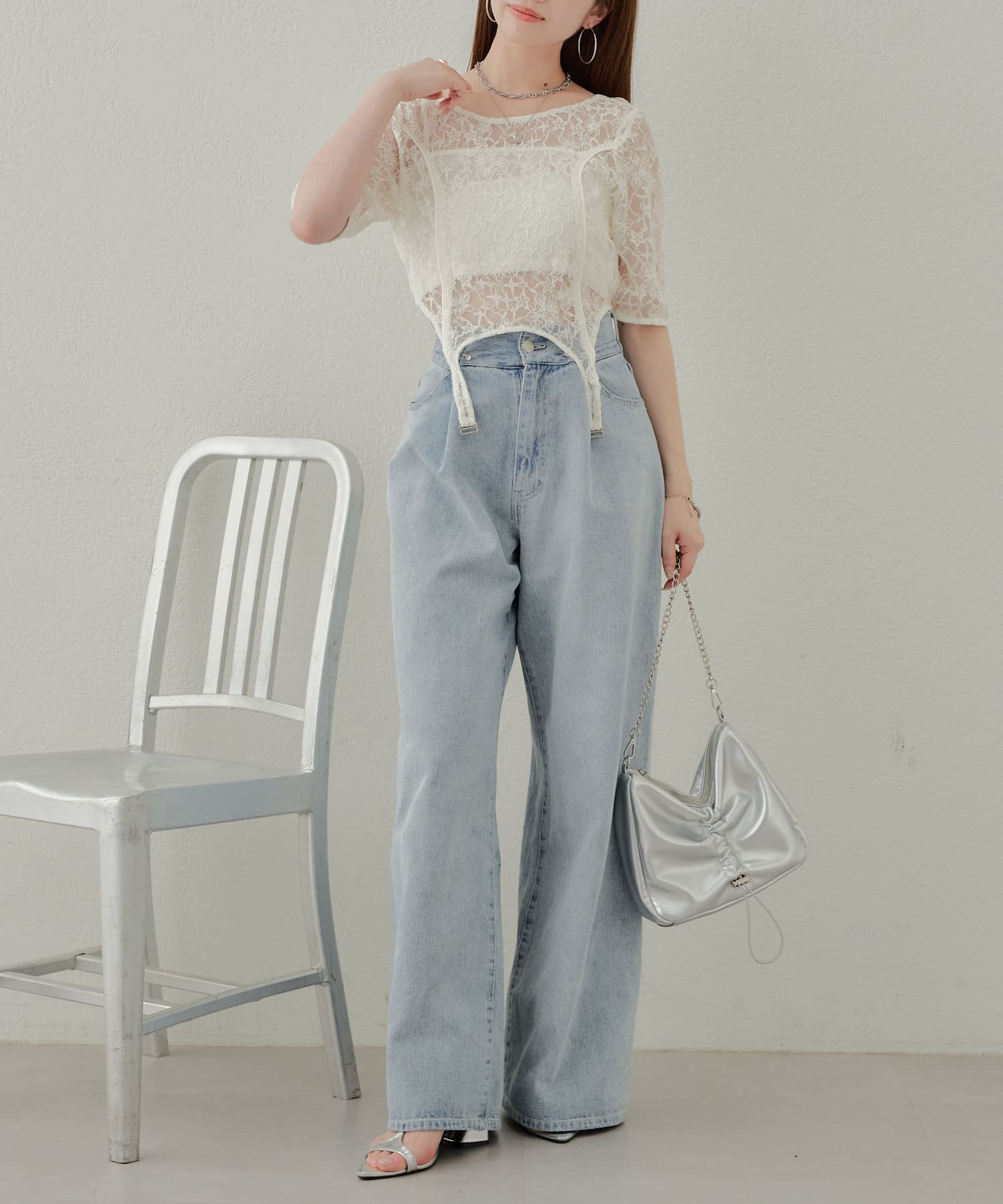 ・トレンドのレーシーアイテムはカジュアルなワイドデニムやスポーティーボトムとの合わせが好相性◎