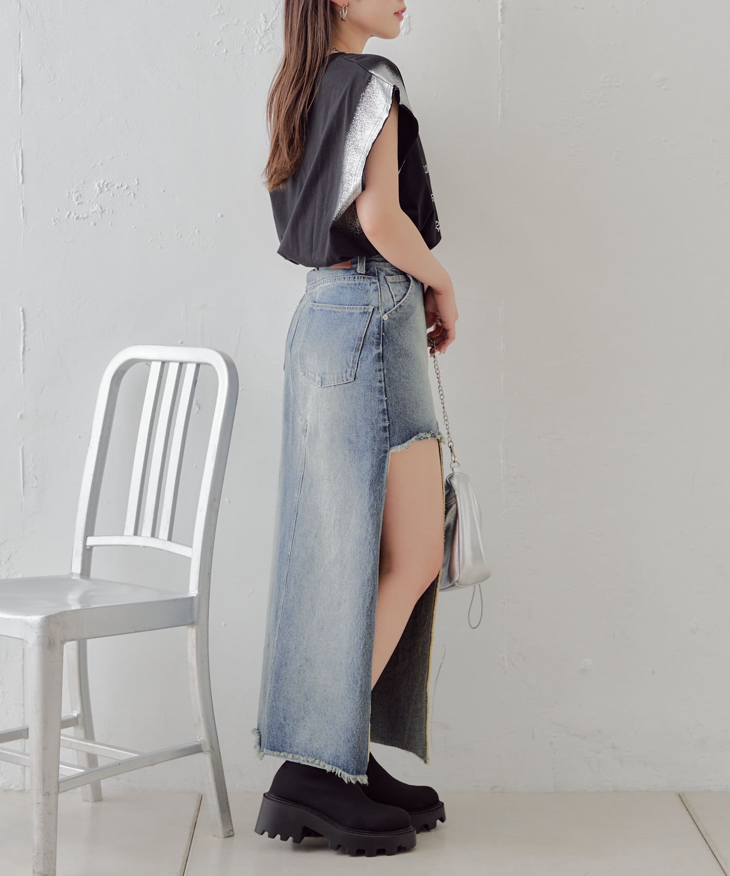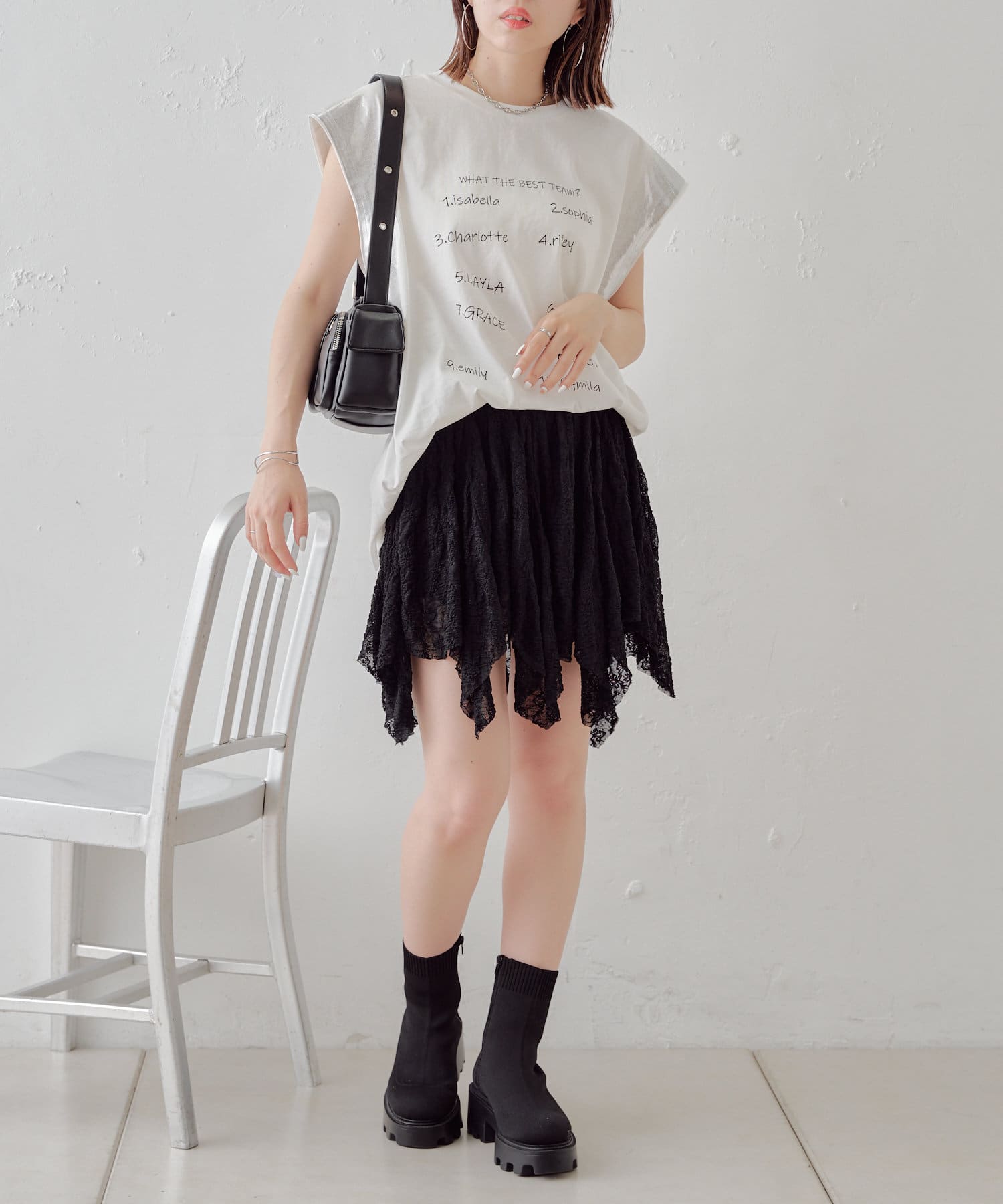 ・カジュアルなノースリTシャツはスカート合わせで女性らしさをプラスするのがおすすめ。
