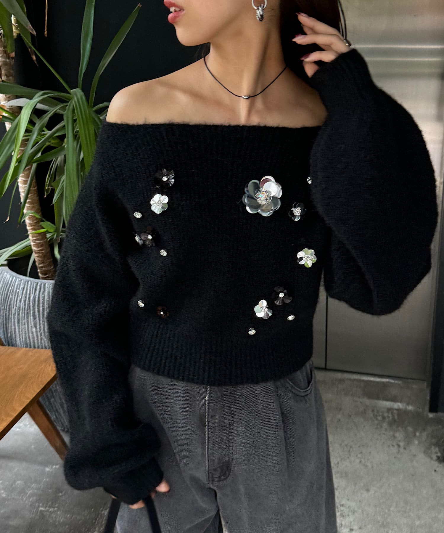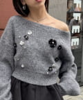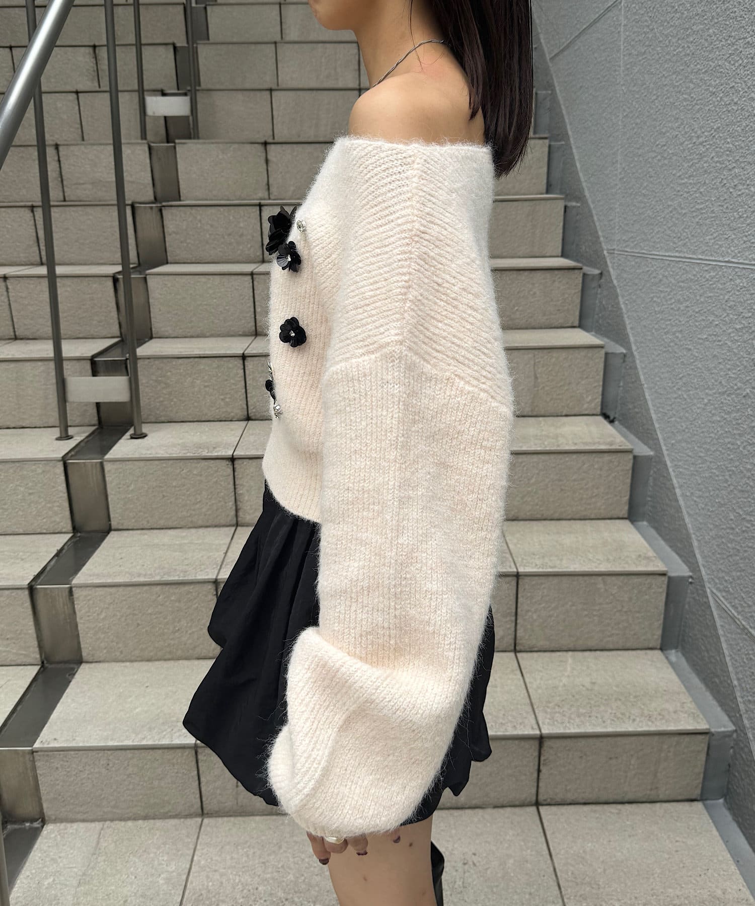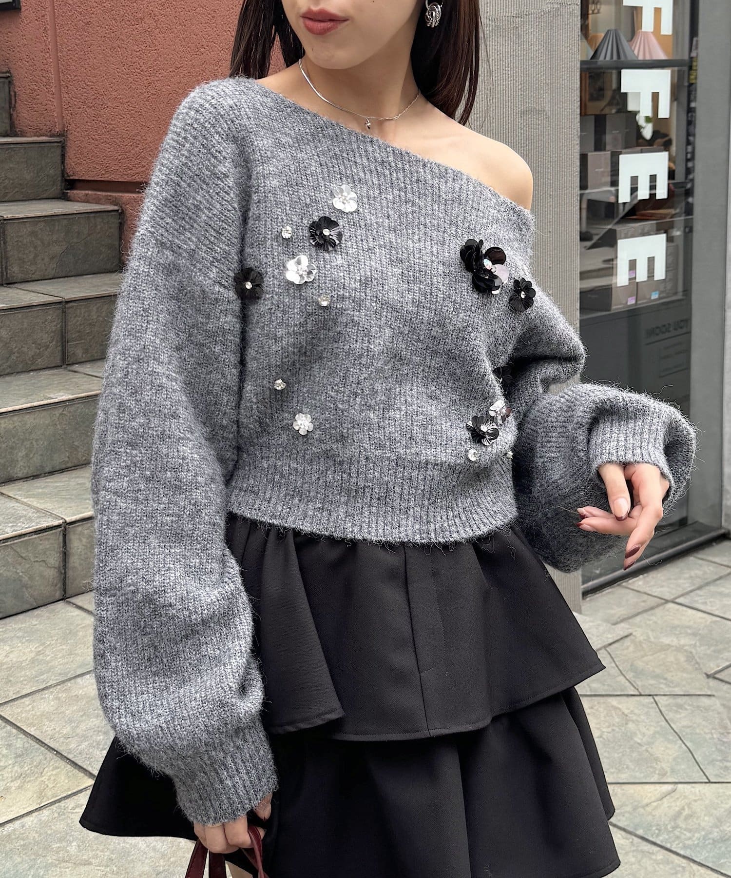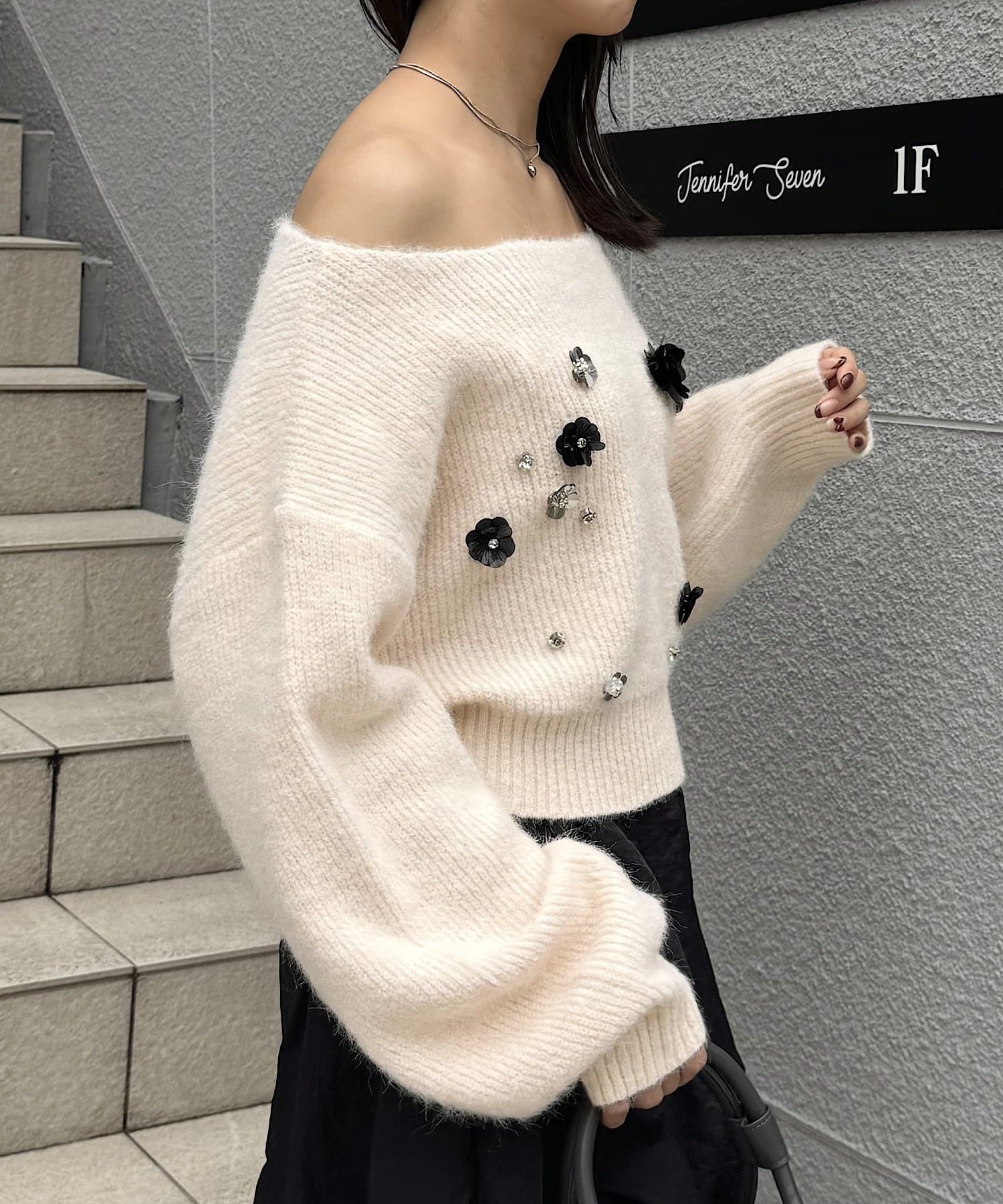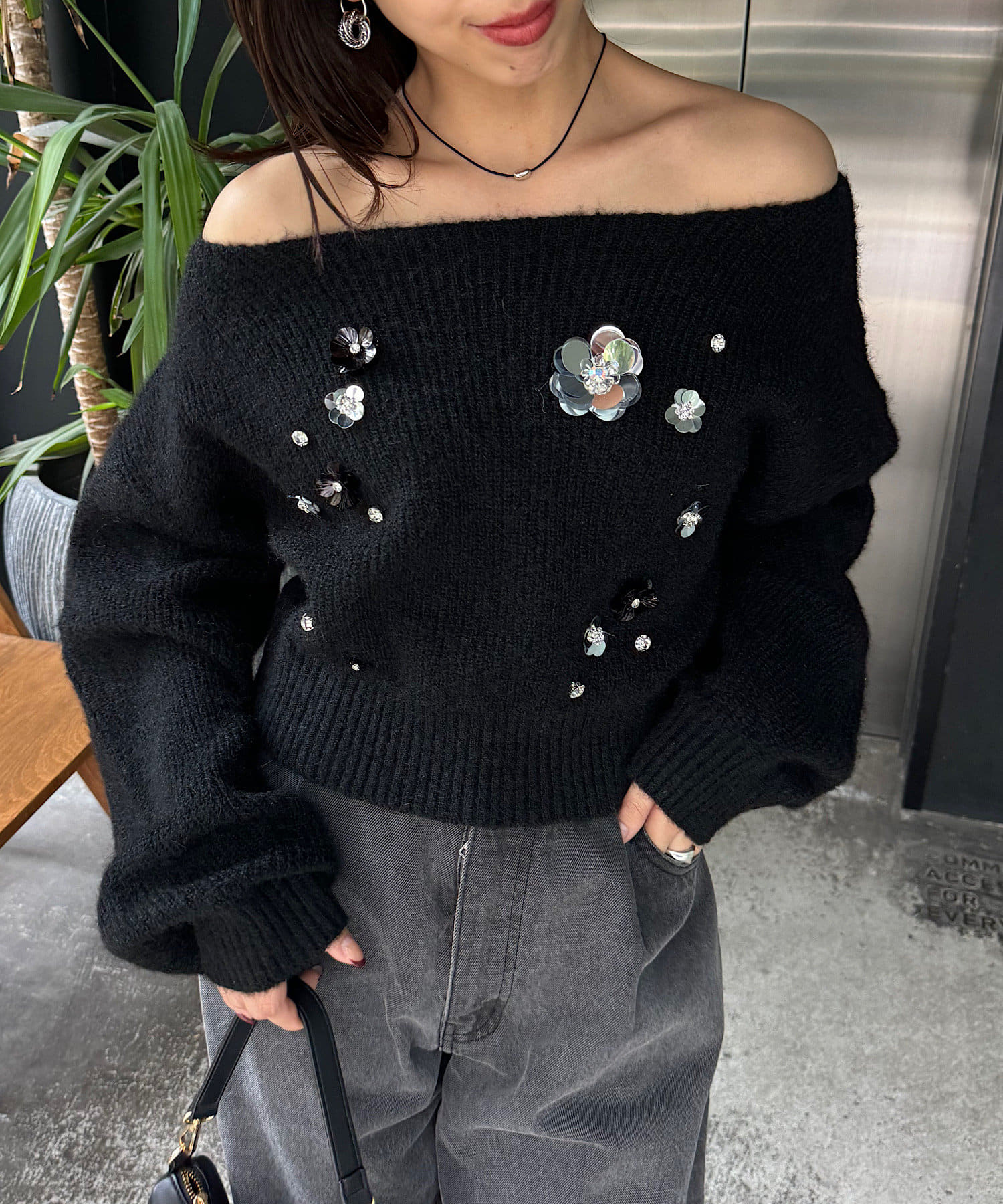 フラワービジューが目を惹くオフショルモチモチニット♡