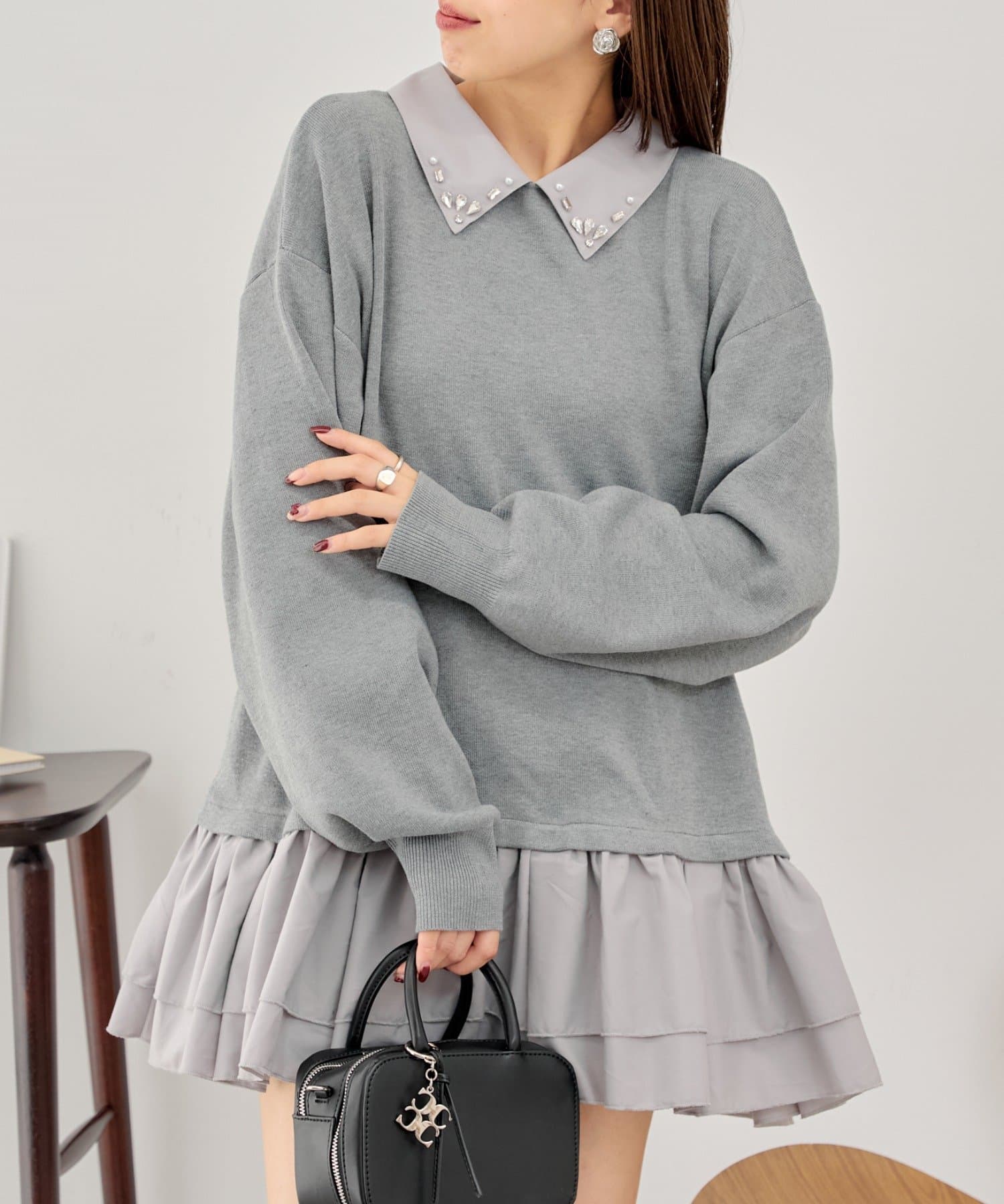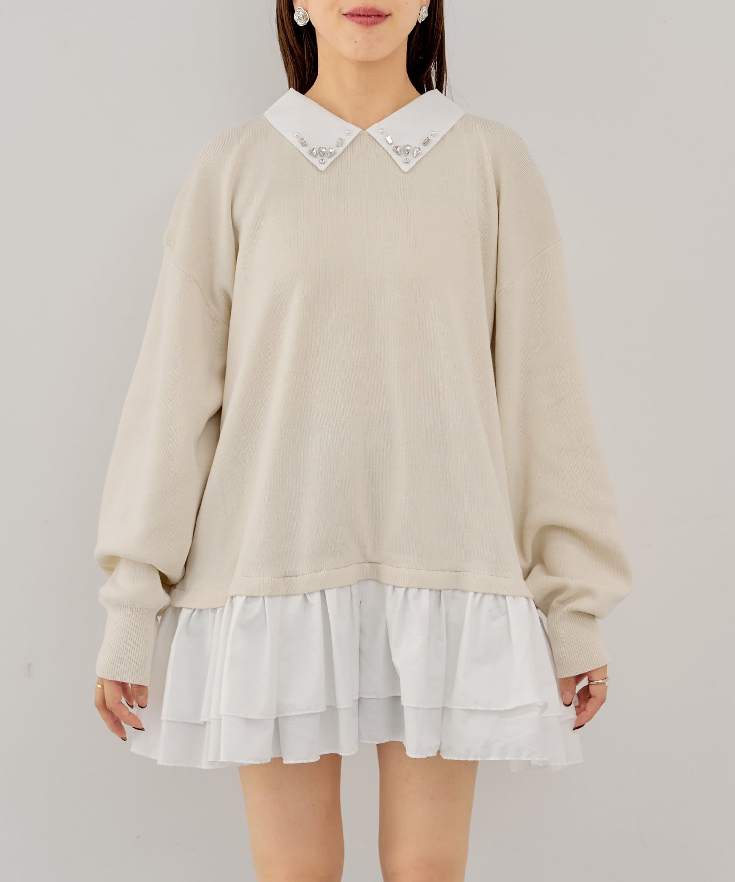キラキラのビジュー襟と裾部分のフリルが可愛いミニワンピース♡